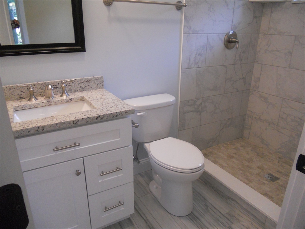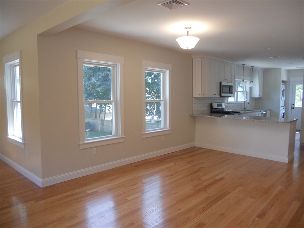 Top Floor, Open Floor Plan with a Loft Like Feel. Completely Renovated. Luxury Residential Unit with Attention to Detail and Craftsmanship. This Apartment Features Include Island Kitchen with GE Stainless Steel Appliances, Granite Counters, Sun Splashed Living Room, Recessed Lighting, Closet and Large Picture Window, Natural Wood Floors Throughout, Master Bedroom with Generously Sized Closet and Private Bathroom with Vanity. Washer and Dryer in Unit, Central Air Conditioning, Energy Efficient Gas Heating System, Two Beautifully Appointed Bathrooms, Large Deck with Yard, Professionally Landscaped, Storage in Basement, One Car Garage plus Additional Parking on Driveway, Near Routes 95/128/117/20, Mass Pike. Available Now, November 15 or December 1.