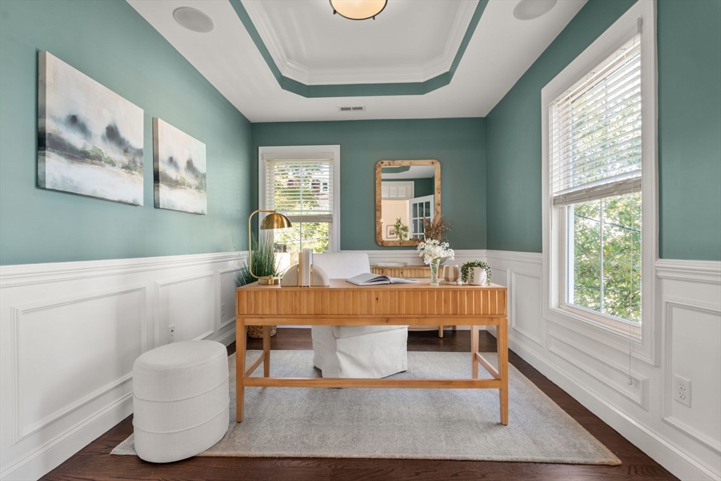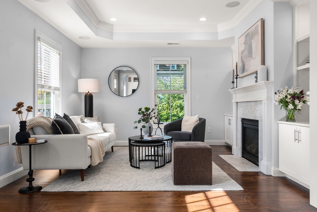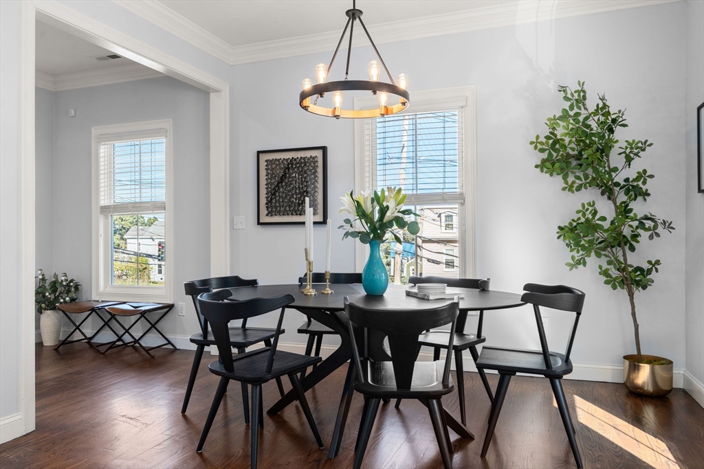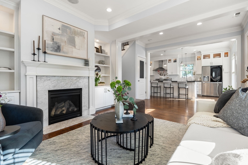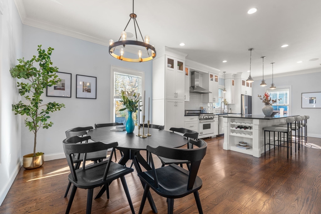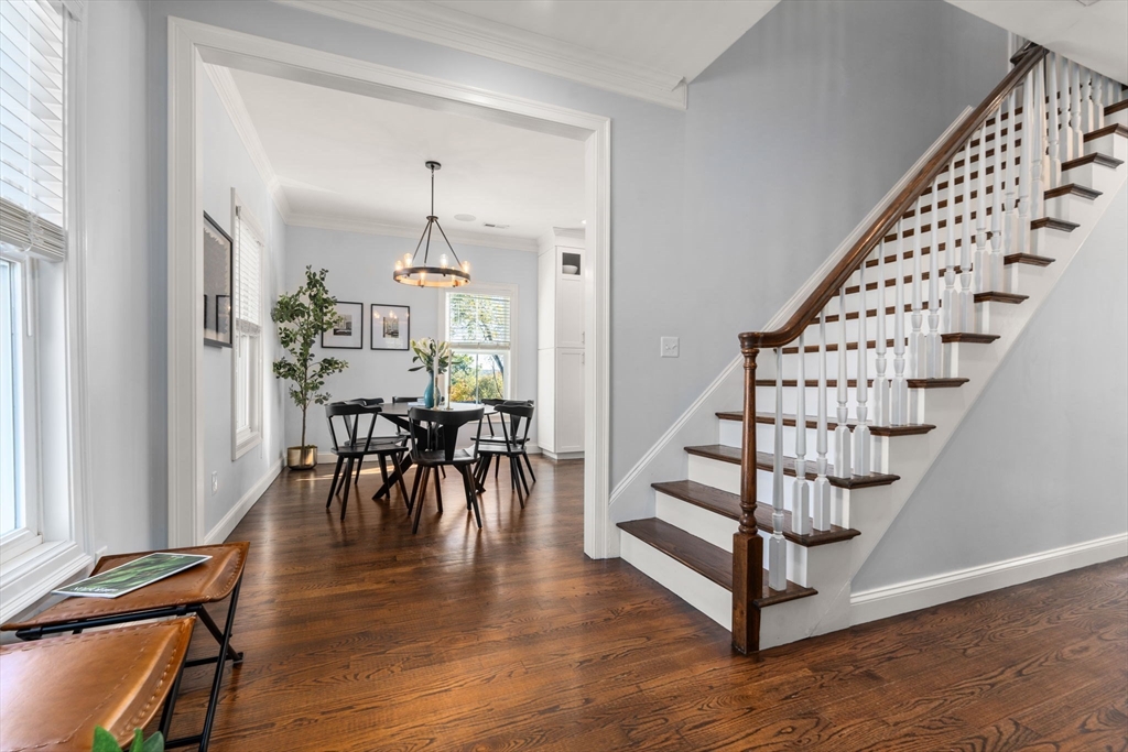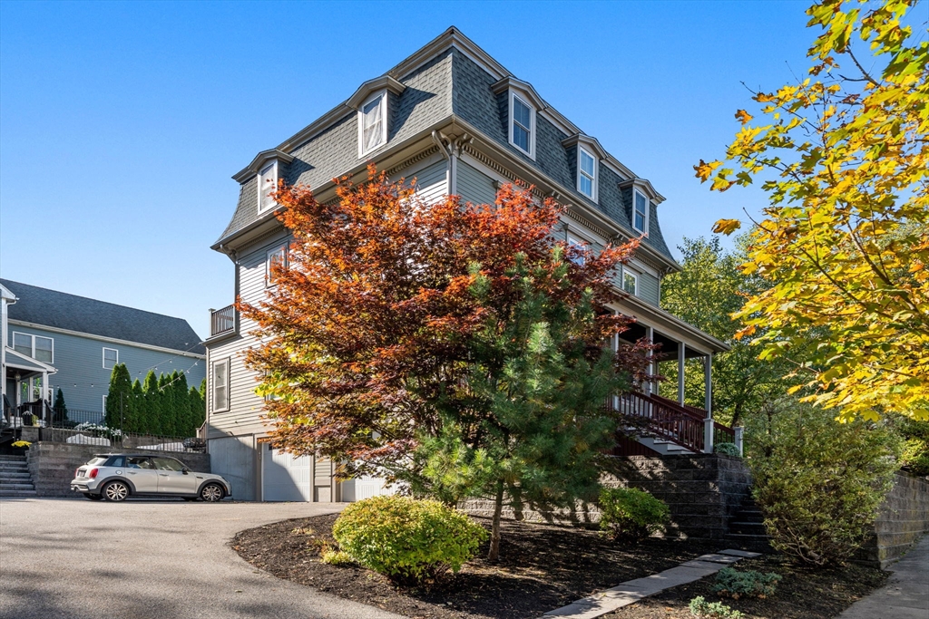 Set atop a stately Mansard Victorian, this beautifully appointed two-level home offers the perfect blend of historic elegance and contemporary comfort. Step into refined sophistication with classic crown molding, custom built-ins framing a cozy fireplace, and elegant wainscoting in the sunlit office—complete with French doors for privacy. A welcoming mudroom adds convenience and charm. At the heart of the home, the chef’s kitchen is a culinary dream, featuring a massive center island ideal for entertaining. The open and flowing main level also includes a formal dining area, bright and spacious living room, dedicated office and stylish 1/2 bath. Upstairs, unwind in the serene primary suite, w/ walk-in closet and spa-inspired en suite bath with double vanity. Two additional bedrooms, a full bathroom and a laundry room complete the top floor. 1 garage parking/ 1 outdoor. Located less than 1 mile from Roslindale Village!