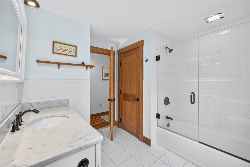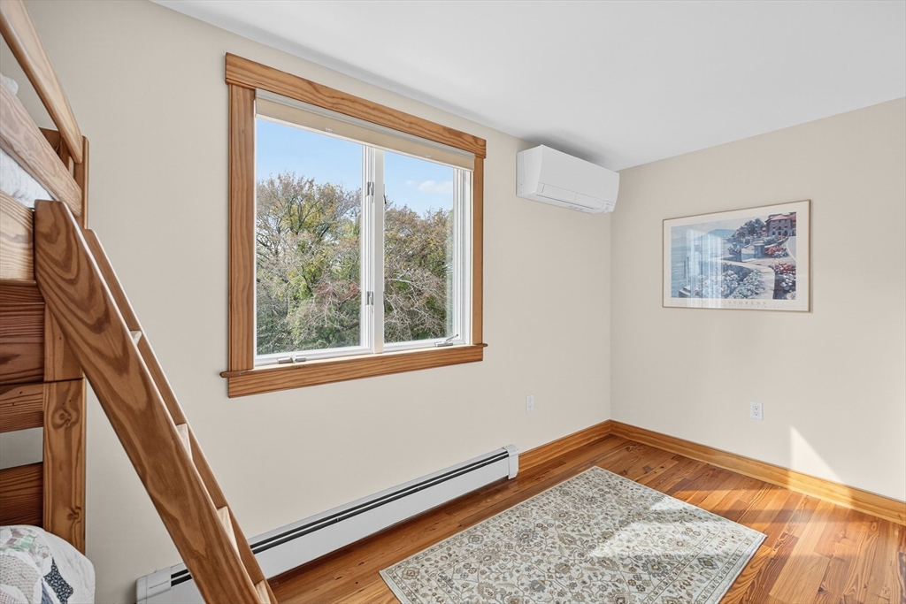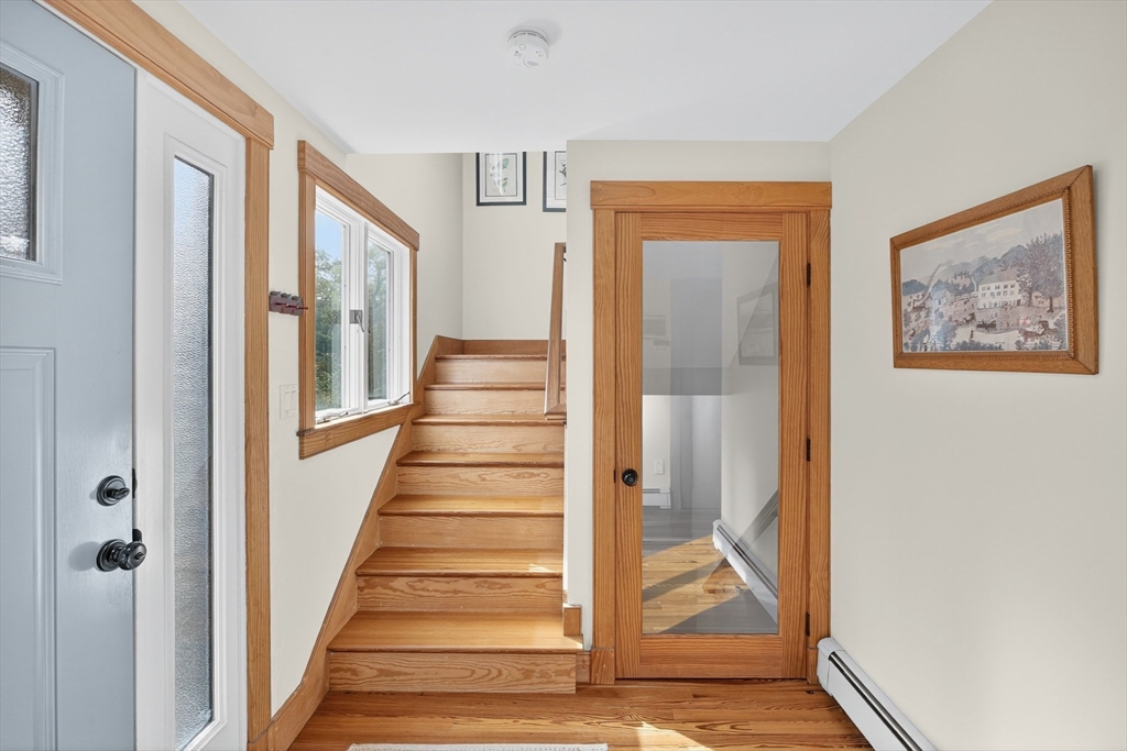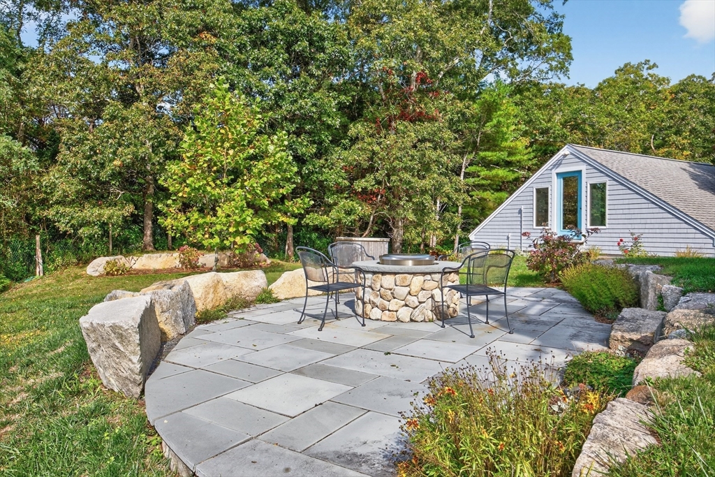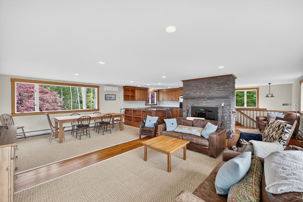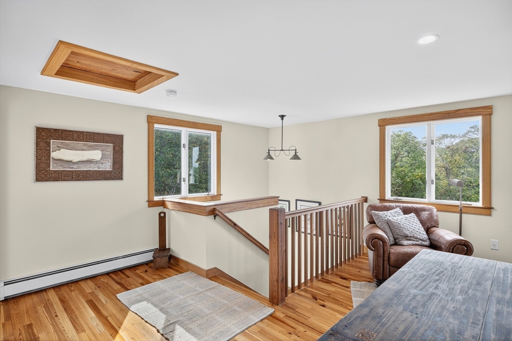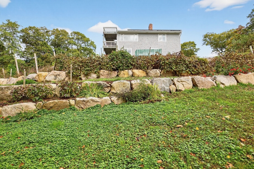 Sippewissett Oceanview Retreat! Perched high on a hill in desirable Sippewissett, this contemporary home offers sweeping ocean views and deeded beach rights. Heart pine flooring flows through the main living areas and bedrooms, adding warmth and character throughout. The open-concept living room features a wood-burning fireplace and connects seamlessly to the kitchen and dining area, both opening to a spacious deck with stairs leading to a rooftop deck—perfect for taking in the views.The lower level offers a family room, den, and full bath with walk-out access to the yard, ideal for indoor-outdoor living. Enjoy three levels of decks overlooking the ocean and surrounding landscape. A separate heated and cooled office space sits above a two-car garage, providing privacy and comfort for work or creative pursuits.The property abuts two scenic trails leading directly into Beebe Woods. Completing this special setting are beautifully terraced gardens. New roof and owned solar panels.