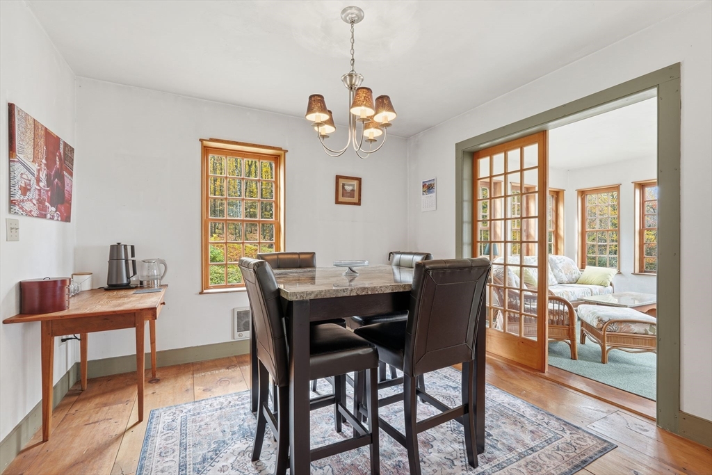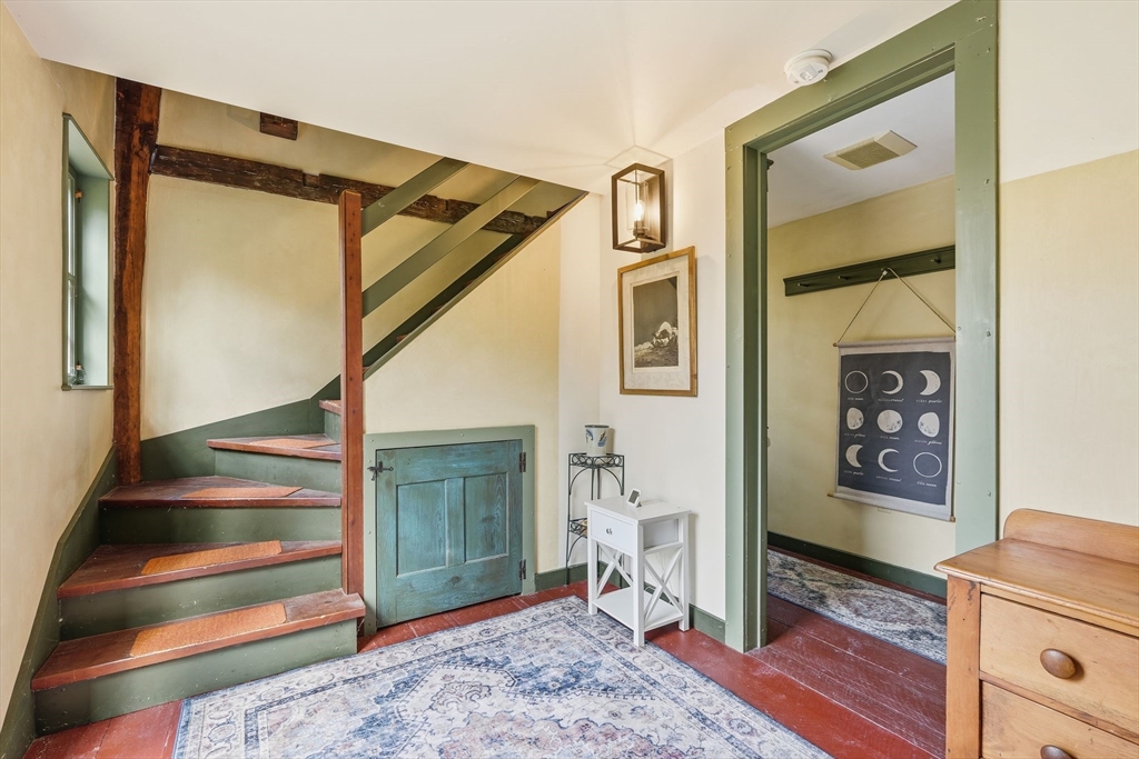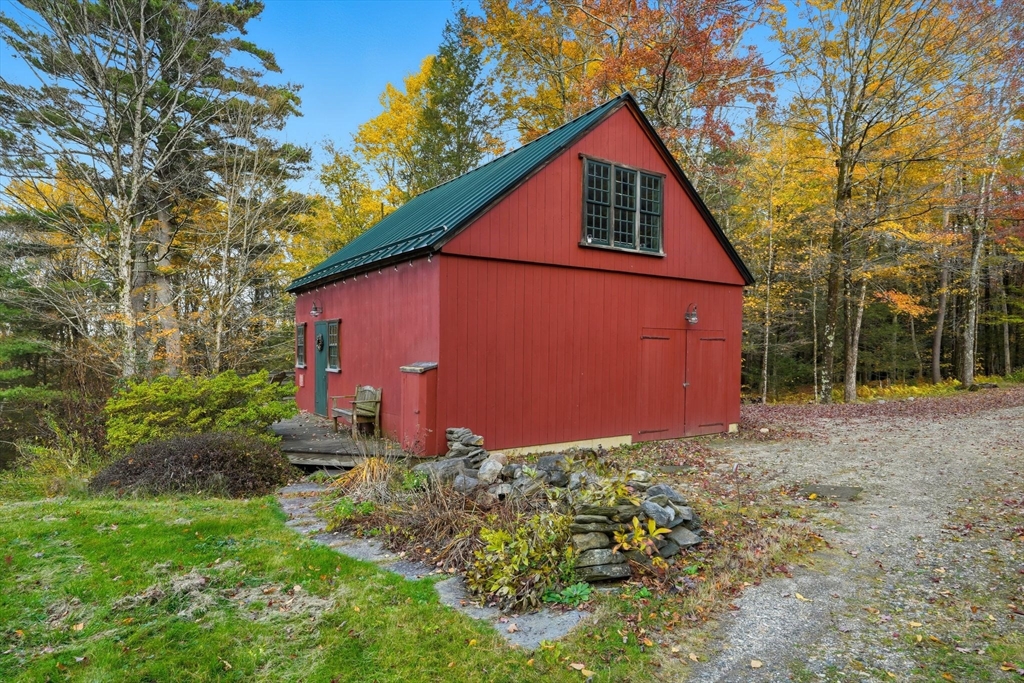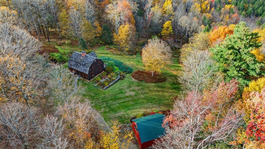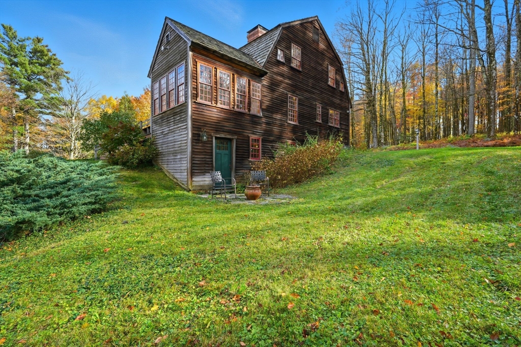 Set on 47 wooded acres at the end of a private quarter-mile drive, this Worthington retreat blends history, privacy, and craftsmanship. The main residence, an 18th-century style Cape built in 1990, features 2 bedrooms, 1.5 baths, 3 Rumford fireplaces, wide pine floors, shiplap paneling, hand-troweled plaster walls, antique hardware, and a custom kitchen with stone counters and handcrafted cabinetry. Sweeping views of the valley and distant hills. A detached guest house—the Sam Hill House, originally built in 1783 and carefully reassembled here in 1990 provides a study, bedroom, foyer, full bath, plus garage and storage. The grounds are framed by 19th-century stone walls, mature gardens, and three ponds, including two spring-fed. Trails, woodlands, and timeless scenery create a one-of-a-kind sanctuary just minutes from Worthington center yet worlds away from the everyday.