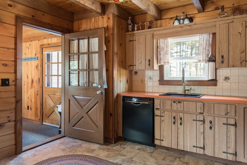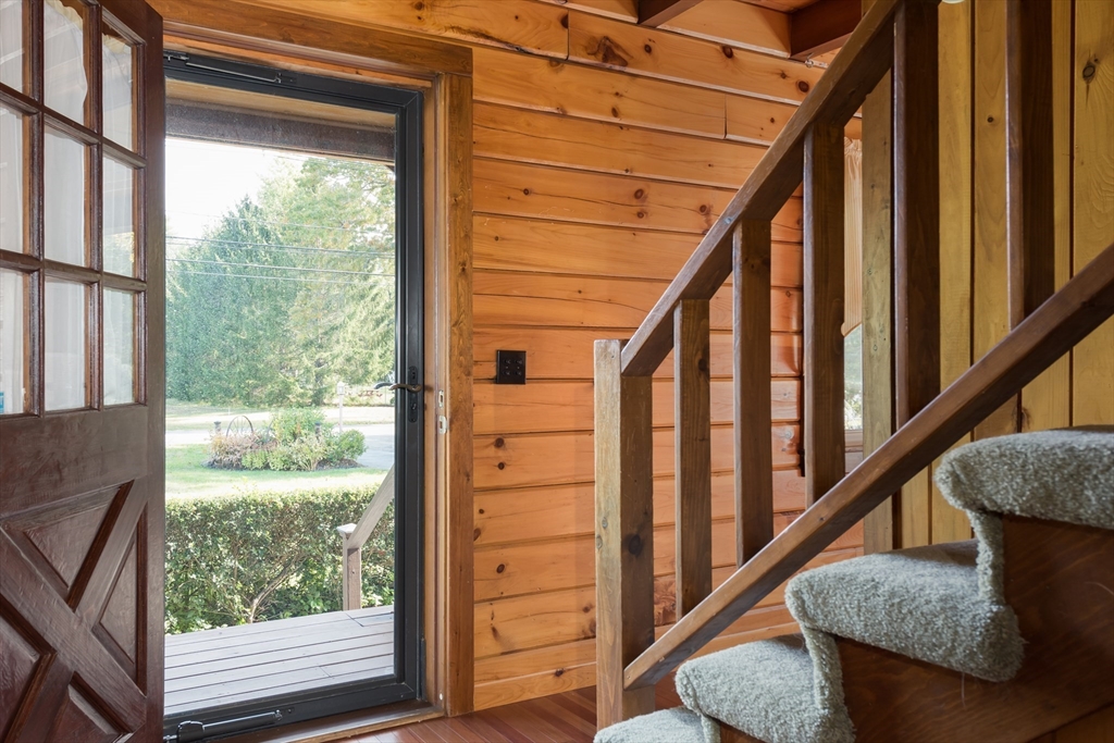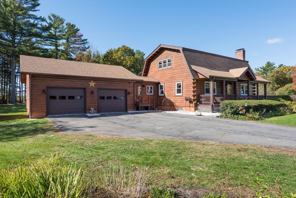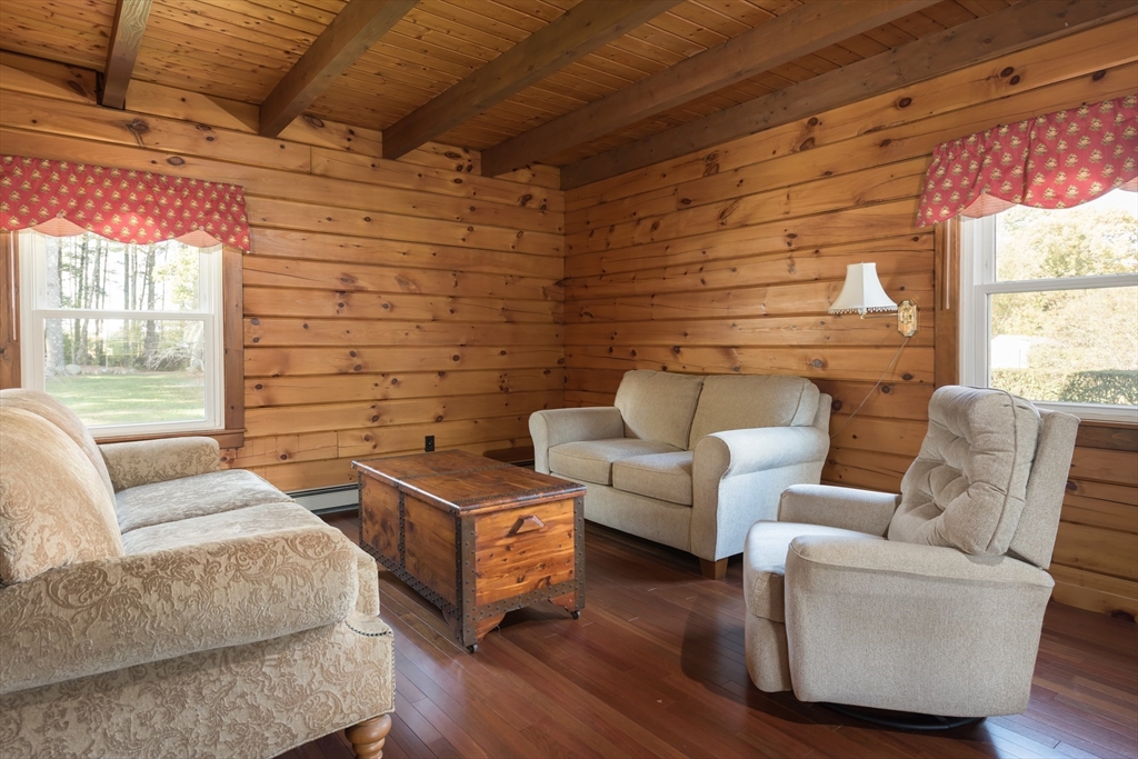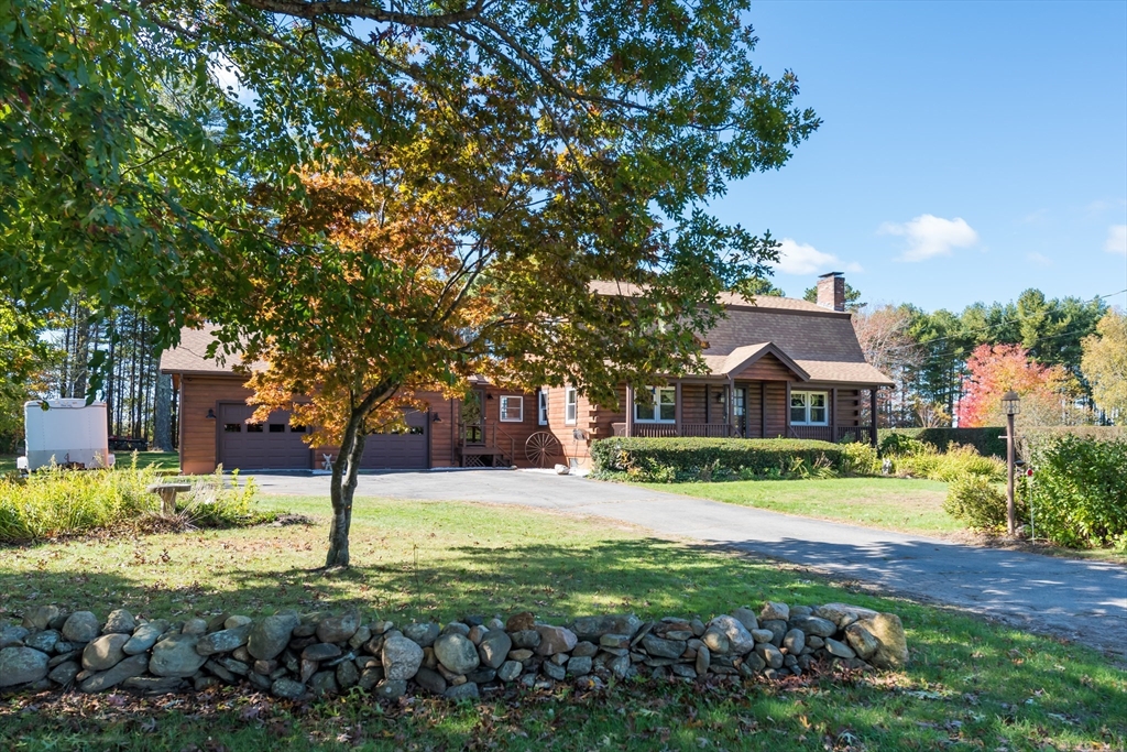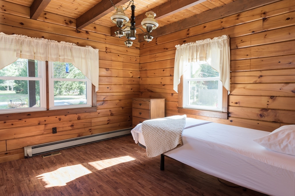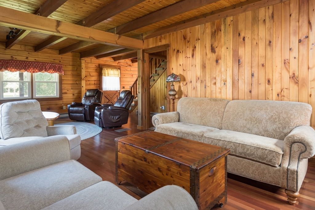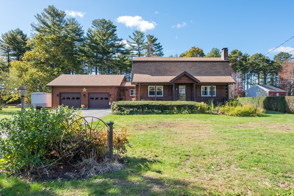 Step inside this classic “Northeastern” log home where rustic character meets timeless craftsmanship. Designed with post-and-beam construction, it welcomes you with a covered front porch perfect for morning coffee and a sun-filled back deck overlooking a private yard abutting cranberry bogs—New England living at its finest. Inside, warm wood tones and natural textures create an inviting atmosphere for comfortable everyday living. The spacious front-to-back living area centers around a wood-burning fireplace, perfect for taking the chill off crisp fall evenings. The kitchen and dining area offer excellent potential to open and modernize for today’s preferred flow (currently being used as a bdrm). Upstairs features two cathedral front-to-back bedrooms, a flex room & full bath. An oversized two-car garage adds versatility for vehicles, hobbies, plus a designed workshop space. Set on a 0.71-acre country lot, surrounded by nature yet close to town conveniences.