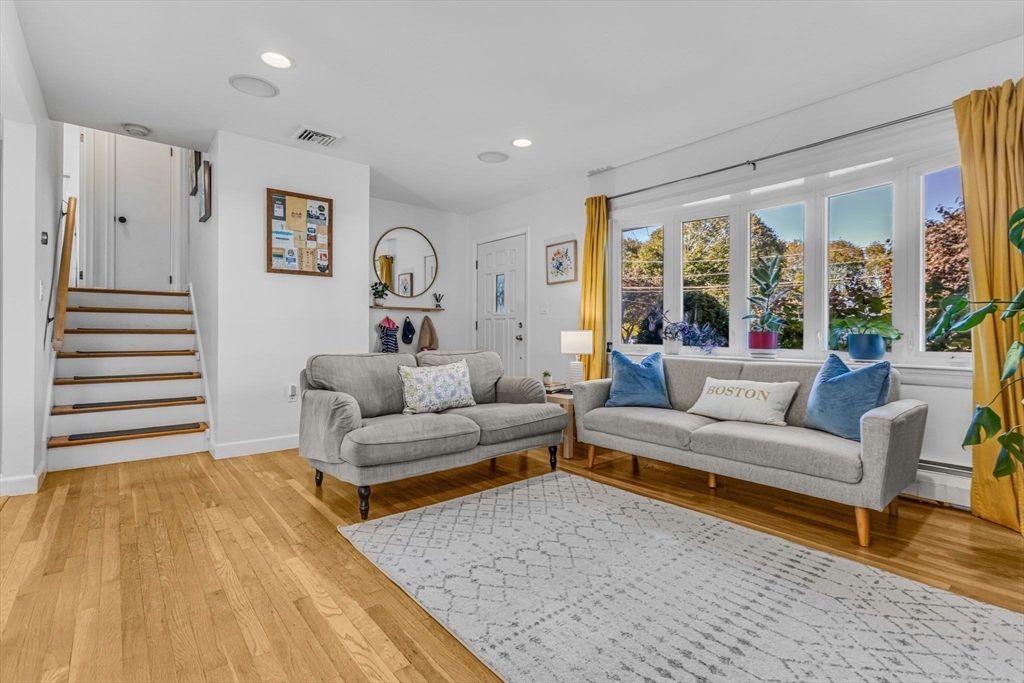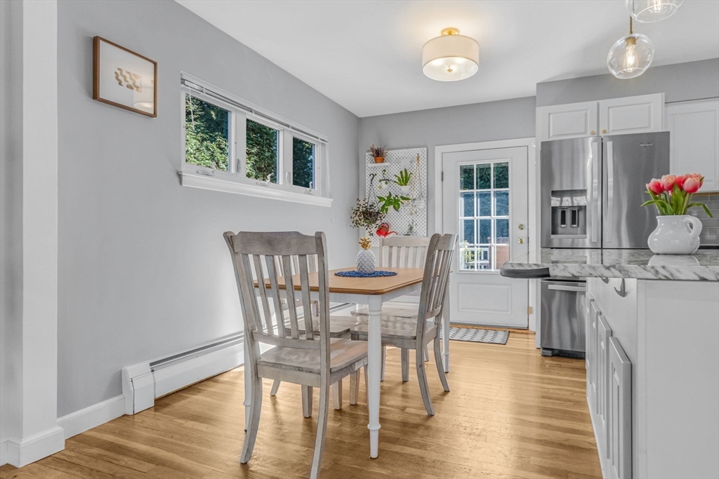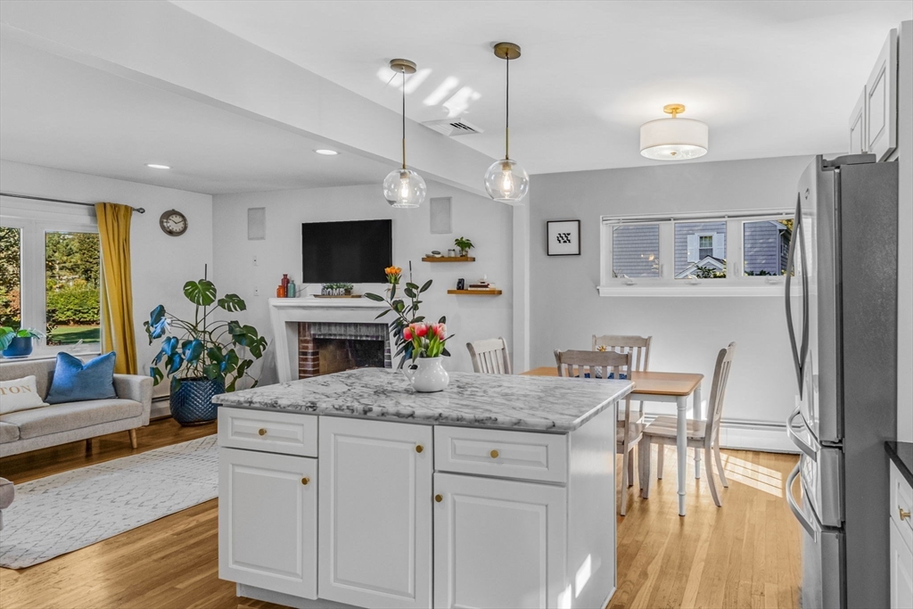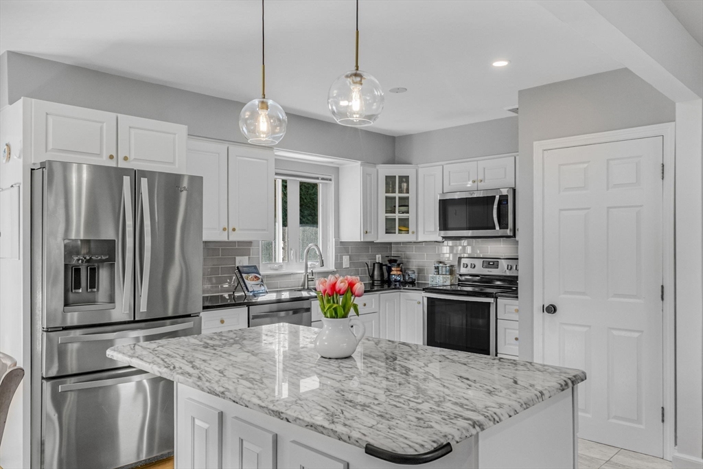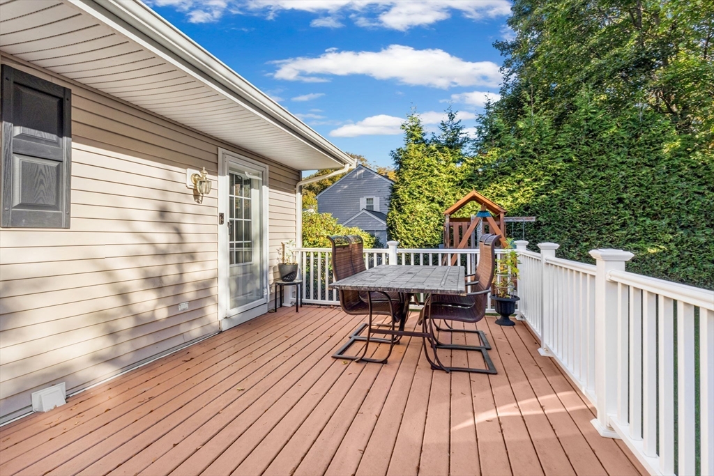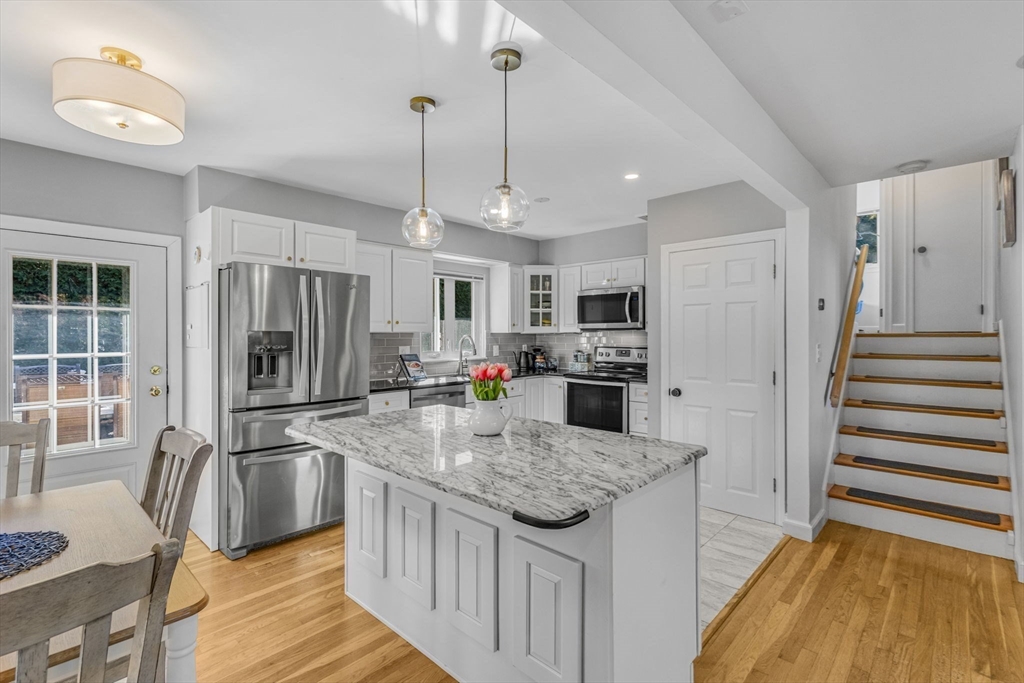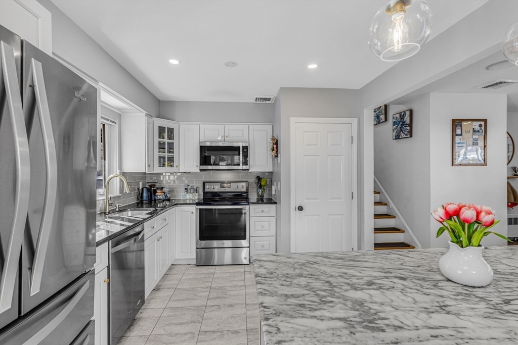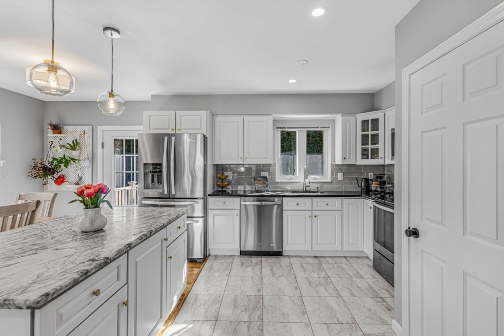 Tucked on a quiet cul-de-sac in one of Waltham’s most exclusive neighborhoods, this beautifully updated home blends modern comfort with classic style. The open-concept main level features a sun-filled living room with bay window and hardwood floors that flow seamlessly into the dining area and remodeled kitchen—complete with granite countertops, stainless appliances, pendant lighting, and center island. The flexible floor plan offers three spacious bedrooms and two full tiled baths, including a private primary suite with double closets. The lower level with laundry offers plenty of bonus space for storage, work area, home gym. Enjoy year-round comfort with central air, updated insulation, energy-efficient windows and garage parking. The level, fenced yard is ideal for play or relaxation with a large composite deck. Conveniently located near shopping, parks, schools, and major routes, this move-in-ready home offers the perfect blend of privacy, neighborhood charm, and convenience.