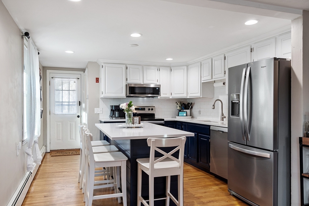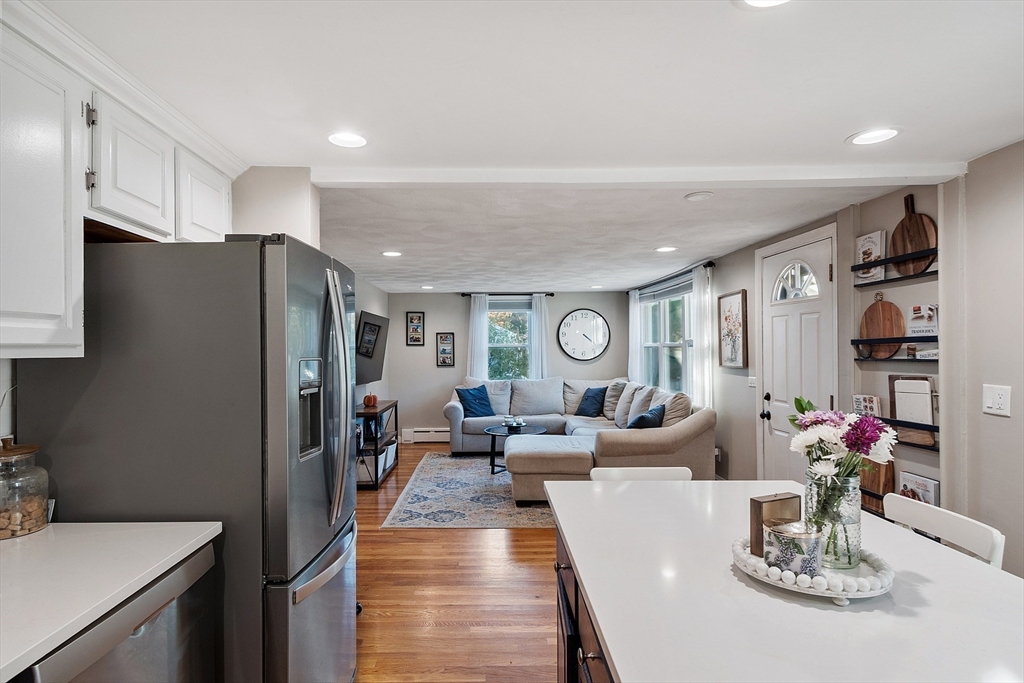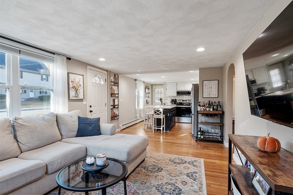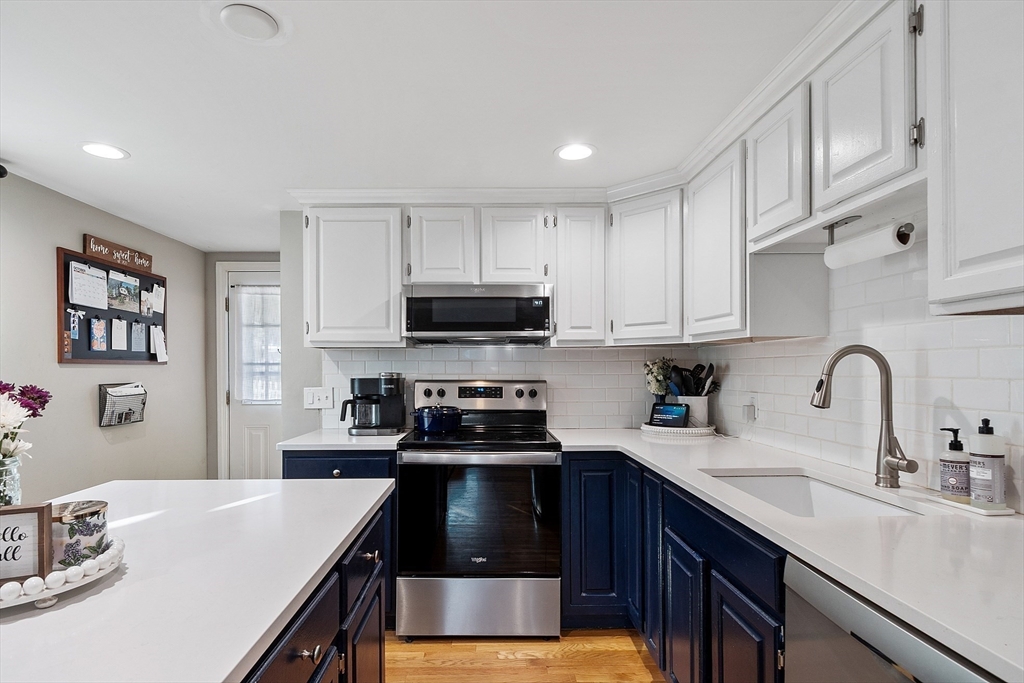 Gorgeous, well maintained, cute as a button Ranch on a quiet side street! This home boasts a contemporary kitchen with quartz counter tops, updated cabinets, tile back splash, and stainless steel appliances that flows beautifully to the sun drenched living room with recessed lighting, gleaming hardwood floors throughout the main living area, updated full bathroom with tile floors, both bedrooms are good sized with ample closet space, newer hot water tank and roof, vinyl siding, and so much more! The partially finished walk out basement gives you more room to spread out and to make your own. Sit out on your wonderful patio that over looks the private, large, serene setting that is your back yard! Ideal location that is close to highways, Tree House Brewery, shops/restaurants, and everything else that Tewksbury has to offer!