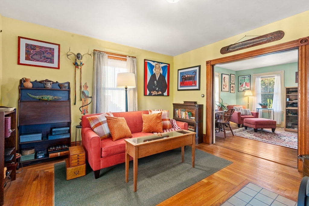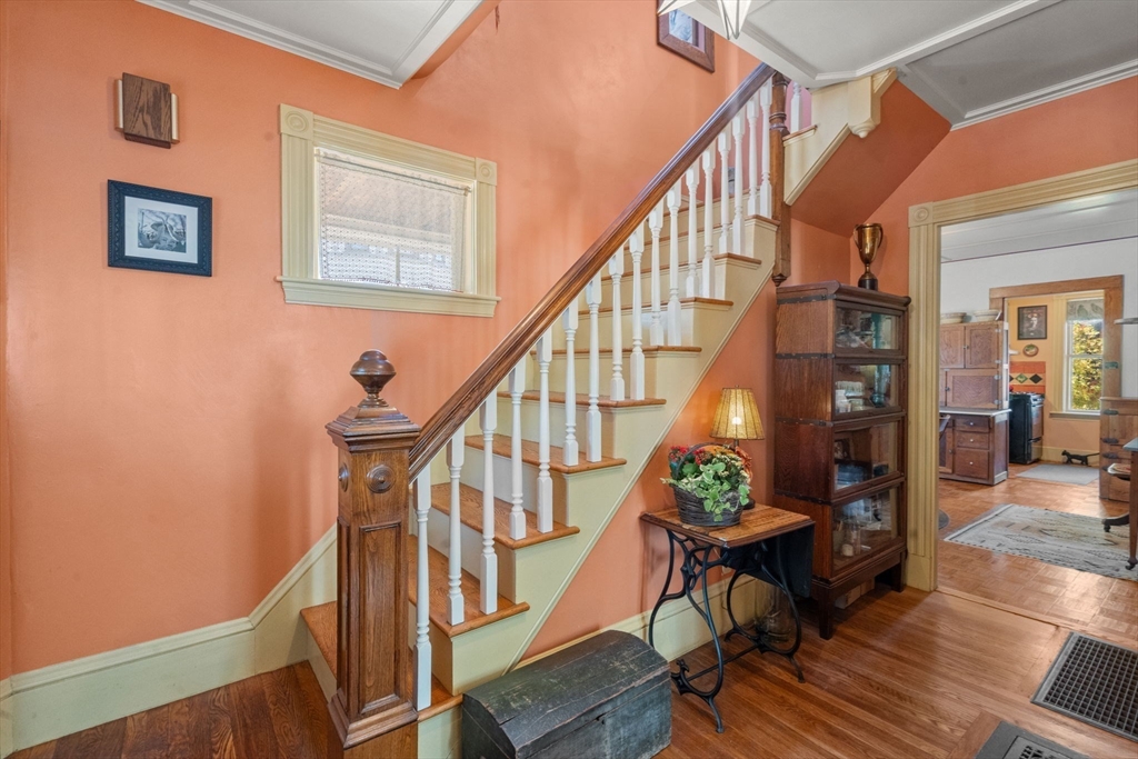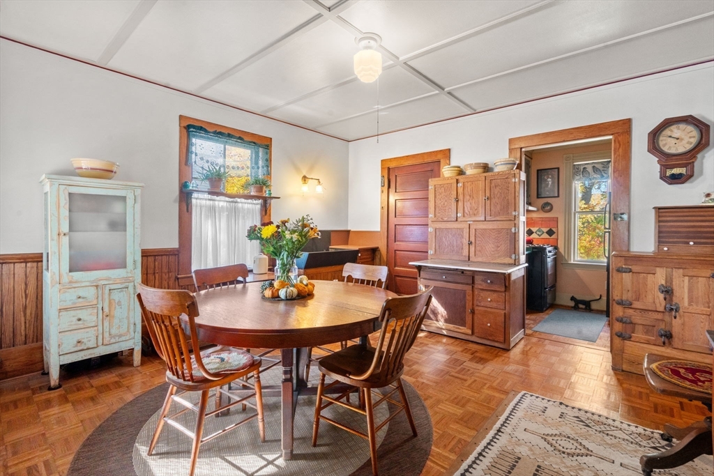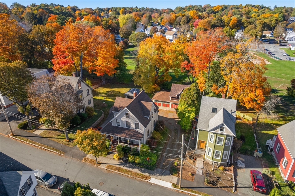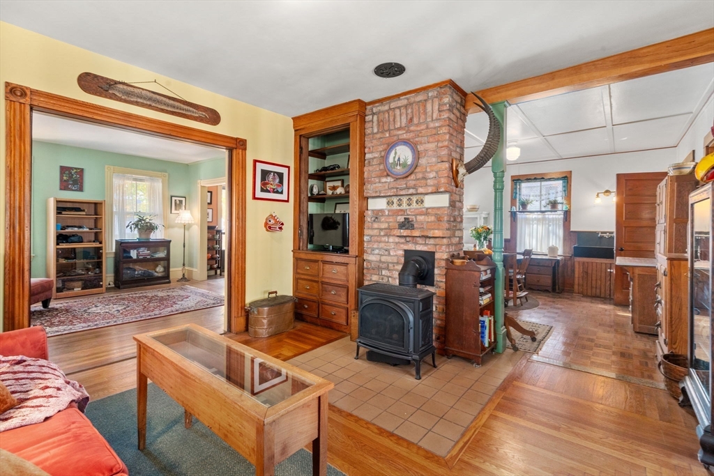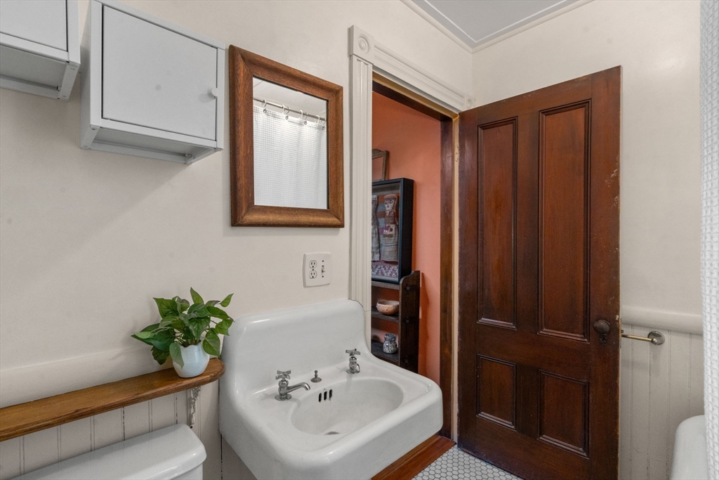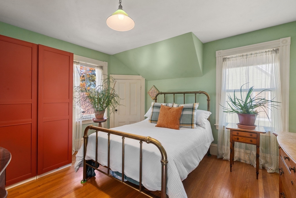 Gorgeous colonial farmhouse in Wakefield's desirable West Side. If you're looking for charm and character, this house has it, starting with the fabulous wrap-around porch! Eat-in kitchen features a soapstone sink and convenient adjacent mudroom. Gorgeous pocket doors with in-laid glass separate the large living room from the cozy den featuring a gas stove for snuggling up on those cold winter nights. French doors lead to a sunroom that makes a perfect reading nook, overlooking the lovely carriage house out back. Upstairs showcases three large bedrooms and a quaint bathroom featuring an antique sink and clawfoot tub. Hardwood floors throughout. Walk-up attic offers additional storage, as does the walk-out basement with charming root cellar. Stunning carriage house offers room for a two car garage and features an adjacent workshop with propane heat. And the second floor offers even more storage! Conveniently located less than a half mile from the commuter rail and Wakefield center.