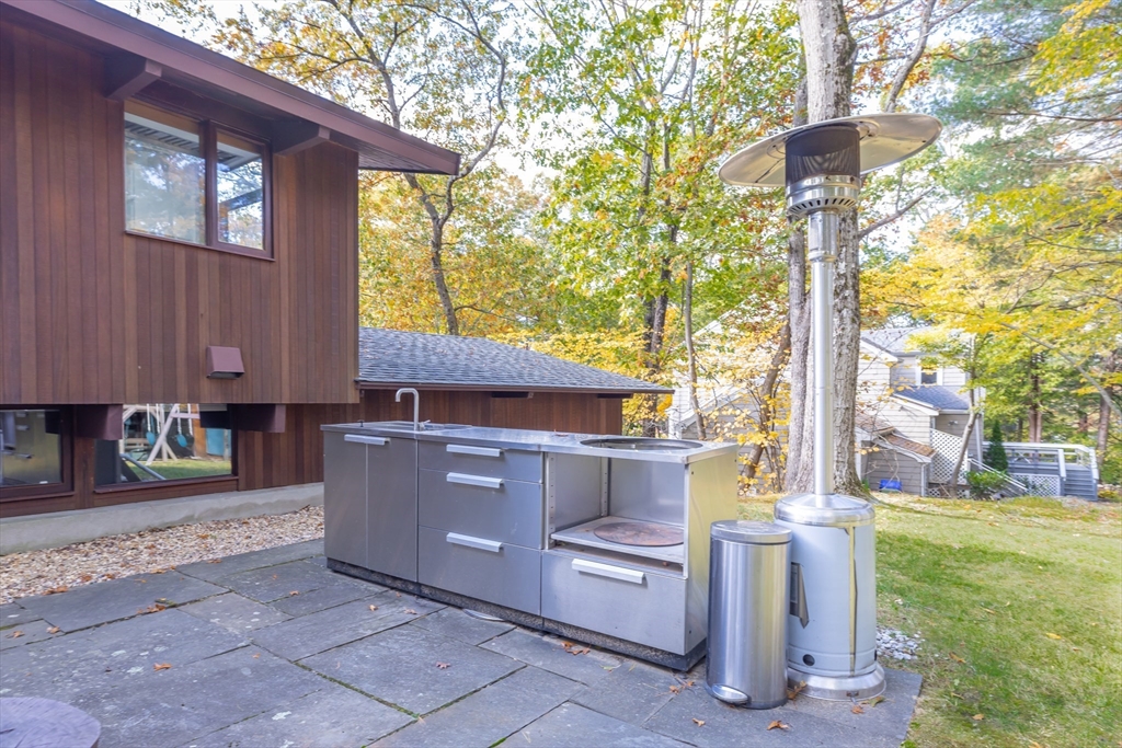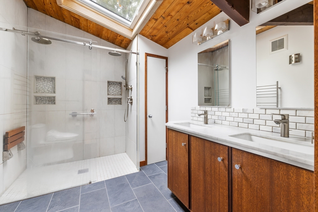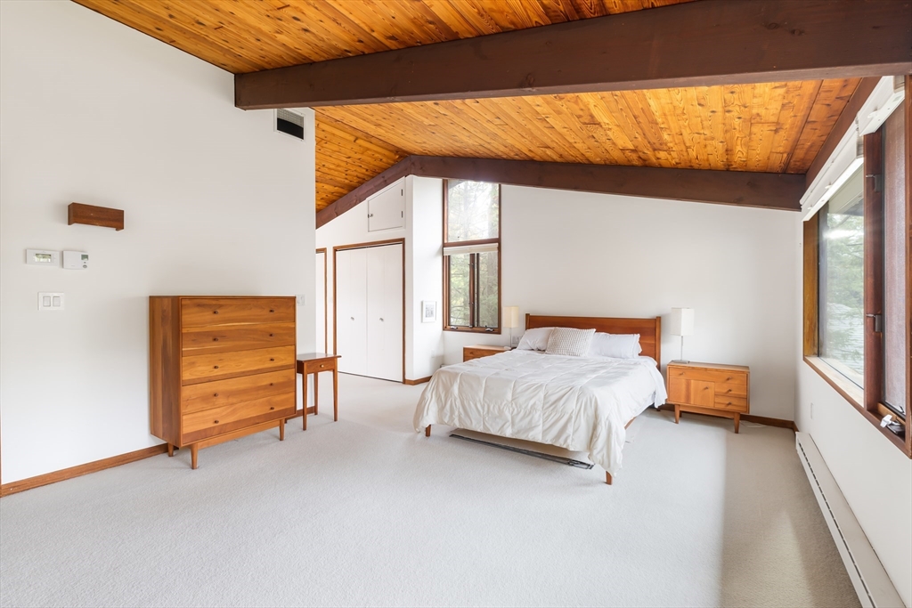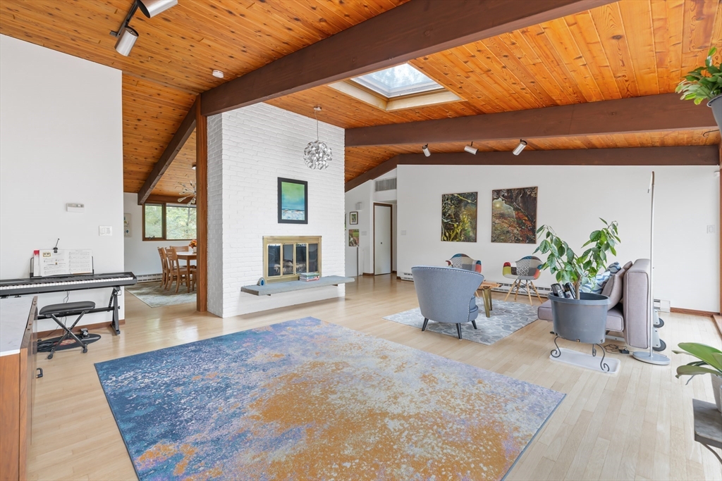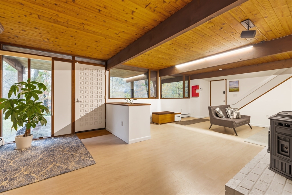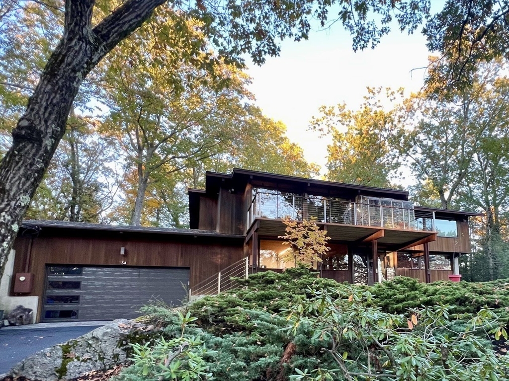 A dramatic wall of windows captures sweeping treetop views from this remarkable Contemporary-style Deck House. Perfectly sited on a gentle hillside along one of Chestnut Hill’s most picturesque streets, this four-bedroom, two-and-a-half-bath residence masterfully blends architectural character with thoughtful modern updates.The open-concept design showcases light-filled spaces, beamed vaulted ceilings, generous room sizes, and warm, inviting details throughout. The updated kitchen is a chef’s dream, featuring gas cooking on a WOLF stove and custom cabinetry. The spacious living room opens through sliding glass doors to a large deck with spectacular views—ideal for entertaining. Cozy up by the pellet stove in the family room this Winter, or tend to your plants in the attached greenhouse come Spring. Enjoy Summer gatherings on the private patio with the convenience of an outdoor kitchen (2019). Additional highlights include a new roof (2025), shed (2020) and a direct-entry 2 car garage.