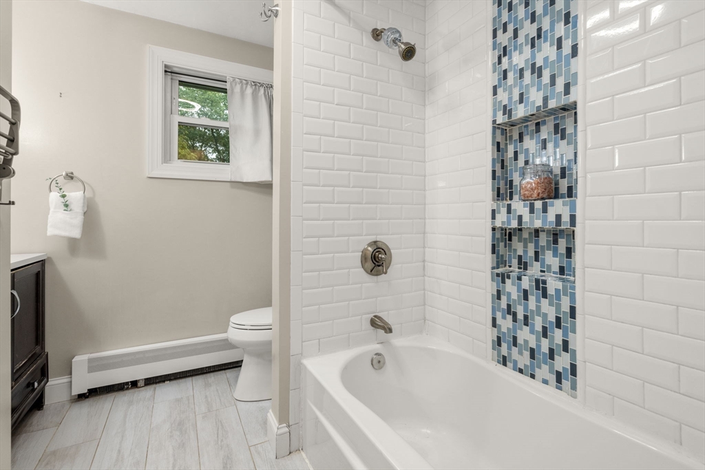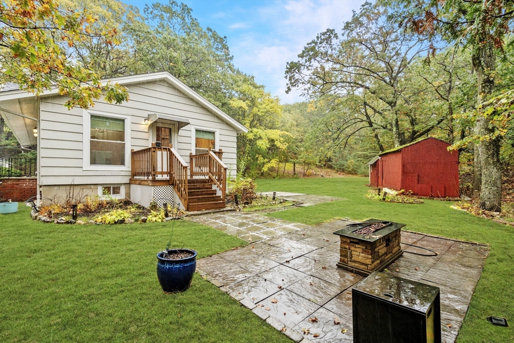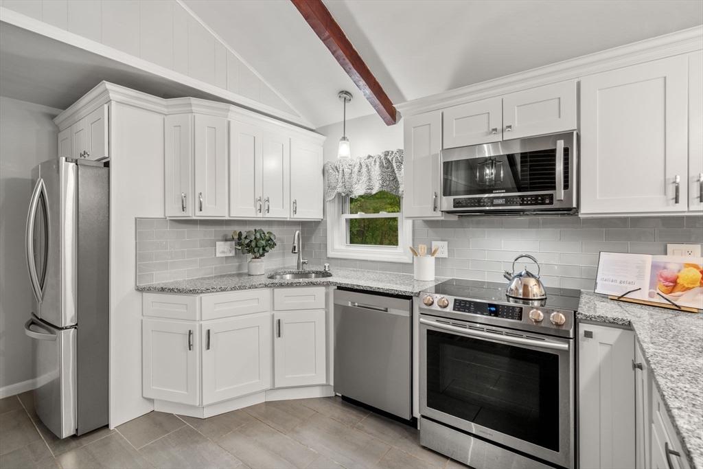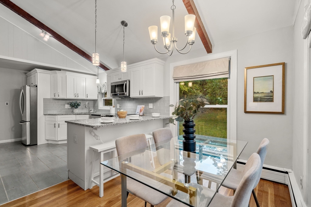 Tucked on a quiet street surrounded by mature trees, this move-in-ready single family offers a rare combination of space, style & privacy with a country feel just minutes from Boston. The 2020 kitchen shines with stainless appliances, granite counters, breakfast bar & open flow to the living & dining areas accented by 12-foot vaulted ceilings, exposed beams & architectural detail that feels like a design magazine spread. Three spacious bedrooms, newer windows & gleaming wood floors complete the main level. The finished lower level adds a fireplace, full bath, office, bedroom & easy potential for an in-law suite or creative studio. Beyond the doors awaits a private 1.29-acre retreat with lush lawn, gardens, stonework, deck & mature landscaping, perfect for summer BBQs, fall fires, or gardening. With two commuter rail stations nearby & quick access to Route 1, this home delivers sophistication, serenity & style, offering a peaceful escape with every modern convenience. OH Fri, Sat, Sun
