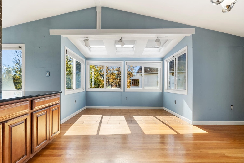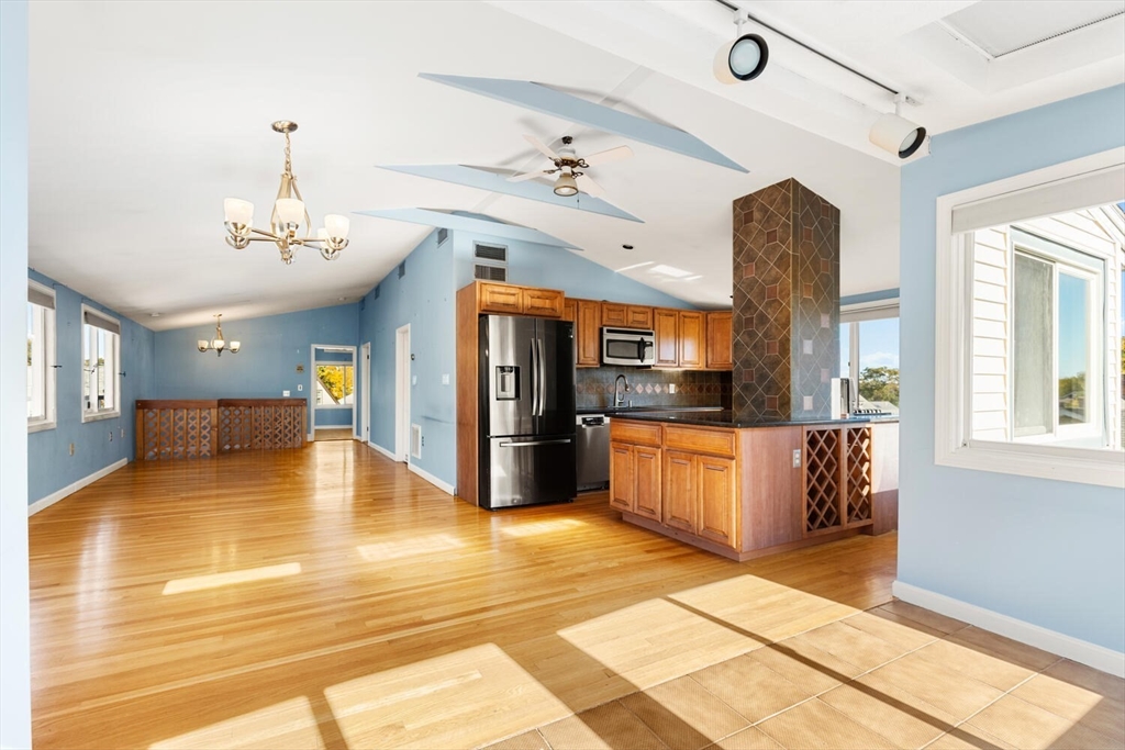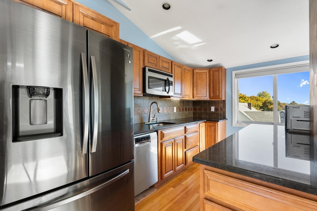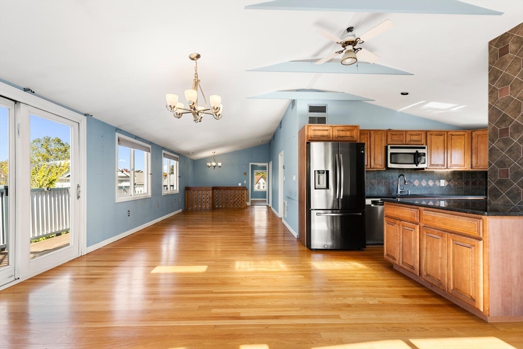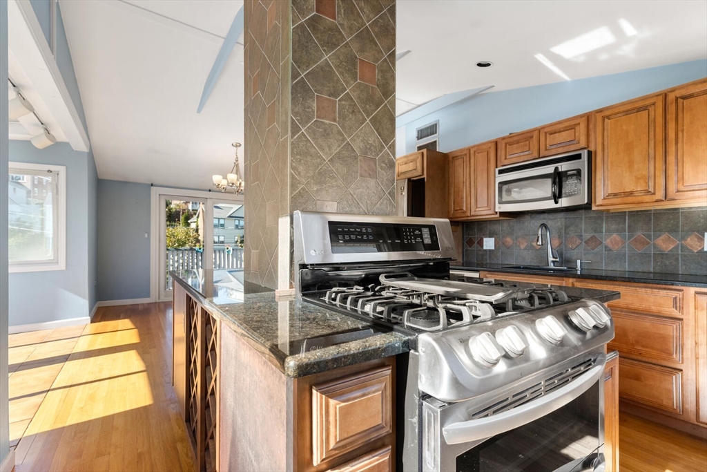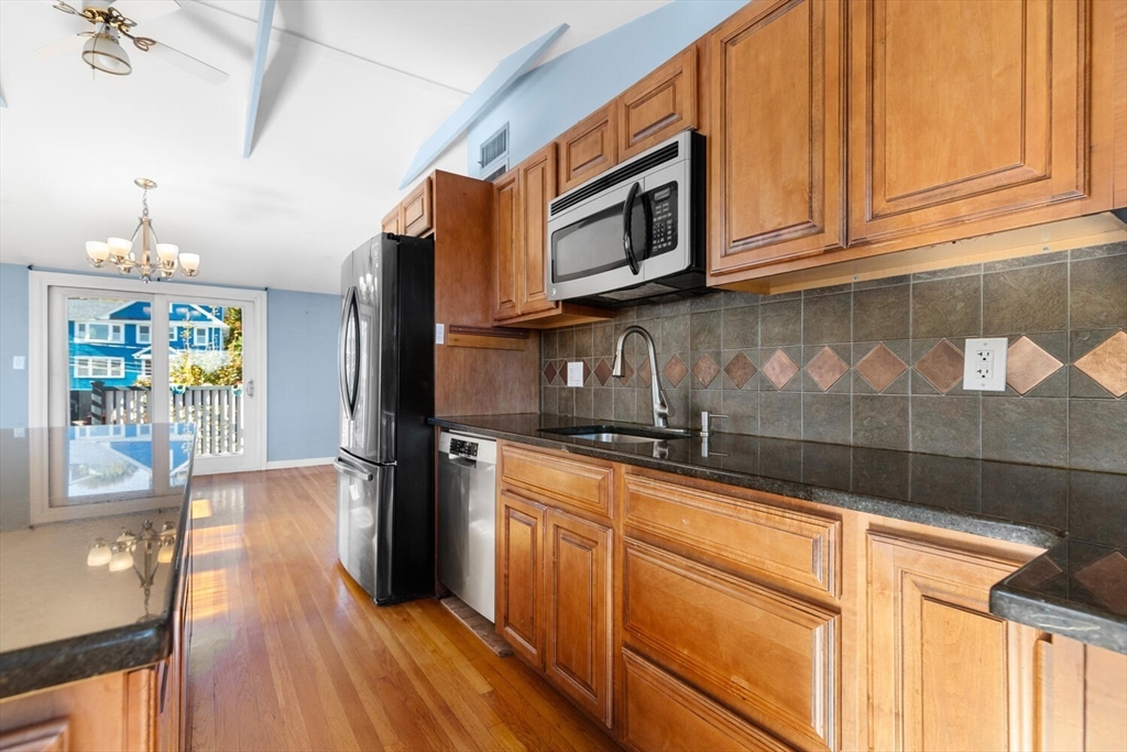 Amazing top floor spacious 2 Bedroom Condo located in the sought after East End of Watertown. This bright & sunny unit offers an open floor plan with large living room. Nice dining room with slider leading to a private deck. Full kitchen with cherry cabinets, granite counters & SS appliances. Separate breakfast area with an abundance of windows. Vaulted ceiling main bedroom with large closet. Generous size second bedroom. Bathroom with whirlpool tub and separate shower. Nice hardwood floors throughout, circuit breaker electric panel, central air & forced hot air. Bonus room on street level perfect for home office, studio or storage. Exclusive one car garage with an additional off-street parking space. Private outdoor yard. This home is just steps to the Central Sq & Harvard Sq bus line. Short stroll to the New Arsenal Yards, bike paths, parks, specialty shops & cafe's. Restaurants & shopping. Perfect opportunity to own your own home in bustling Watertown! Welcome to Watertown!
