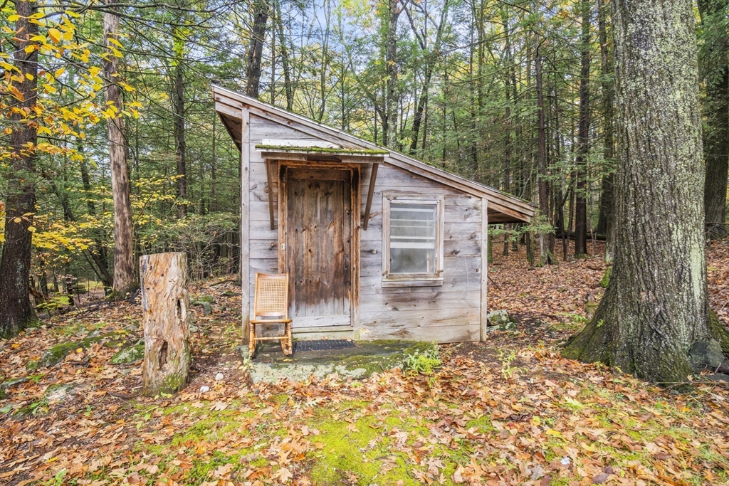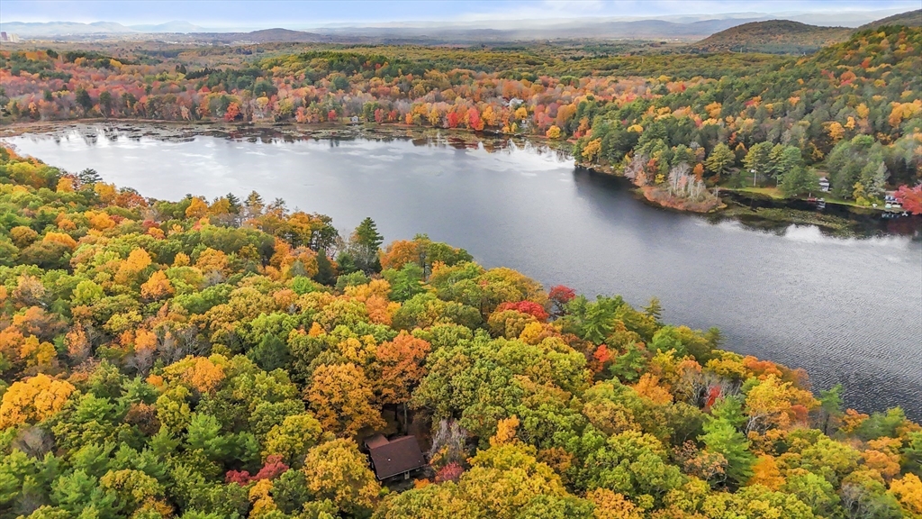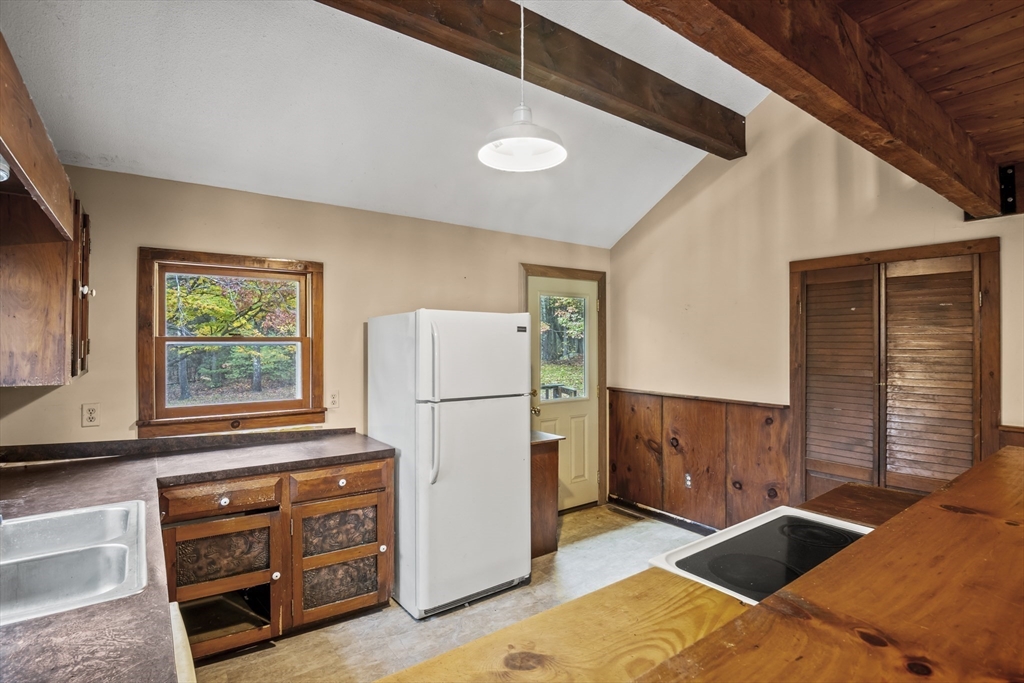 Welcome to your cabin in the woods! This contemporary home blends rustic charm with natural surroundings on a peaceful 1.4-acre lot overlooking a pond. The main level features a bright open layout with cathedral ceilings, exposed wood beams, and a wood-burning fireplace that anchors the living room. The adjoining dining area and kitchen offer deck access—perfect for outdoor dining or quiet mornings by the water. The first floor includes two bedrooms with wood flooring and a full bath with tub and shower. Upstairs offers a loft with warm wood finishes, an office with French doors, and a spacious main bedroom with closet storage. The walk-out lower level provides additional living space with a full bath, bedroom, and kitchenette—ideal for guests or in-law setup. Whether it's an investment property, a primary or second home, enjoy the wraparound deck, wooded setting, and direct pond access for year-round relaxation or recreation!