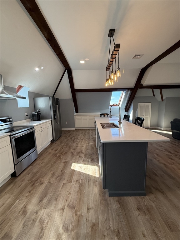 Spectacular top-floor loft in a beautifully renovated, turn-of-century historic carriage house just steps from downtown Andover. This open-concept 2-bed+, 1-bath unit features soaring ceilings, skylights, exposed beams, wide plank hardwood floors, and crisp designer finishes throughout. High-end lighting fixtures, custom built-ins, and a flexible bonus space ideal for home office or storage elevate the appeal. The entire third floor is yours—private, quiet, and full of light. Parking: one space during business hours, two spaces after hours. Modern systems and thoughtful restorations blend character with convenience. Walk to shops, cafes, restaurants, and the Andover commuter rail. Local favorites include the beautiful trails at Ward Reservation and Harold Parker State Forest, Andovers Farmer's market, and the historic charm of Main Street / Elm Street districts. Easy access to major routes and Boston commuter options. Central AC and heat included in rent.