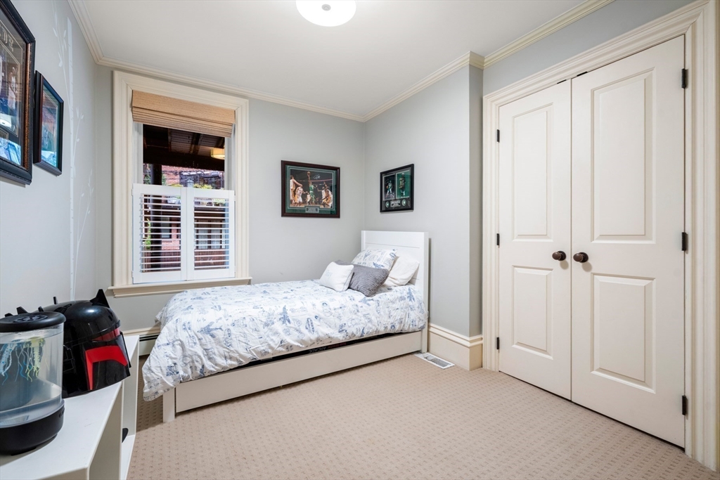 A hybrid of “Boston Classic” & modern detail in this pristine parlor to garden triplex offering 3+ beds, 2.5 baths, 20’-9” x 13’-10” deck off the kitchen (plumbed for gas/water), patio and direct access to 2 parking spaces. Entry foyer opens into double-parlor with high ceilings, dining area with gas fireplace and original detail including the marble mantel, moldings & pocket doors. Attention to detail was used in designing the spacious kitchen offering double stack cabinetry, quartz counters, subway tile backsplash, professional grade appliances and floating island. This home offers a bow-front family room with custom-built-ins, designated home office and a primary bedroom with walk-in closet & en-suite bath. Features include 2 spacious guest beds, a/c, walnut stained h/w floors, custom window treatments, generous storage and mudroom with built-in cabinetry, w/d & sink. This condo comes with roof rights giving the owner a unique opportunity to build a private roof deck with City Views