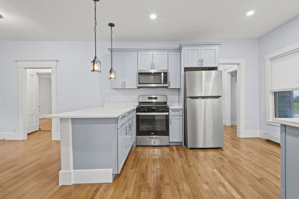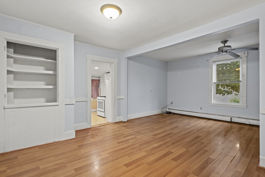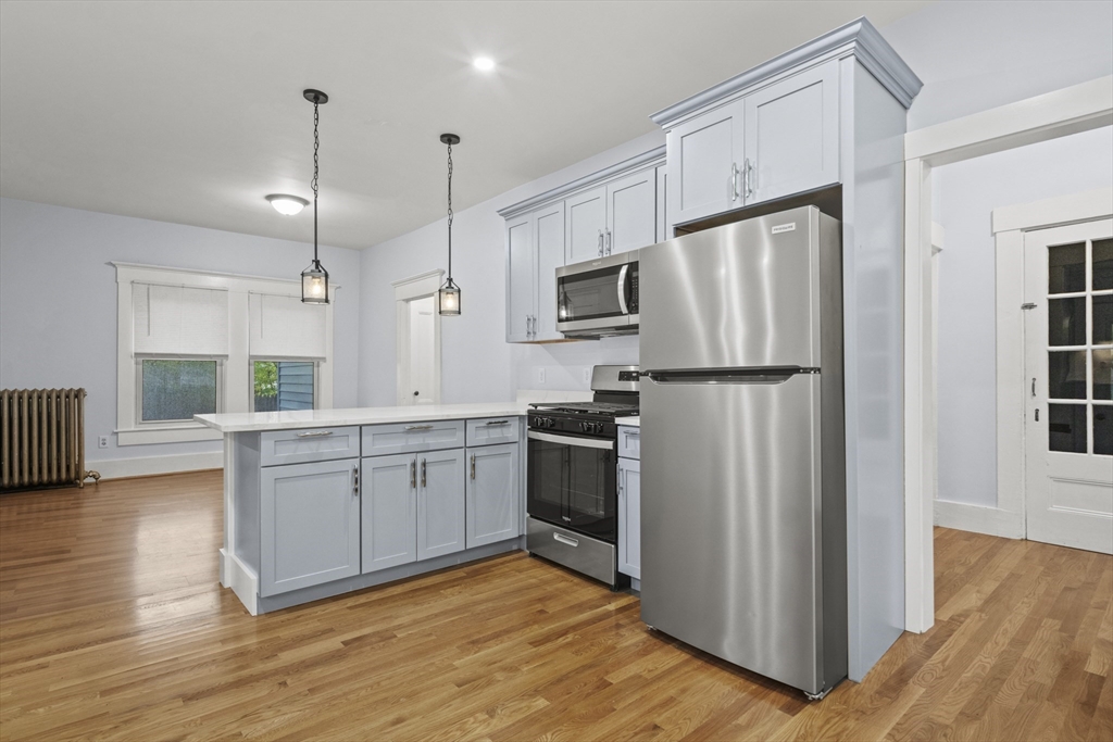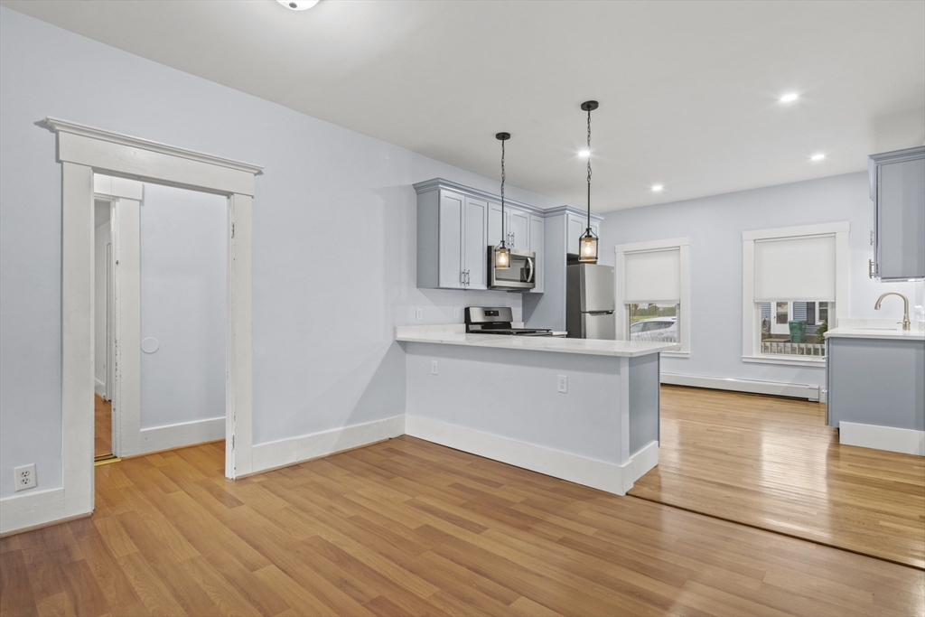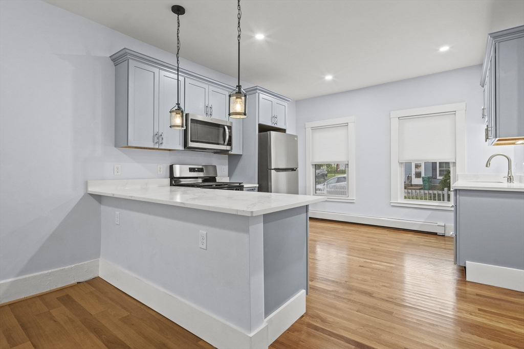 This well-maintained two-family home offers an excellent opportunity for owner-occupancy or investment. The first-floor unit has been extensively updated with a stunning kitchen featuring quartz countertops, new cabinetry, stainless steel sink, gas stove, and a breakfast bar that opens to a bright living area. Additional upgrades include spray foam insulation throughout, a new water heater, and a refreshed bath with new toilet, lighting, and exhaust fan. Laundry hookups are located in the basement. The second-floor unit features a spacious living room with custom built-ins, an eat-in kitchen, new boiler, laundry hookups with basement access, and a bedroom with new insulation, ceiling, and recessed lights. Rear siding was completely redone two years ago, and two smaller roofs were replaced within the last three. Outside offers a private patio and a two-car driveway for off-street parking.