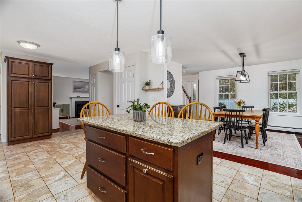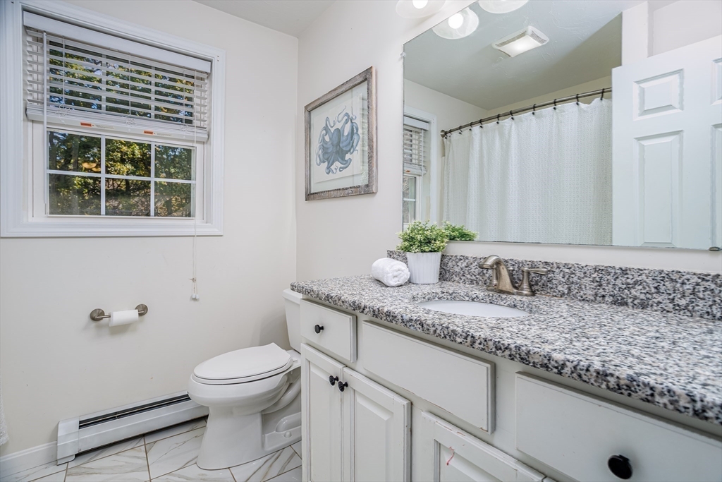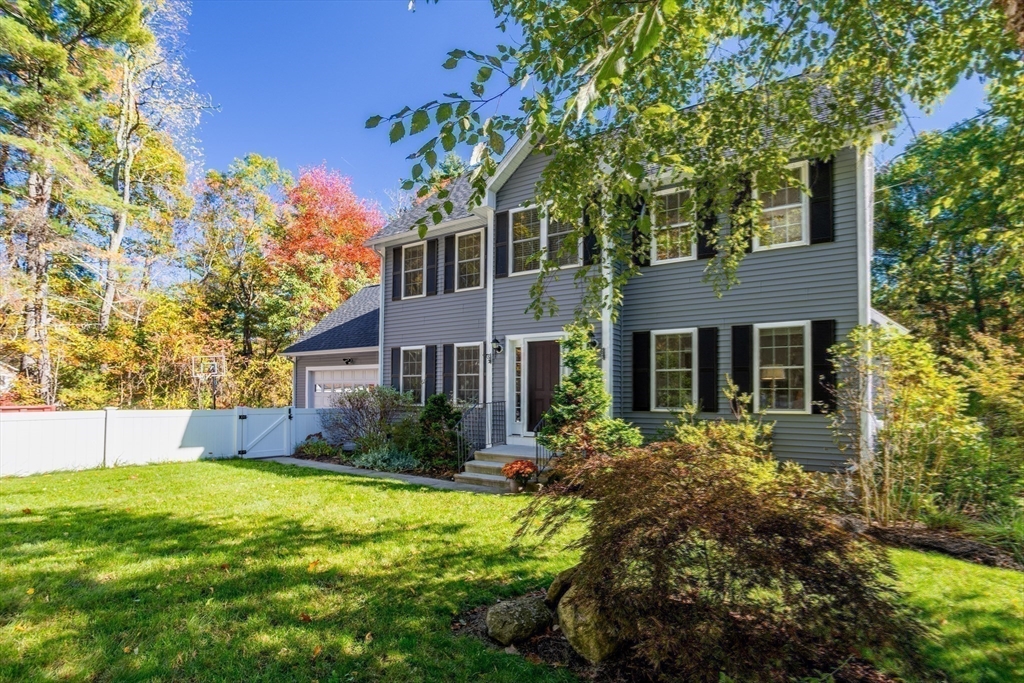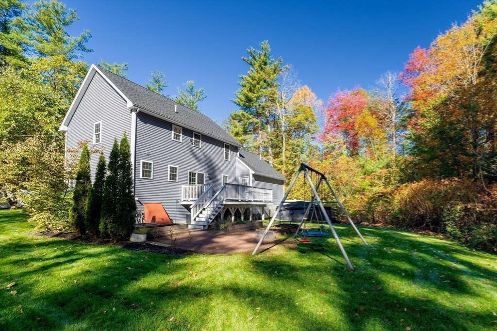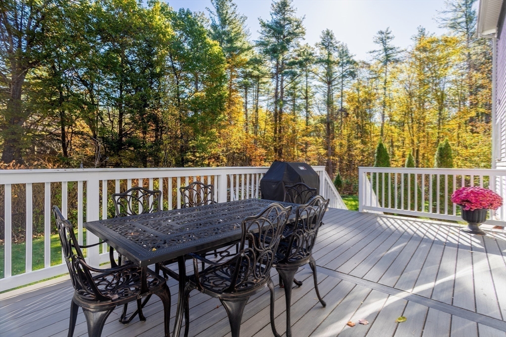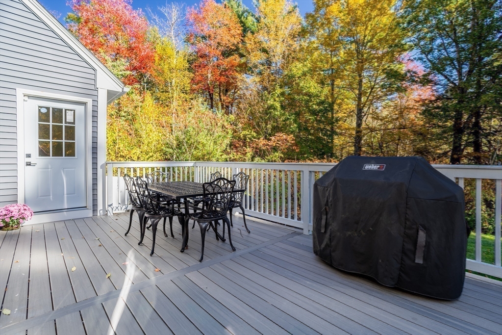 Tucked away on a quiet country road, this beautifully maintained 3-bedroom, 2.5-bath home offers privacy, charm, and convenience. Set on over 4 acres abutting conservation land, enjoy wooded trails and a gentle brook right from your backyard. Inside, the sunny living room features hardwood floors and a cozy propane fireplace. The kitchen boasts granite counters, ample cabinetry, and a gas cooktop. The back-to-front primary suite offers a bright retreat with private bath and custom walk-in closet, while two additional bedrooms feature large closets and easy access to a full bath. Relax or entertain on the expansive easy maintenance composite deck overlooking the fenced-in yard with a new irrigation system. A partially finished basement adds bonus space for a gym, office, or playroom. You will be blown away by the spaciousness of the rooms. Plenty of space for activities both inside and out! New wall mounted boiler. Energy efficient home. Close to area amenities and routes.