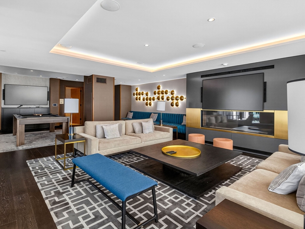 This luxurious residence offers refined city living on the 19th floor of Echelon Seaport. This stunning 2-bedroom, 2-bathroom condo spans 1,168 square feet with an open floor plan ideal for relaxation and entertainment. Floor-to-ceiling windows in the living room, complemented by a tray ceiling, fill the space with natural light and frame captivating city views. The kitchen features a peninsula, custom Italian cabinetry, and Bosch appliances, flowing into the living room and private balcony overlooking the Grand Pool and Courtyard. The well-lit bedrooms and spa-like marble bathrooms add luxury.Residents enjoy one garage parking space and access to over 50,000 square feet of amenities, including indoor and outdoor pools, a fitness center with a basketball court, golf simulator, and yoga studio. Social spaces like a fireplace lounge, private dining room, and outdoor terraces enhance the experience. Services like 24/7 concierge and doorman ensure comfort and convenience.