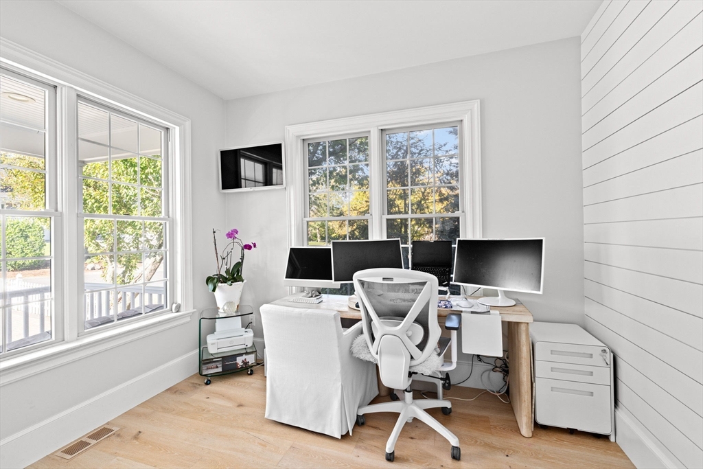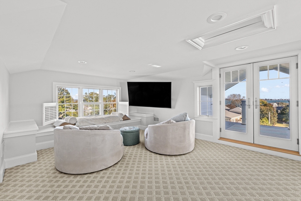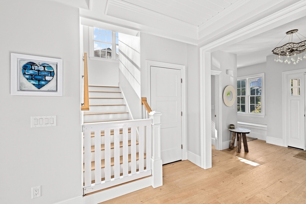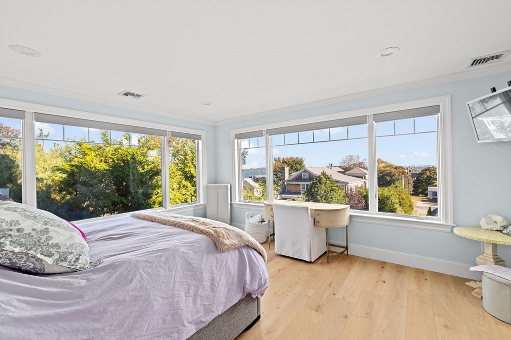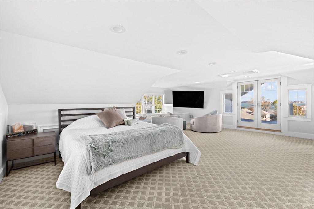 Fabulous WATER VIEWS in this 6 year young contemporary Farmhouse in sought after CROW POINT. The OPEN floor plan everyone wants...where the Kitchen, Dining and Living room flow seamlessly. There are also custom architectural details inc. 9' ceilings, oversized windows and beautiful coffered ceilings. Classic white kitchen w/farmers sink, island, quartz countertops, Wolf stove and Thermador refrigerator. Nice sized office is tucked away in the front of the house and the mudroom with cubbies provides a great drop zone upon entry. The second floor offers 3 Bedrooms and 2 full baths inc. a gorgeous primary suite w/stunning views, a large walk in closet and luxurious bath. VERSATILE space on the 3rd floor w/a full bath and a balcony/deck to enjoy the BEST VIEWS in the house! The lower level is also finished, w/custom built-ins, walk in closet and another WFH space. Fabulous deck overlooking the level, fenced in back yard. Town sewer and Gas. ACCESS to the WATER via Kimball Beach Dock Assn!
