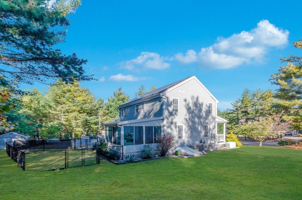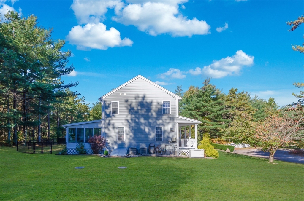 Tucked away at the end of a peaceful cul-de-sac, this meticulously maintained 3-bedroom, 2.5-bath Colonial is brimming with upgrades and charm. Step inside to a warm and inviting living room with gleaming hardwood floors. The open floor plan flows seamlessly into the spacious eat-in kitchen features granite countertops, tile flooring, and generous cabinet space. Upstairs, you'll find two comfortable bedrooms plus a large Primary Suite, all with recently updated carpeting. The finished basement (2014) offers additional living space complete with a mini bar—ideal for game nights or movie marathons. Just off the living room, a bright and airy 3-season sunroom (added in 2017) opens to your private backyard oasis. Enjoy summer days in the heated in-ground pool, relax in the hot tub, or unwind in the beautifully landscaped yard. Additional highlights include Central Air, a whole-house generator (2016), solar panels (2016), and a storage shed.