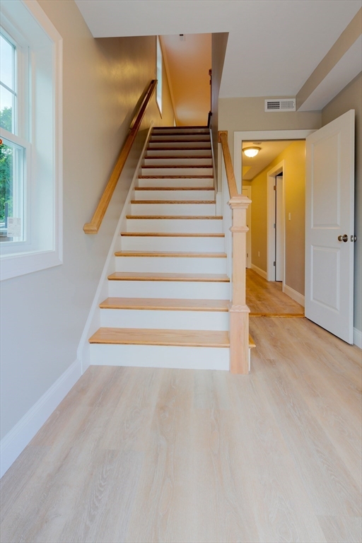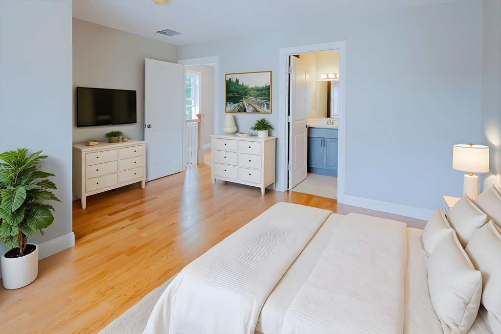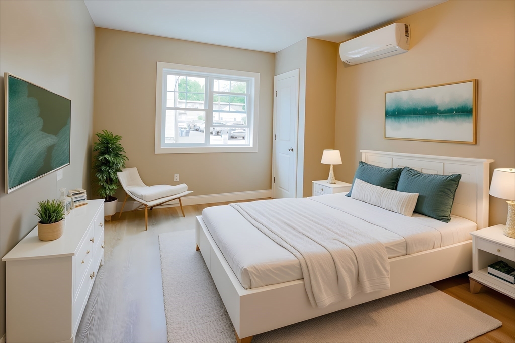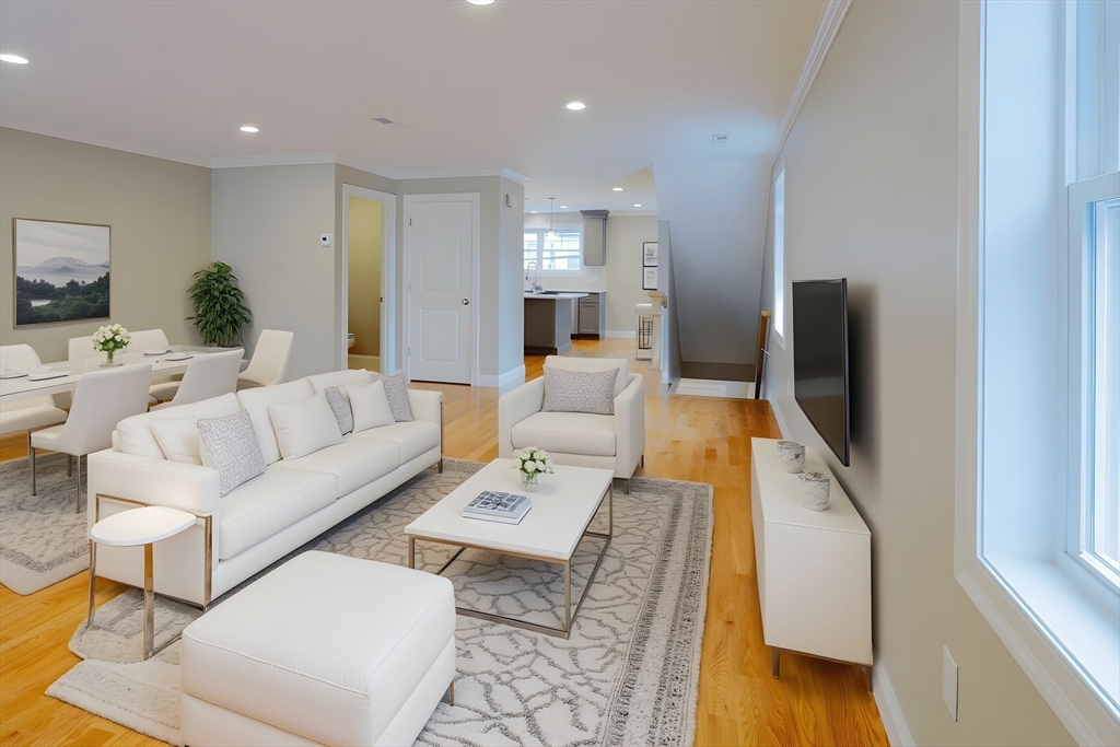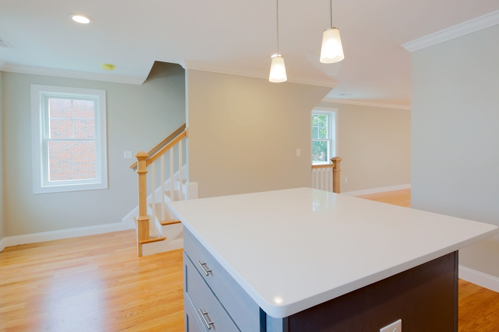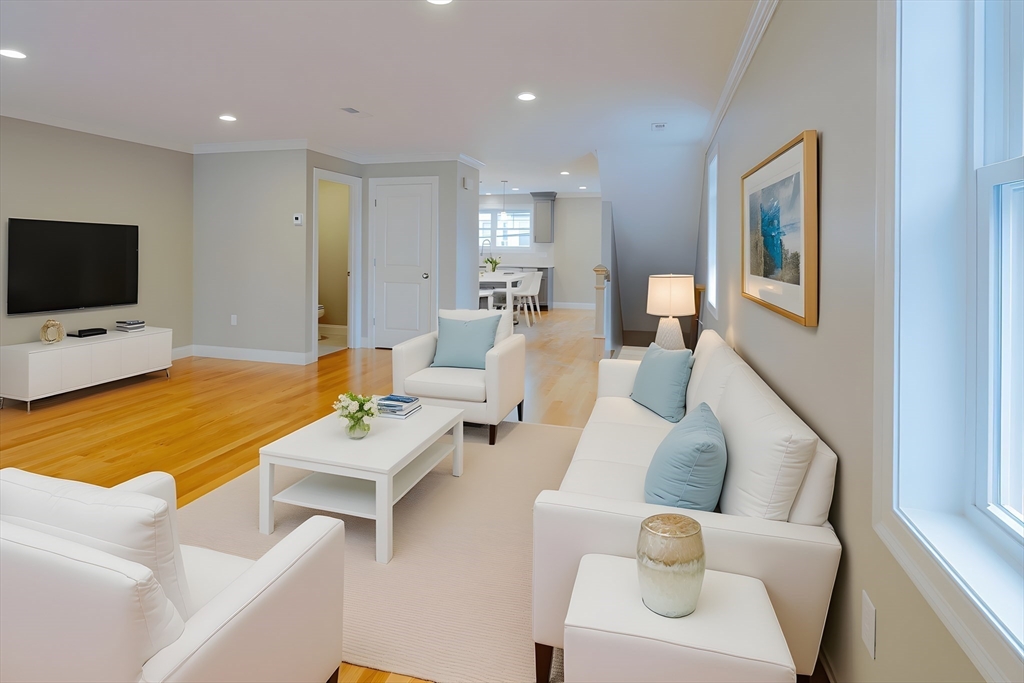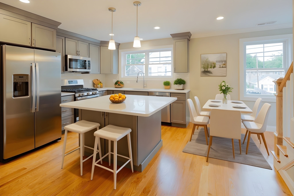 Newer and rarely available three level urban living paradise. This 3 bed and 3.5 bath townhouse with garage set in the heart of vibrant downtown Waltham with all it has to offer! Close to Moody Street's outdoor dining on restaurant row. Level one bedroom can convert office space with wet bar for work from home with en-suite bath or use as a 3rd bedroom. Level two features an oversized living room with sliding door to Juliet balcony, a contemporary kitchen with gray shaker style soft close cabinets, quartz countertops/island, gas range and Stainless appliances plus a half bath. Level three reveals two large bedrooms with walk-in closets and have their own en-suite tiled baths plus the laundry. Hardwood floors thru-out the home. Energy efficient natural gas heat/A/C utilities plus Xtra storage on every floor. See attached Matterport! Minutes to the commuter rail and express bus to downtown Boston and Routes 128/90/2. Guest parking available as well