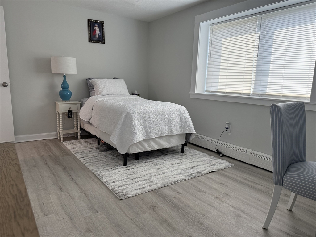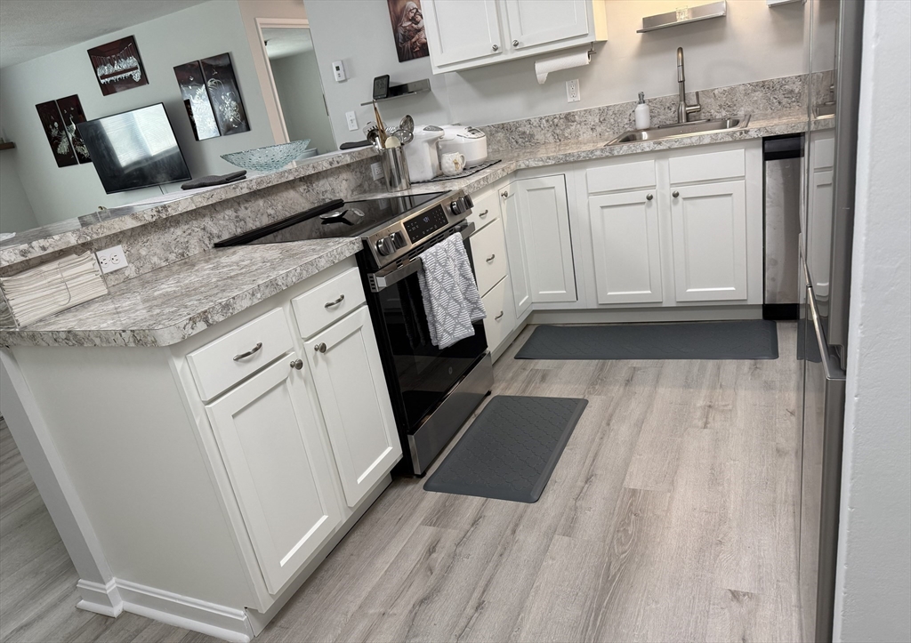 Welcome to this beautifully renovated first-floor end unit, updated in July 2025. This bright and spacious condo offers 4 rooms: 2 bedrooms, 1 bath, and 3 closets for generous storage. The open-concept living and kitchen area features sleek cabinetry, SS appliances (new range, oversized fridge, dishwasher), breakfast bar, and modern finishes. Freshly painted with new LVT flooring and updated vanity fixtures. Small pets allowed; offers optional fully furnished that can be negotiated. Condo fee includes master insurance, maintenance, trash, landscaping, heat, hot water, 1 parking space, and on-site laundry. Assessments for windows and electrical box are fully paid ensuring worry-free living. Prime location across from shops, restaurants, bank, and near Rte. 3/128, SS Hospital, Pond, Bus #225, and police station. Great for the first time homebuyer, downsizer or investor. Don't miss the opportunity to see this unit. Easy to show—motivated seller!