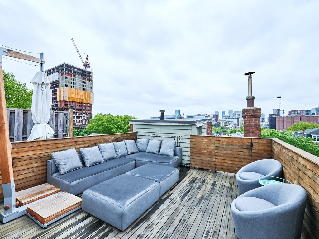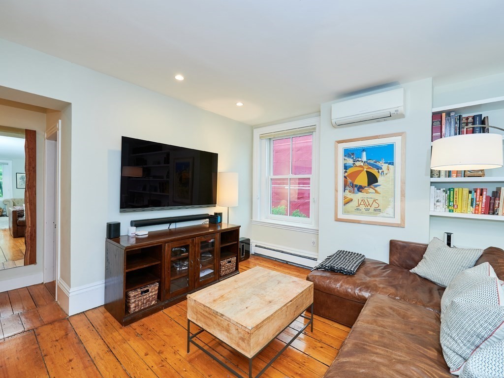 Unique home on two floors with large windows and hardwood floors. Top floor has vaulted ceiling with exposed wood beams and a decorative wood burning stove in an open plan kitchen-living-dining space that opens onto a private roof deck. Below, the third floor has a large second living room with a working fireplace, a primary bedroom and attached bathroom with separate tub and shower, as well as two more bedrooms and a second bathroom. In unit laundry, storage in basement. Located in East Cambridge close to Kendall Square, Lechmere area, lots of parks, easy access to 93 and Green Line.