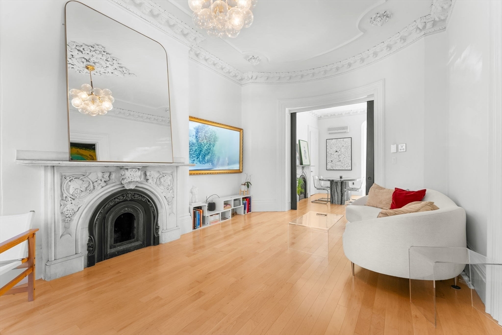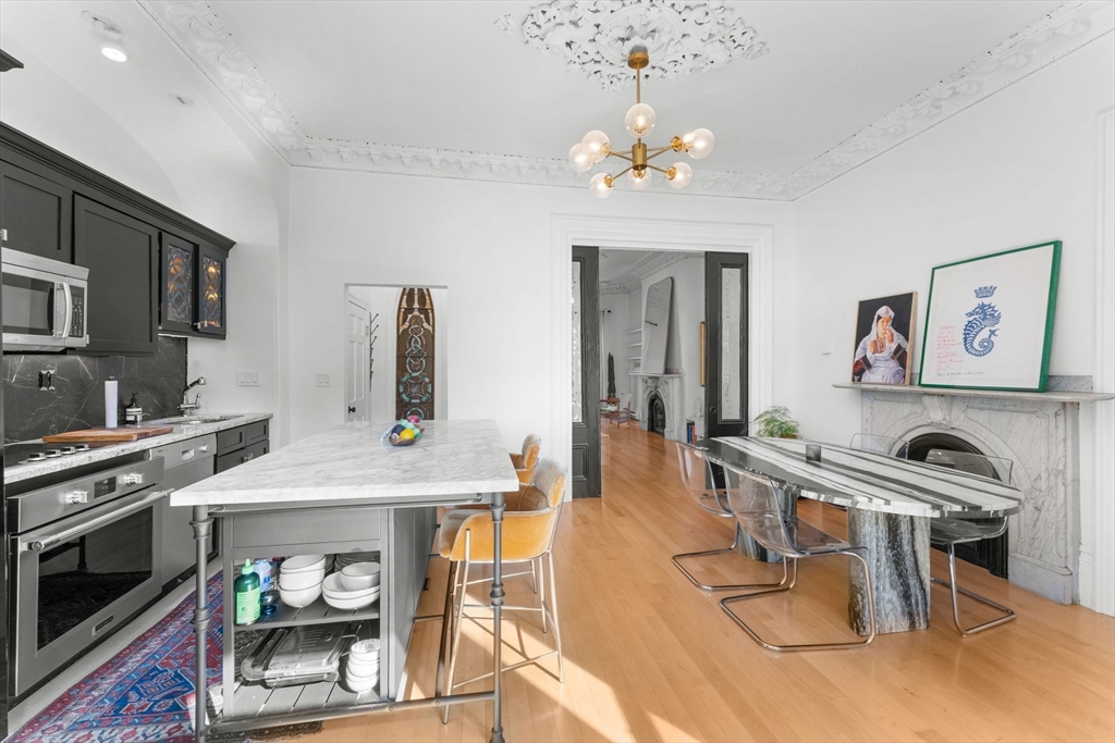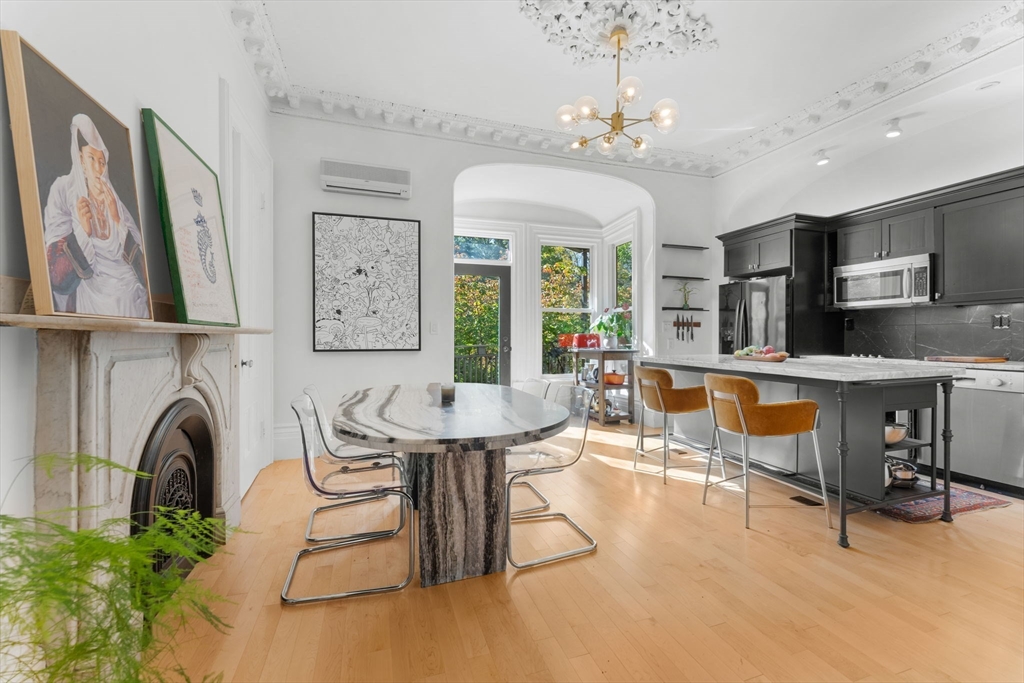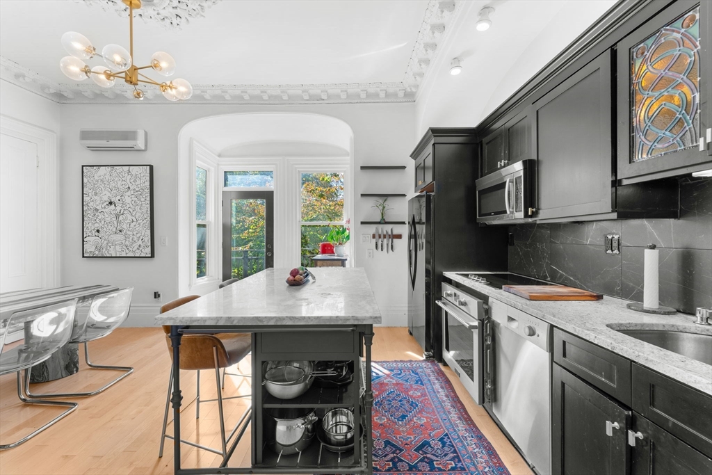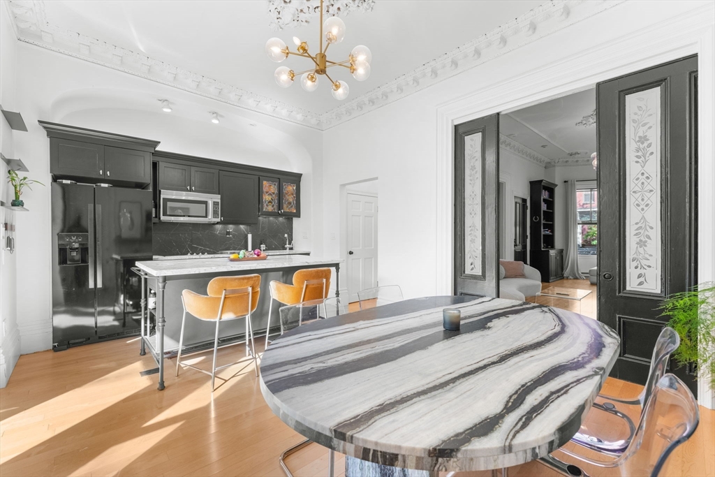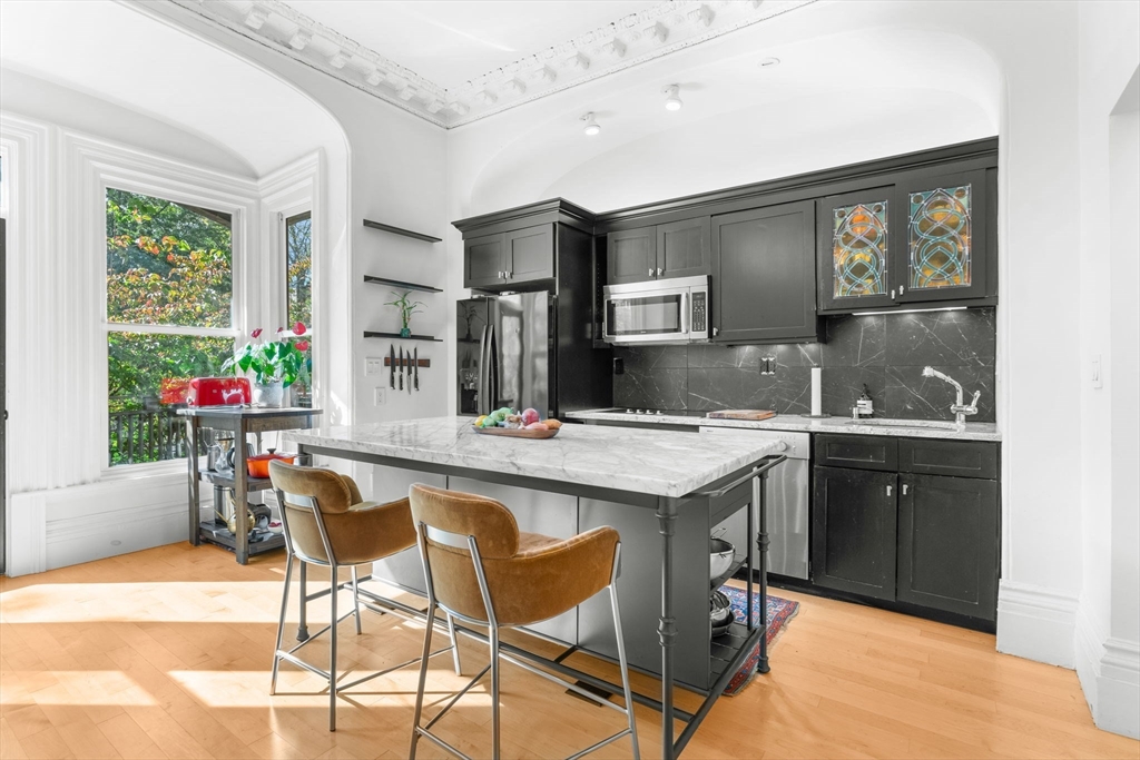 Available 1/1/26 Beautiful stained glass accents this inviting home, ideally set on one of Boston’s most picturesque Victorian squares. This exceptional South End Brownstone duplex combines timeless charm with modern updates. The elegant parlor features high ceilings, intricate moldings, a carved marble fireplace, new hardwood floors, and views of historic Concord Square. Etched-glass pocket doors open to a welcoming dining area and renovated kitchen with new convection cooktop, stainless appliances, granite counters, and a spacious island—perfect for entertaining. Enjoy a sun-filled private deck with southwest exposure and a convenient half bath on the upper level. The lower-level suite offers a large bedroom, flexible study or dressing area, renovated bath, and ample closets. In-unit laundry, electric heat, central A/C, and dedicated parking across the street provide comfort and convenience. Close to cafés, restaurants, Newbury Street, the Prudential Center, and Boston Medical Center