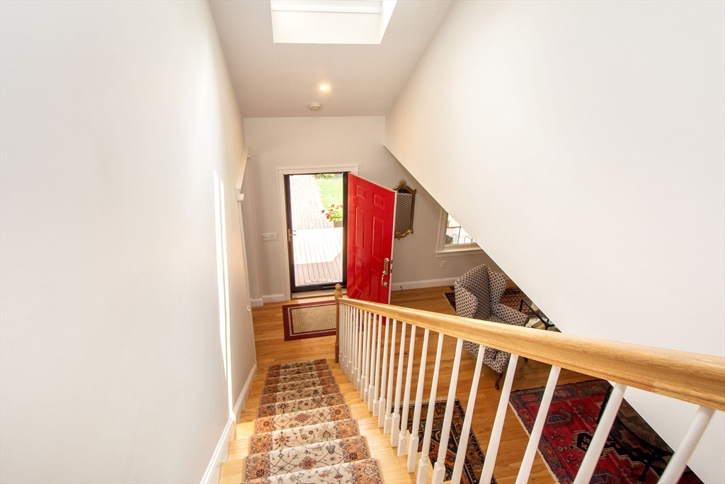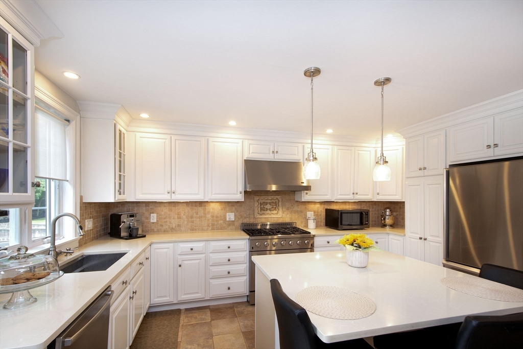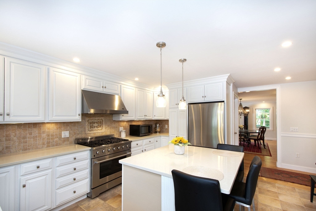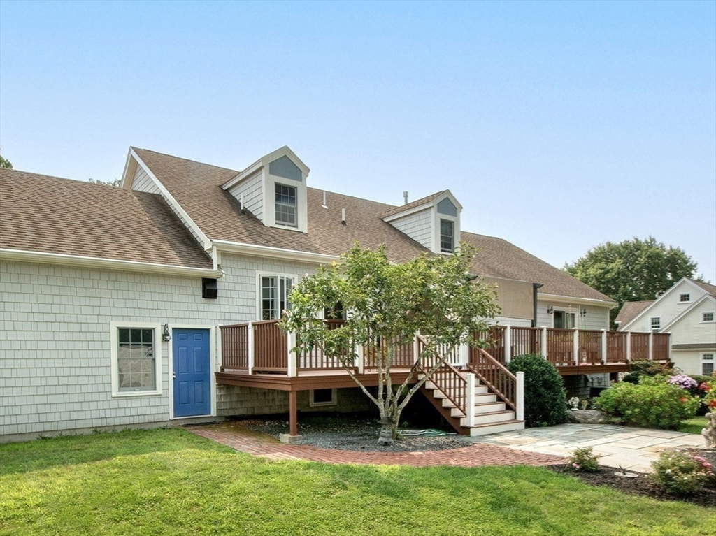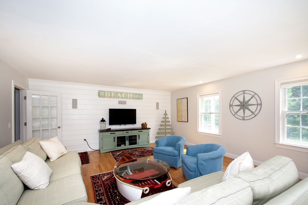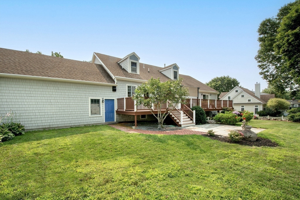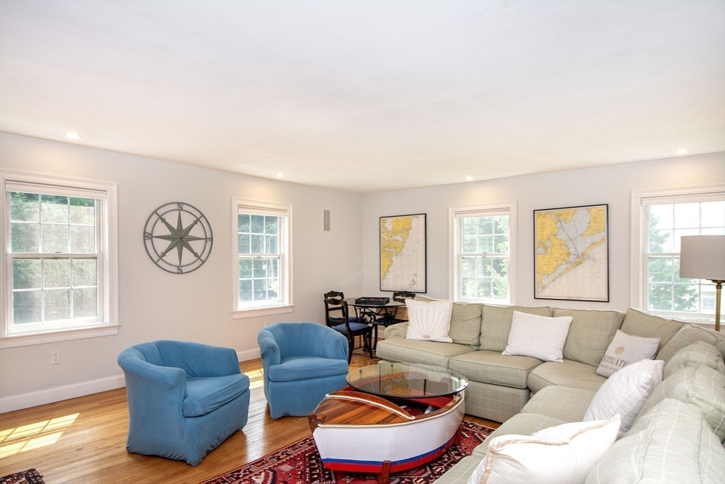 Scituated down a private drive yet in convenient "harbor "location, this spacious home boasts of an expansive first floor primary ensuite with two walk in closets and a updated bathroom with tub and separate tiled shower. Sliders from the bedroom lead to the back deck. The chef of the house will delight in the updated kitchen which features custom cabinets, a 6 burner gas stove with hood vent, and a large center island. The laundry room and pantry are located of off the kitchen. Additionally on the first level is a formal dining room with plenty of space for entertaining, living room with built-in cabinetry and bookcases surrounding a gas fireplace, and a family room which boasts of sound surround and recessed lighting, perfect for "game day". The second floor accommodates two generous size bedrooms and a full bath as well a extra storage space. Enjoy the options of a wooded view from the farmer's porch or relaxing on the expansive back deck overlooking the back yard and patio.