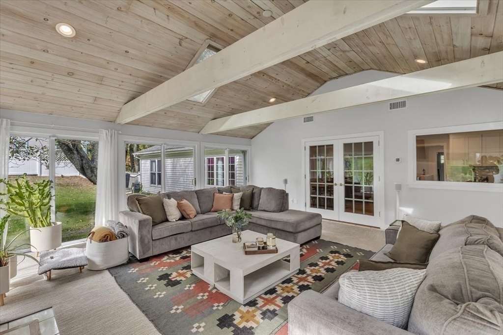 Welcome to this gorgeous, renovated 4 bedroom, 2 bath ranch with 1 car garage. This spacious home offers an open-concept layout perfect for entertaining, a beautiful kitchen with soft close cabinets, granite countertops, and stainless steel appliances. Beautiful hardwood floors throughout and double-sided charming wood-burning fireplace ideal for cozy relaxation that opens to a formal dining room or office. This home also offers a breathtaking sunroom with two skylight bringing in natural lighting, large glass sliding doors that provide a panoramic view, and a gas fireplace leading to a covered deck overlooking the beautiful private backyard—a serene space to unwind and enjoy nature. Major updates include a new roof, high-efficiency HVAC, windows, electrical, plumbing and a newer septic system. The finished lower level provides additional flexible space for a playroom, gym, or office. Conveniently located near all amenities. Don’t miss this exceptional home!