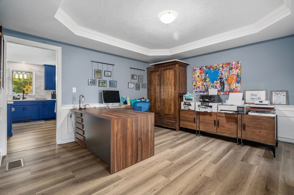 Lovely Colonial in popular Stony Brook Farm Neighborhood. Situated on nearly one half acre, this 9 room, 4 bed, 3 1/2 bath home has all the bells and whistles. The spacious deck overlooks a fenced in rear yard with an inground kidney shaped pool, cabana, a large patio with hot tub, and greenhouse. The focal point of the interior is a newly installed gourmet kitchen with huge island, fully applianced including a wine cooler. Adjacent to the kitchen is the dining/family room with fireplace, a formal dining room is also off the kitchen (presently being used as an office). The upper level features a primary bedroom w/walk-in closet and primary bath. There are 3 additional bedrooms with bath. The finished walk-out basement has an additional bedroom, large living area and a full bath. Updates in the last 2 years include: new roof, newly painted exterior, luxury plank floors, garage doors, rear deck & stone walkway. Nothing to do but move in!