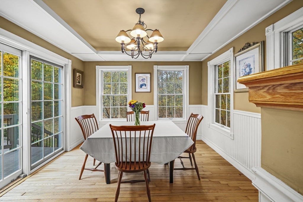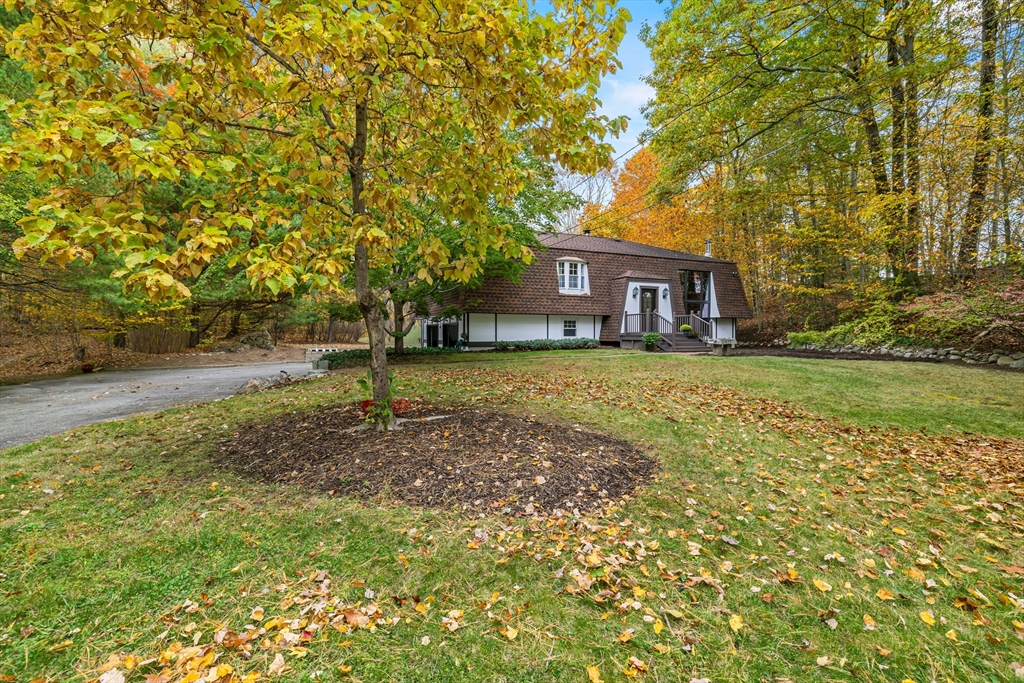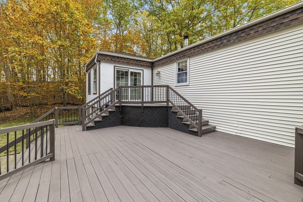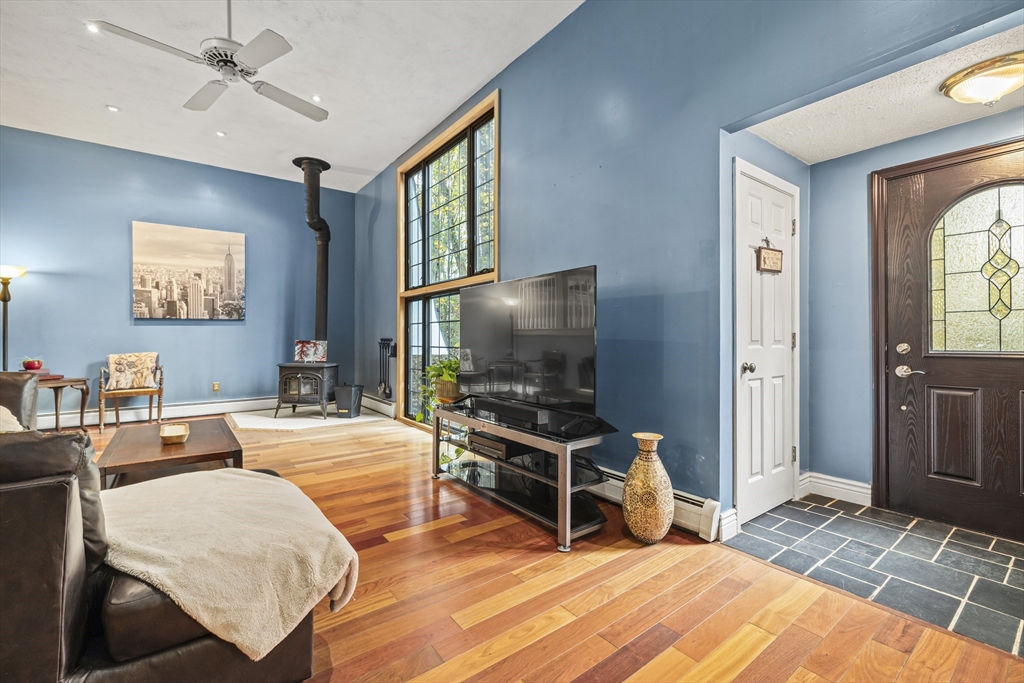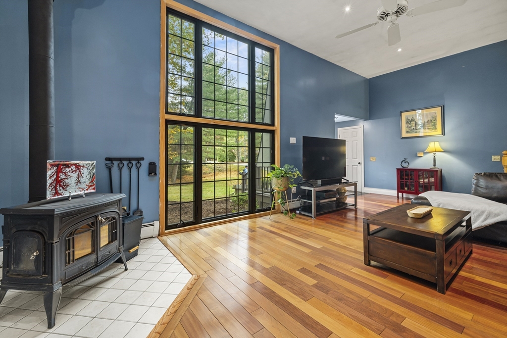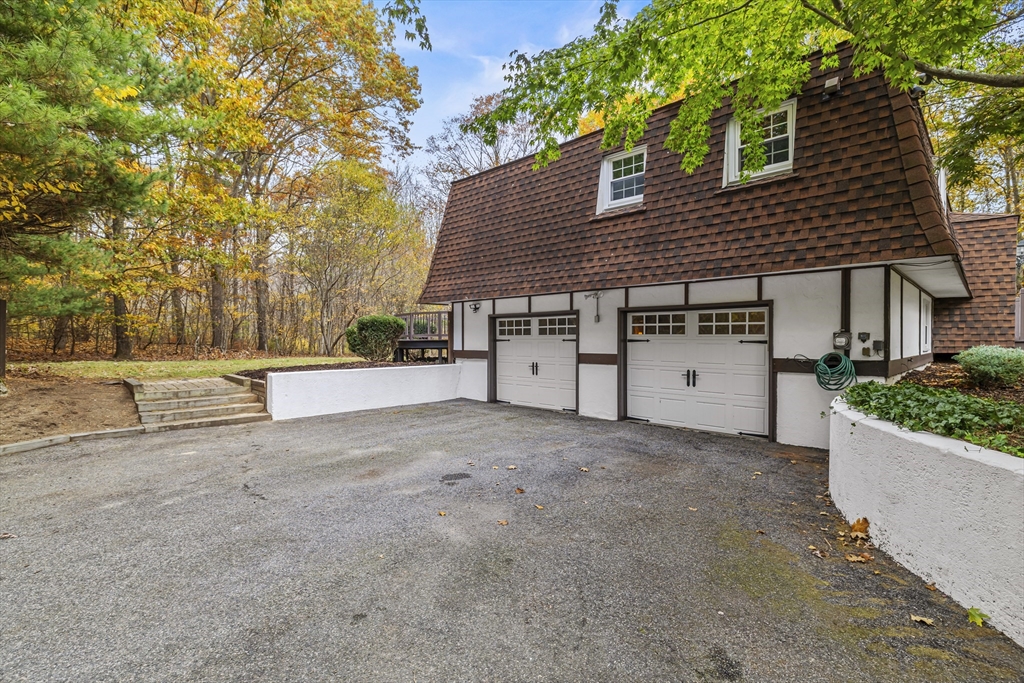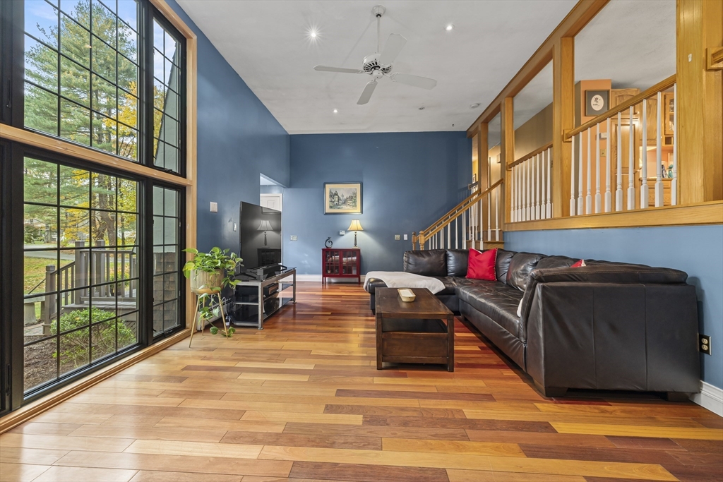 Not your average raised ranch! This custom front-to-back raised ranch offers 7 ms 4 BRs & 2 full baths, incl. a private Main BA.. Nestled at the end of a cul-de-sac & surrounded by conservation land, this home provides exceptional privacy & tranquility.The inviting entryway features double closets as you enter the living room w/floor-to-ceiling newer Andersen windows, Brazilian hardwood floors, and a cozy wood stove. The open floor plan upstairs includes a spacious kitchen with breakfast bar overlooking the liv rm & dining rm w/slider to 2-tier 500 sf deck. Down the hall are three bedrooms—all with hardwood flooring including the Main Bedroom with full BA & heated towel rack. The lower level offers a fourth bedroom, perfect for guests, an office, or flexible living space.Additional highlights include a Buderus boiler w/4 zone heat and an oversized two-car garage under. Set on a magnificent lot, this home combines comfort, craftsmanship, and a serene natural setting.