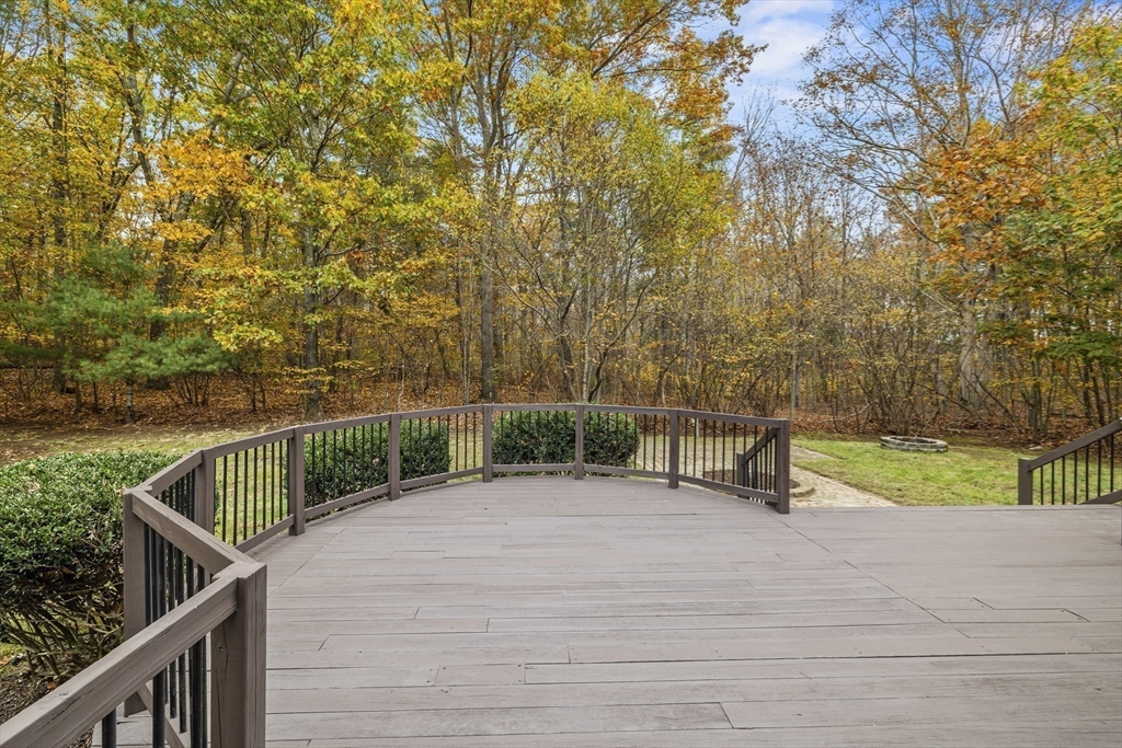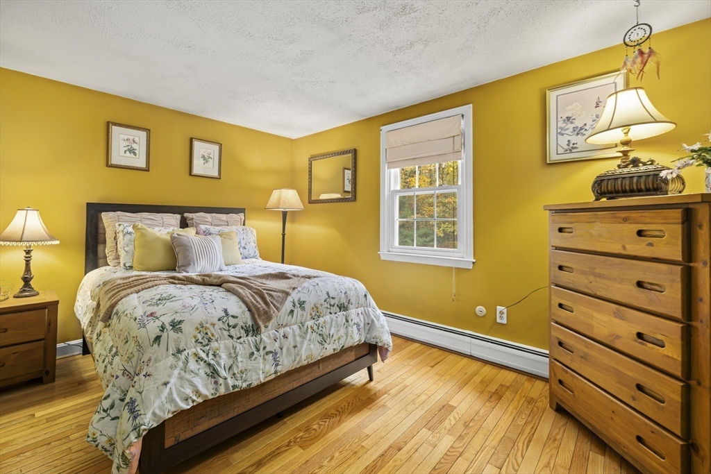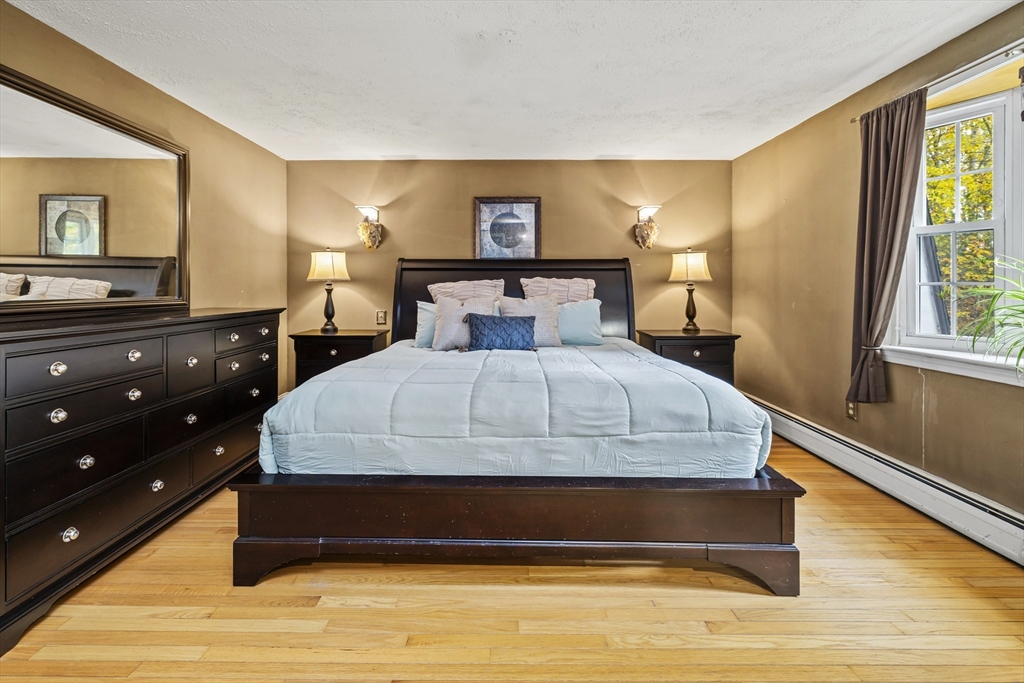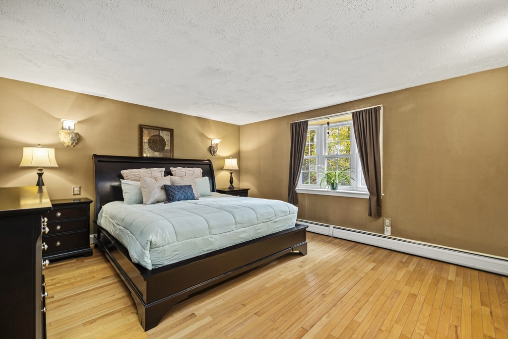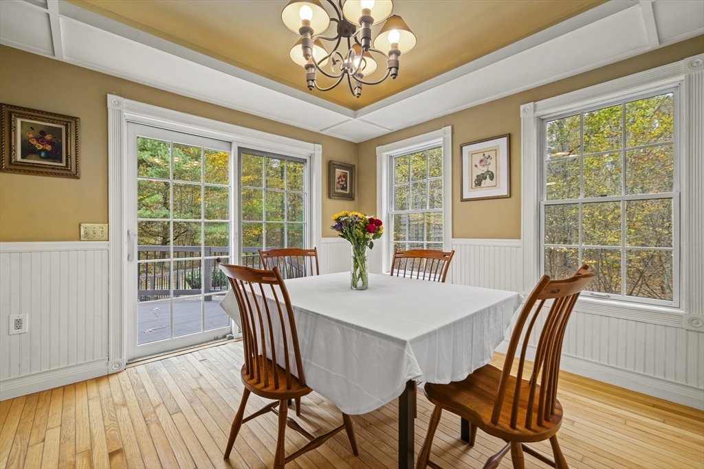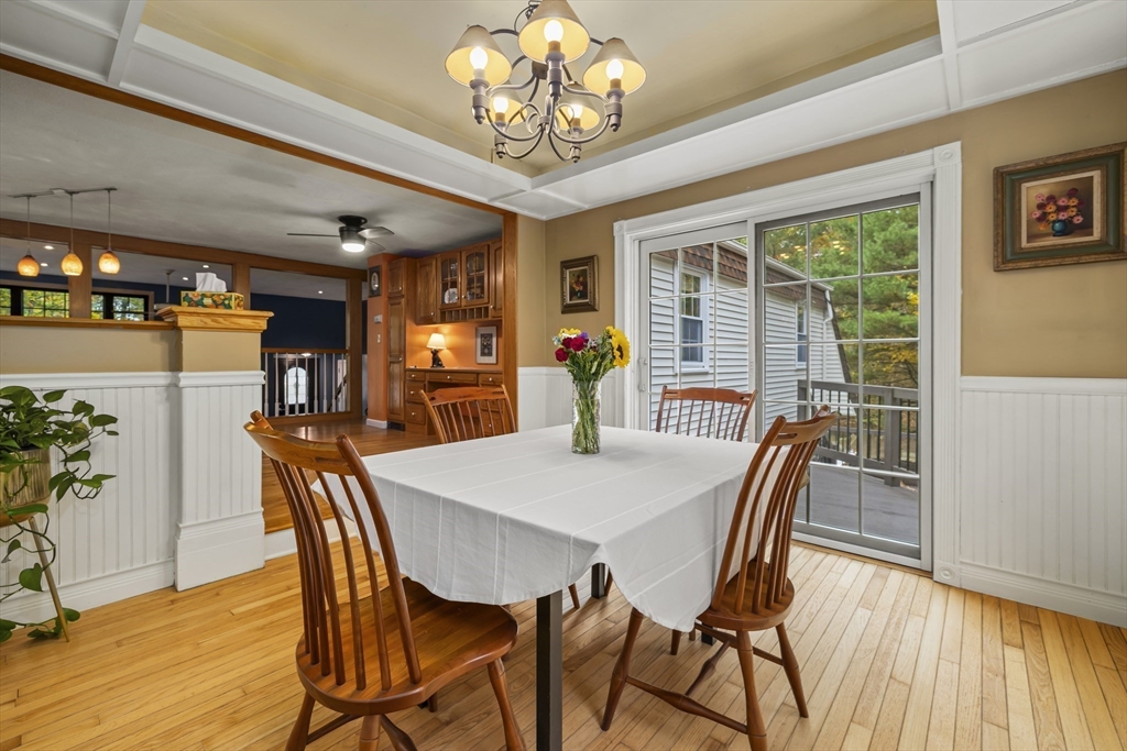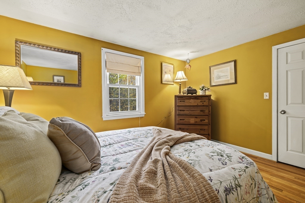 Not your average raised ranch! This custom front-to-back raised ranch offers 7 ms 4 BRs & 2 full baths, incl. a private Main BA.. Nestled at the end of a cul-de-sac & surrounded by conservation land, this home provides exceptional privacy & tranquility.The inviting entryway features double closets as you enter the living room w/floor-to-ceiling newer Andersen windows, Brazilian hardwood floors, and a cozy wood stove. The open floor plan upstairs includes a spacious kitchen with breakfast bar overlooking the liv rm & dining rm w/slider to 2-tier 500 sf deck. Down the hall are three bedrooms—all with hardwood flooring including the Main Bedroom with full BA & heated towel rack. The lower level offers a fourth bedroom, perfect for guests, an office, or flexible living space.Additional highlights include a Buderus boiler w/4 zone heat and an oversized two-car garage under. Set on a magnificent lot, this home combines comfort, craftsmanship, and a serene natural setting.
