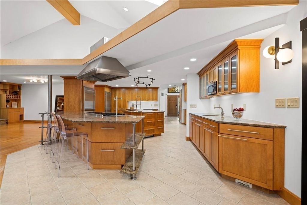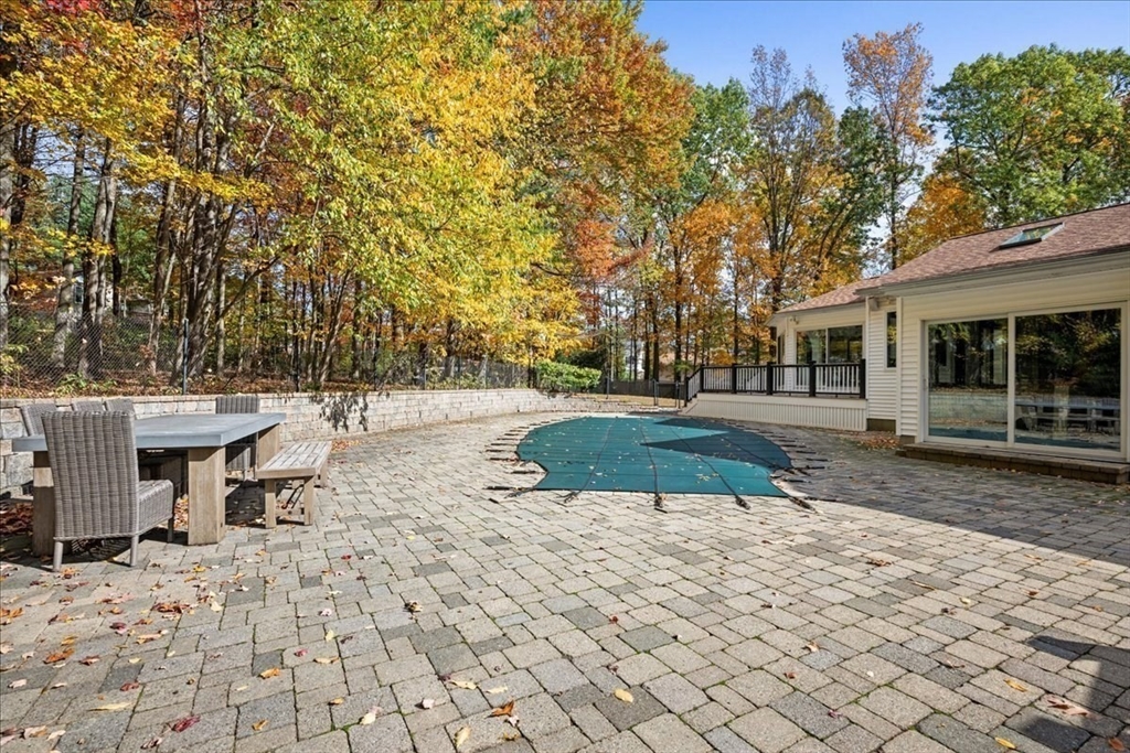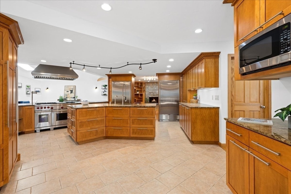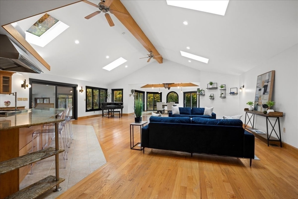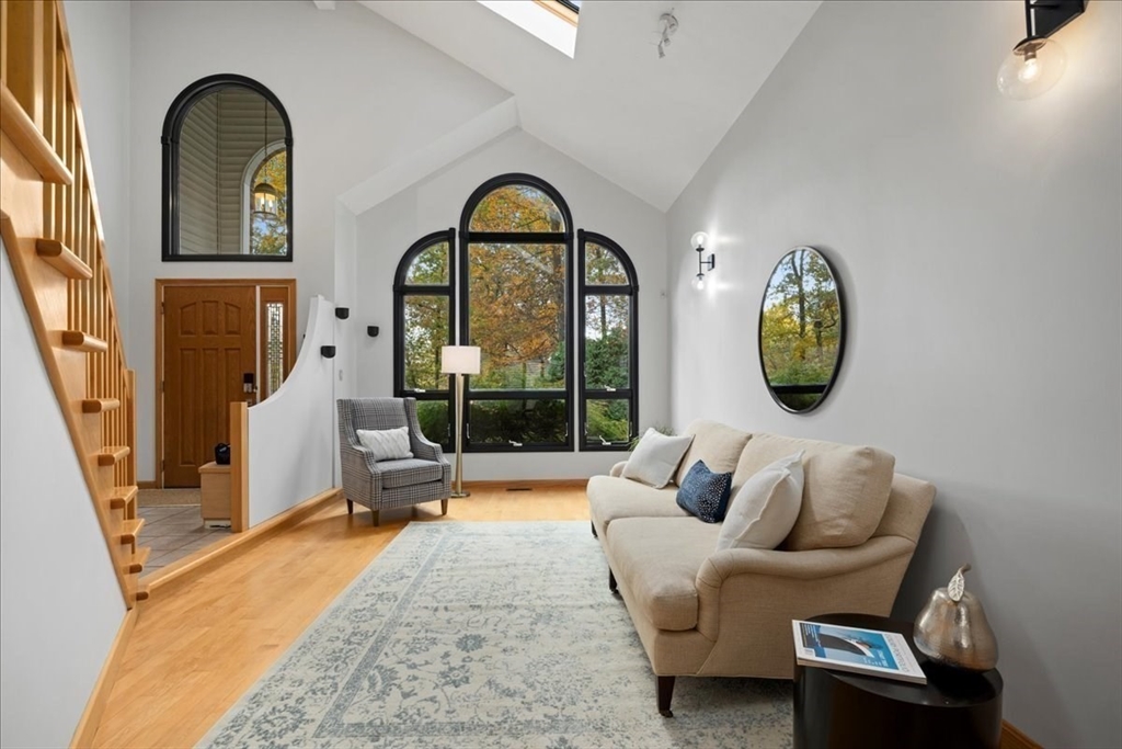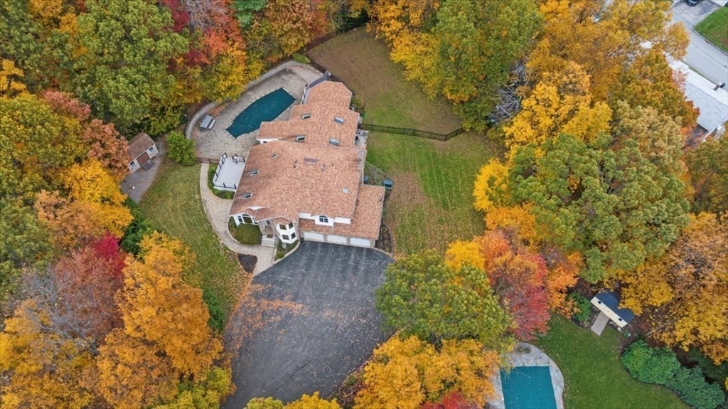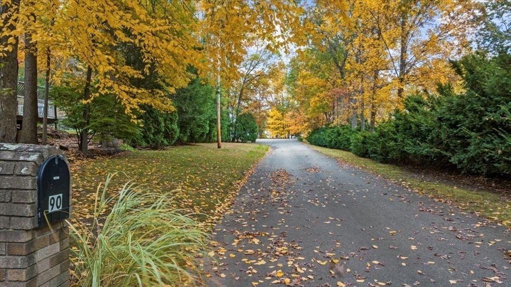 Set back for ultimate privacy- this stunning estate-style property is surrounded by mature trees and features a long, elegant driveway leading to an enchanting modern masterpiece. Inside, an impressive vaulted Great Room with skylights opens to a chef’s kitchen with top-of-the-line appliances, while the vaulted living and dining area showcases beautiful maple floors. The Primary Suite offers hardwood floors, a bay window, and a spa-style bath with soaking tub, separate shower, and double sinks. Step outside to enjoy the heated in-ground pool, expansive patio, and outdoor entertainment area overlooking sweeping lawns. The finished lower level provides exceptional in-law potential with a bonus kitchen, full bath, media room, living room, den, and two additional flexible rooms ideal for offices, guest space, or a fitness area. A truly special property in a fantastic location—private yet convenient, with easy access to amenities. Welcome to 90 Lynnwood Lane.