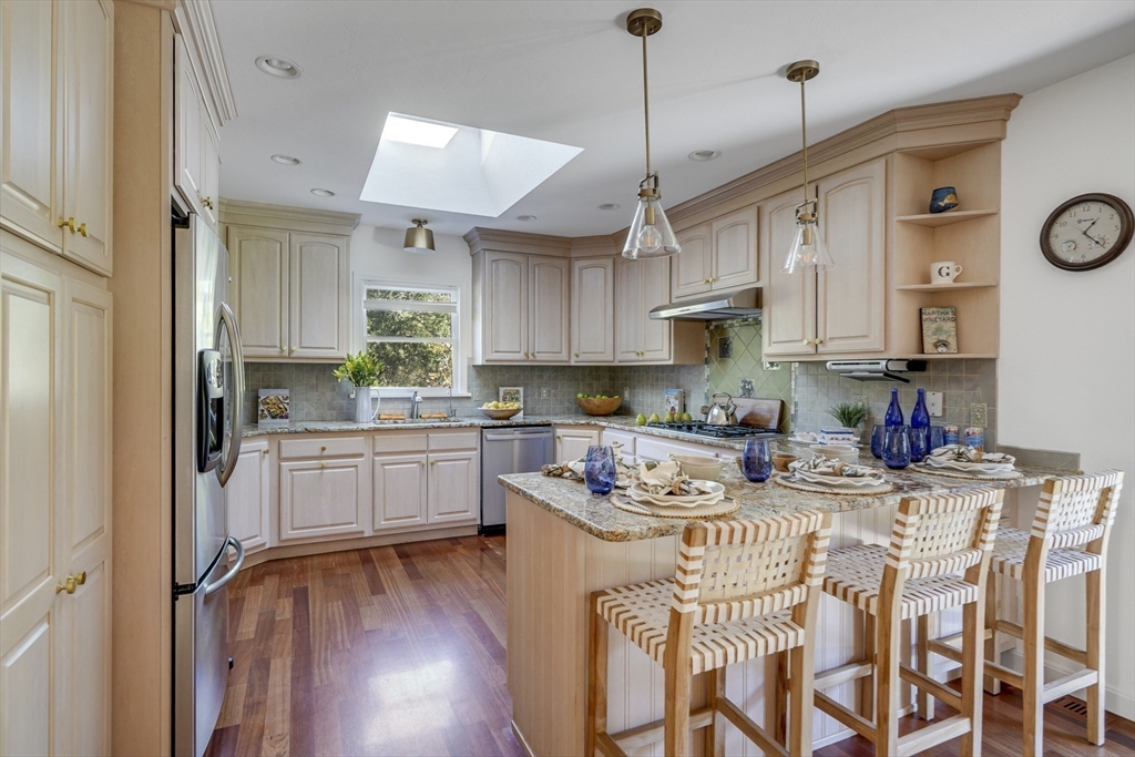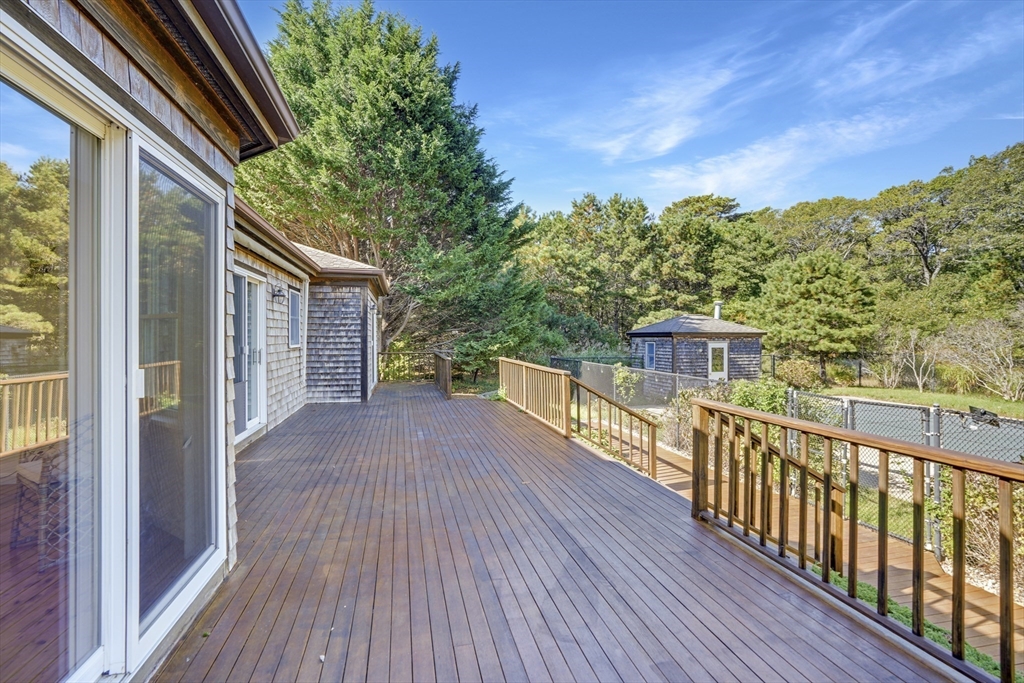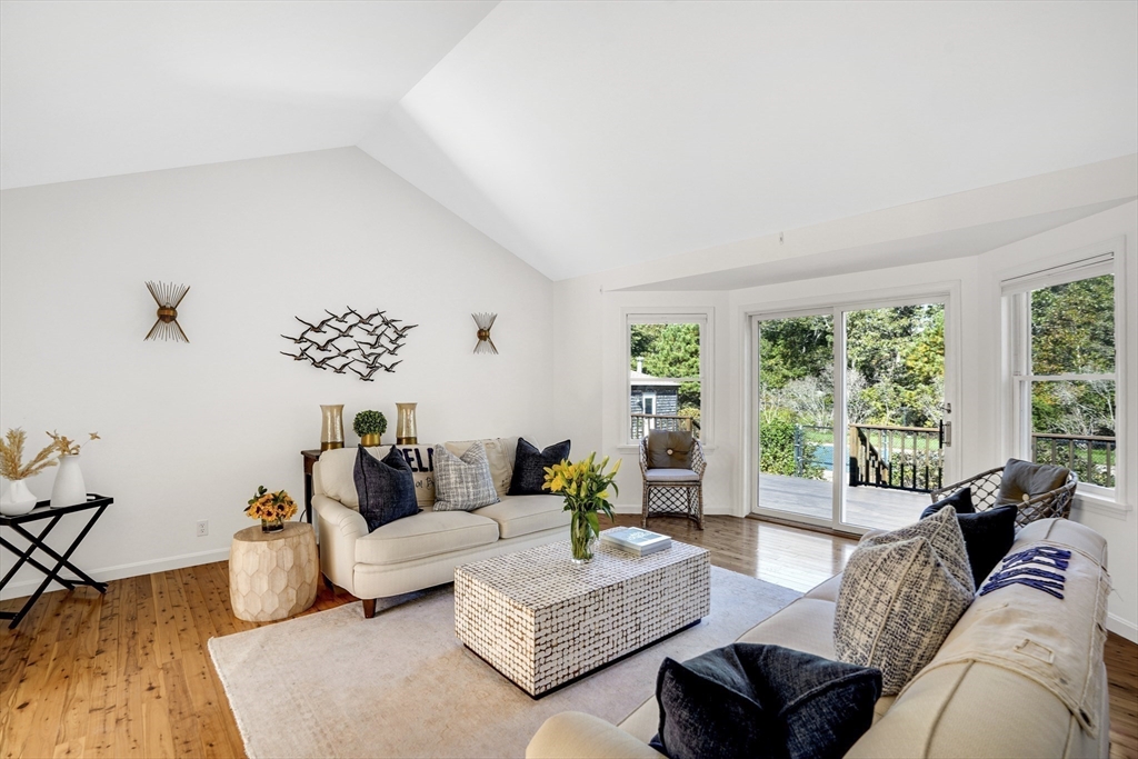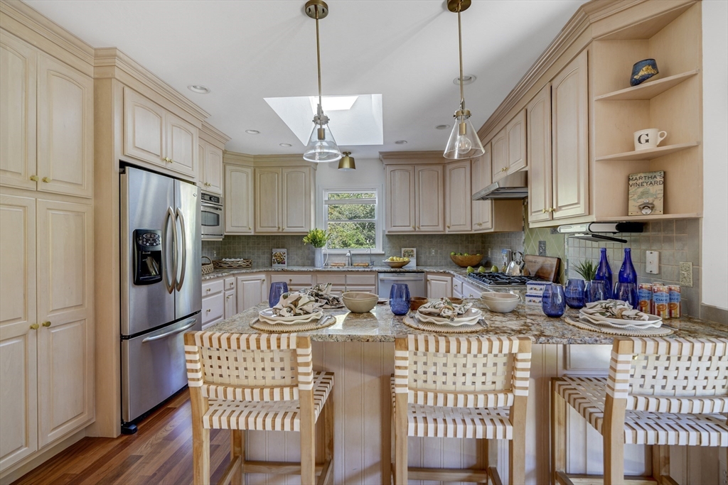 Your private oasis with a POOL awaits in this beautifully updated Lagoon Hills retreat on over 1.5 acres. Enjoy a carefree, single-level lifestyle featuring an open-concept kitchen and dining area, spacious living room, office and exercise room — all thoughtfully designed for comfort and flow. Step outside to a stunning backyard anchored by a sparkling pool, surrounded by decks, patios, and lush landscaping with stone walls, specimen trees, and a goldfish pond with a waterfall. Additional amenities include a pool house, a detached one-car garage/workshop, an oversized two-car garage, and a full basement—perfect for extra storage or hobbies. With private access to Lagoon Pond, this park-like property offers the ultimate blend of indoor-outdoor living and tranquility. A rare Vineyard gem designed for entertaining, relaxation, and easy island living.