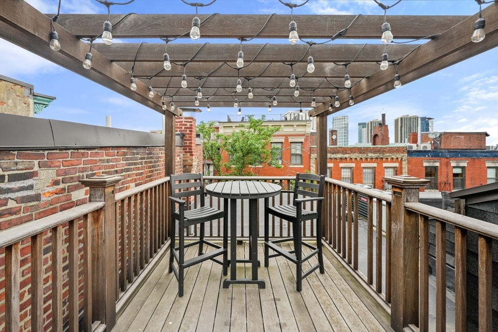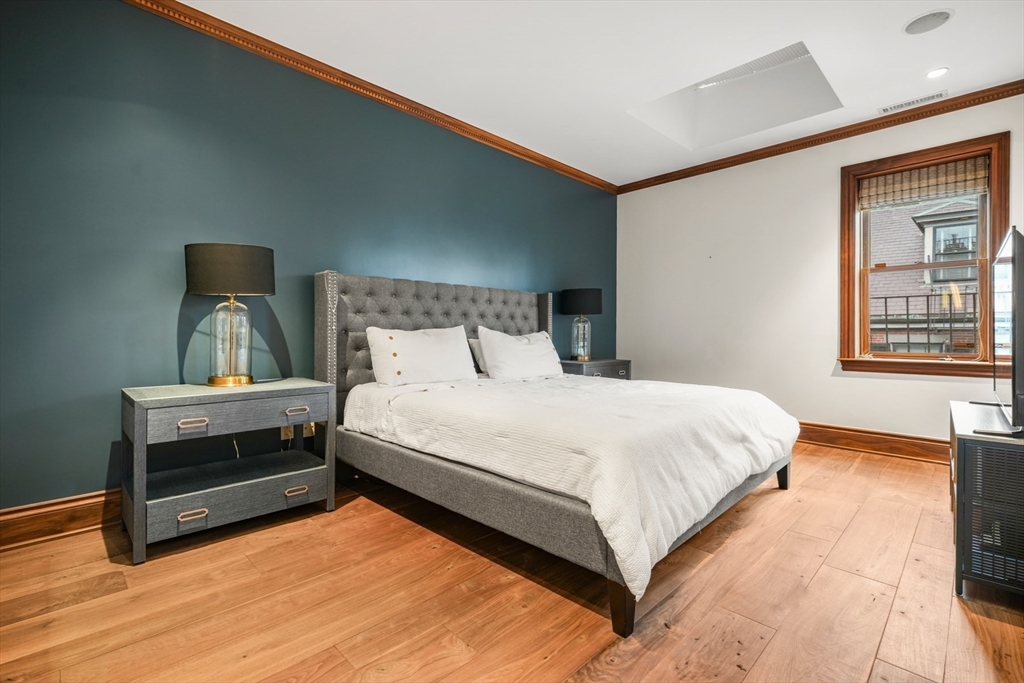 Located atop Beacon Hill, this meticulously renovated townhome stands proudly on the sunny south side of Myrtle Street. Behind its cheerful yellow brick façade lies a charming upper triplex with a private roof deck plus a versatile one-bedroom garden apartment—usable as part of the main residence or easily closed off with its own entrance and patio. The elegant parlor level offers a refined front sitting room with gas fireplace and a spacious dining area opening to a bright south-facing kitchen with center island and ample counter seating. The second floor hosts a generous media room with wet bar, full bath, and guest suite. The top-level primary suite features a king-size bedroom illuminated by multiple skylights, a newly renovated spa-like bath with soaking tub, heated limestone floors, double onyx sinks, custom walnut built-ins, and a large dressing area with laundry. The bi-level mahogany roof deck, plumbed for gas, showcases sweeping views of Beacon Hill & Back Bay.