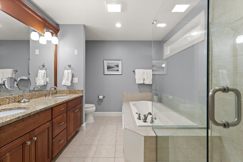 THIS IS A NON AGE RESTRICTED CONDO! SEE MLS#73448492 .Sophisticated, airy & bright end unit condo blending elegance & comfort. Perfectly positioned at the rear of the complex, this stunning 3 bedroom home enjoys tranquil views of conservation land. A soaring vaulted ceiling w/ skylight, gas fireplace, gleaming hardwoods, & refined moldings set the tone for quality throughout. The expansive kitchen features cherry cabinetry, stainless steel appliances, a peninsula, & an inviting eat-in area with sliders to the deck. The formal dining room shines with wainscoting & a custom bar w/ glass-front cherry cabinetry, ideal for entertaining. A 1st floor office w/ tailored built ins provides an inspiring workspace. Upstairs includes 3 spacious bedrooms, including a luxurious primary suite, plus convenient second floor laundry. The finished walk out lower level with full bath expands the living space, perfect for a media room, guest suite, or gym. Two car garage and prime Sudbury location!