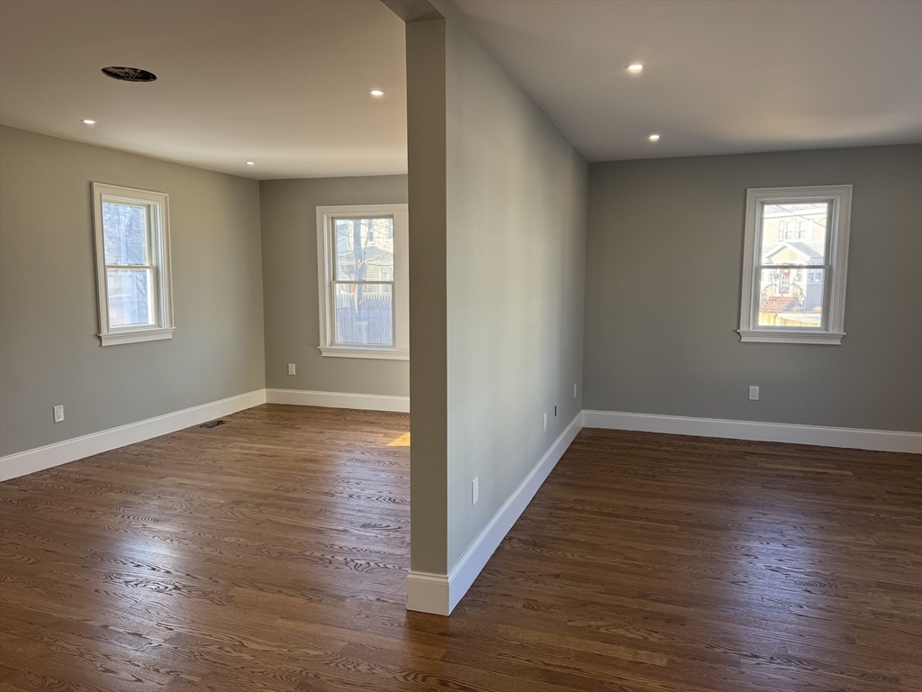 Striking 4-bedroom, 3.5-bath home offering approx. 3,200 sq ft of living space.Full gut renovation. The first floor features an open-concept layout w/ custom-cabinet kitchen, large dining area, and spacious living room with direct access to an expansive 180-degree rear deck overlooking the yard. The second floor offers four generously sized bedrooms, including a primary suite with tall ceilings, walk-in closet, and private bath with double vanity, tiled shower, and soaking tub. Second-floor laundry for added convenience. The fully finished basement provides flexible bonus space ideal for a gym, office, playroom, media room, guest area, or potential in-law setup. Corner lot with driveway parking and garage. Equipped with central heat and central AC, all new mechanicals, new roof, siding, windows, and upgraded electrical and plumbing. Conveniently located near shops, restaurants, parks, and everyday amenities with easy access to major commuter routes, bus lines, the commuter rail, and T.