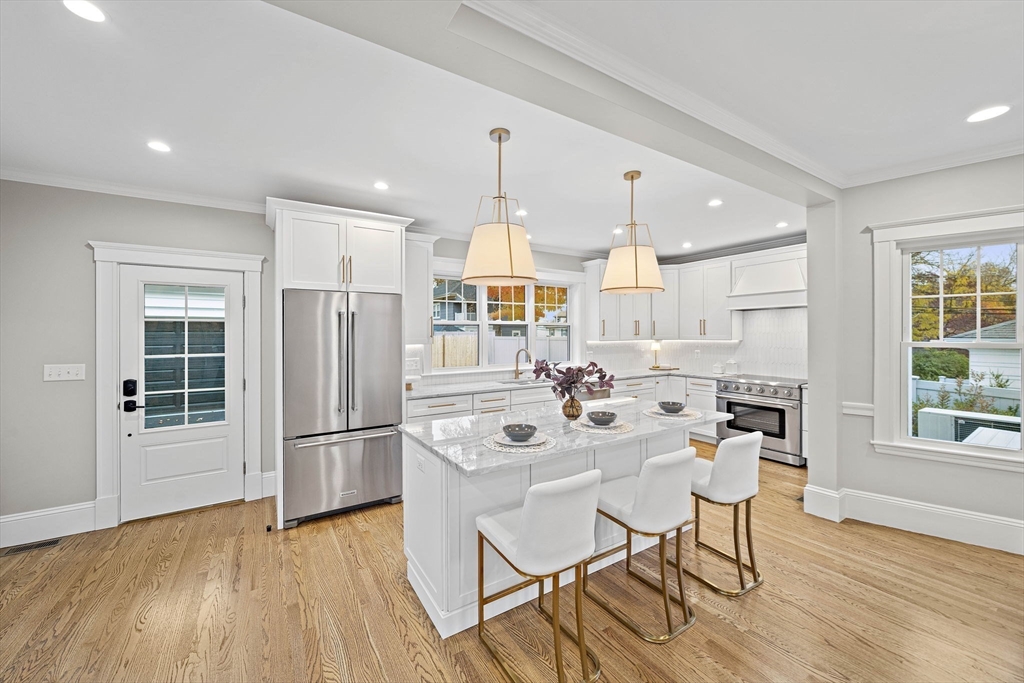 Like new construction, this immaculately transformed and professioanlly designed home seamlessly blends modern luxuries with its original craftsman character. The exterior bosts Hardie board siding, new windows, garage doors and stunning landscaping. Enter the front mudroom before stepping into the foyer which is complemented by views of gleaming wood floors throughout. The nicely sized LR features a wood fireplace and office nook while the open kitchen and DR serve as the heart of the home. The showstopping kitchen is highlighted by an enormous island, glamourous fixtures, upgraded cabinets and stylish quartz counters. A second built in mudroom area is perfectloy situated at the backdoor which offers access to the private backyard and 2 car garage. Upstairs find an amazing primary suite with magazine worthy full bath as well as 2 additioanl bedrooms and common bath. The lower level offers a 4th bedroom, full bath and family room space! Stroll downtown from this impecable location!
