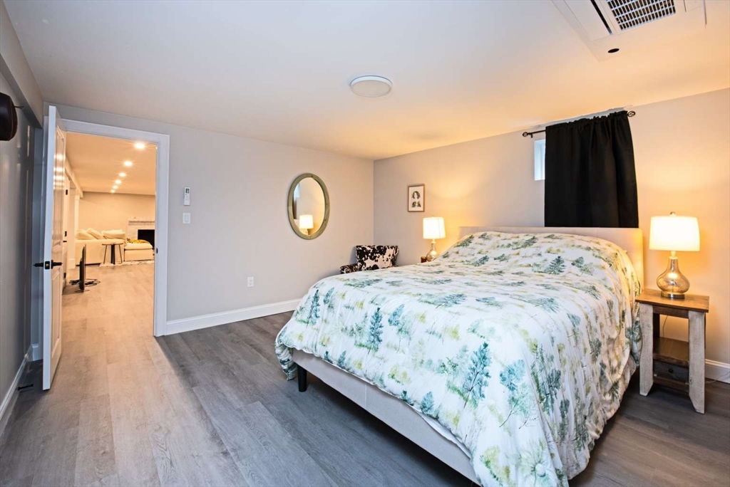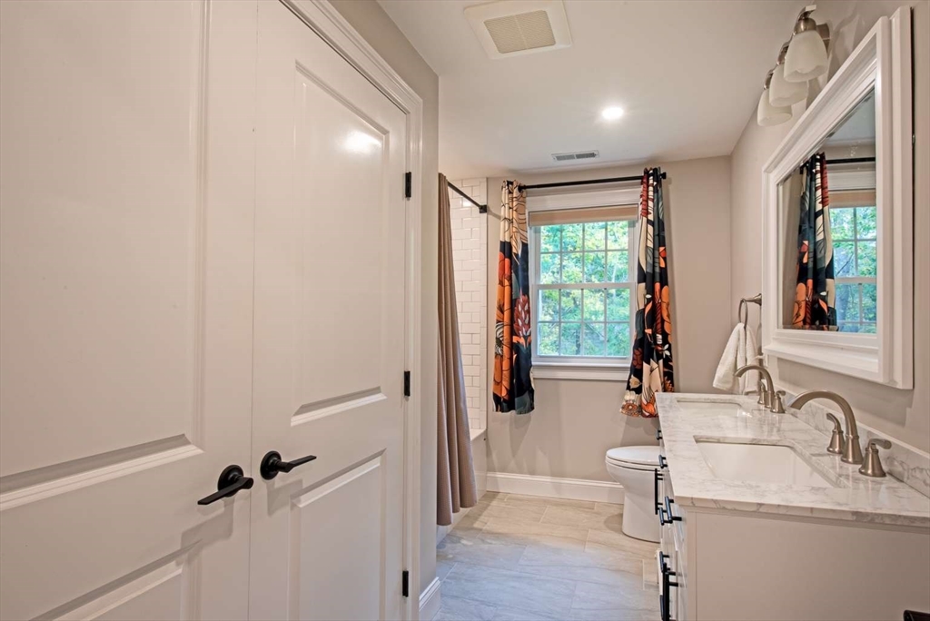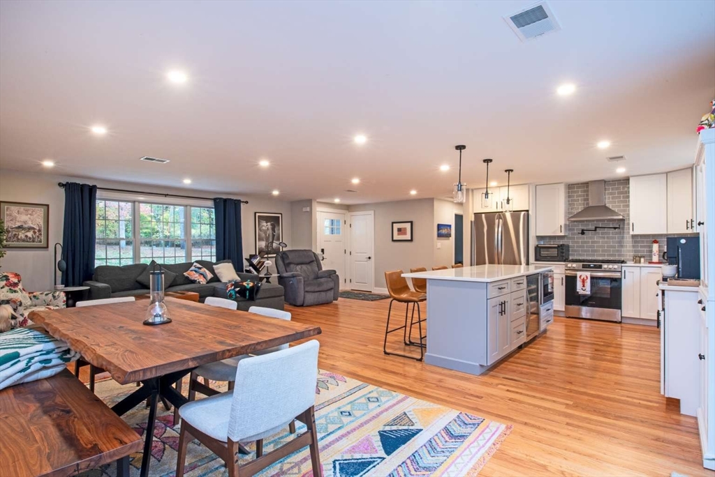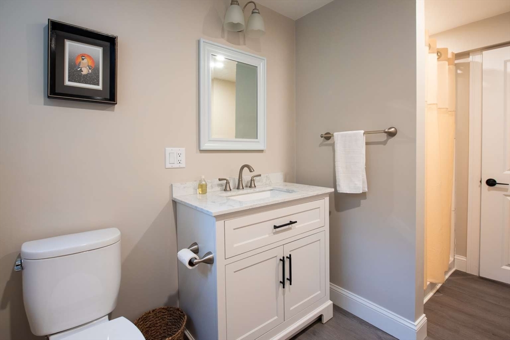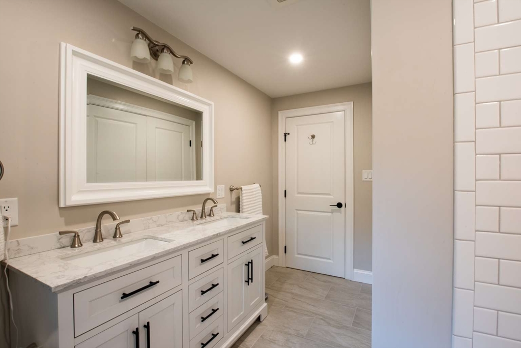 Completely renovated 3 Bedroom, 3 full bath custom ranch home with large covered front porch in highly desirable neighborhood. Open floor plan kitchen, dining and living room with wood burning fireplace & slider to large new rear deck. Kitchen with white shaker cabinets, large center island, custom quartz countertops and new stainless-steel appliances. First floor includes primary suite with custom walk-in closet, en-suite luxury bath with walk-in glass enclosed shower, 2 additional spacious bedrooms and laundry. Large lower level includes a den with wet bar and fireplace, game/exercise room, office, full bath, plenty of storage and walk out to large patio and level yard. Two car attached garage leading to the kitchen via mudroom with custom coat tree. Additional features include 200 amp electrical service, gas forced air heating, central A/C, and on-demand water heater. Large corner lot, town beach nearby. Top-rated public schools. Commuter dream location close to all major routes.