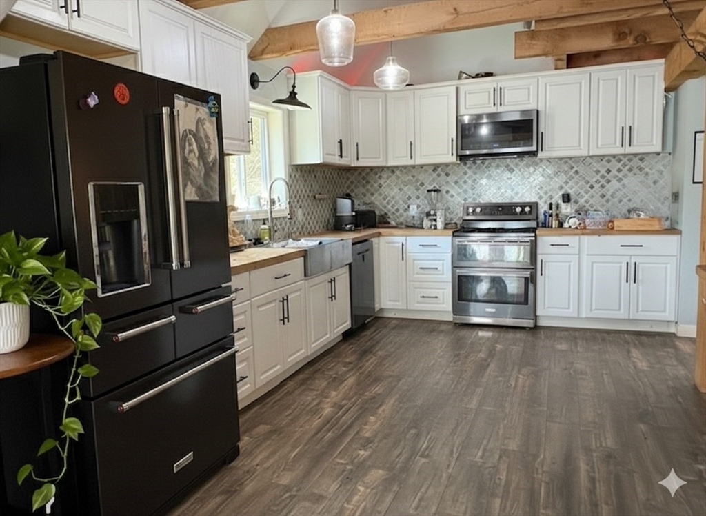 Discover the exceptional lifestyle ideally set on 39 acres along the West Brookfield/Warren line. This single-family home also has Lower-level living quarters featuring a full kitchen and bath with separate ground floor entrance and blends rustic charm with modern sophistication. The open-concept kitchen features exposed timber beams, white cabinetry, butcher-block counters, a farmhouse sink, and stainless appliances and a cozy wood burning fireplace-, creating a perfect space for everyday living or entertaining. Soaring ceilings and hand-crafted details continue through the main level, highlighted by a sleek wall-mounted electric fireplace. Upstairs, a custom iron-baluster railing overlooks the living area, adding architectural appeal. Enjoy the tranquility of 39 acres while being just 2.7 miles from Lake Wickaboag Town Beach for boating, swimming, and summer fun. A rare opportunity for turnkey country living with easy access to major routes, Sturbridge, and area amenities.