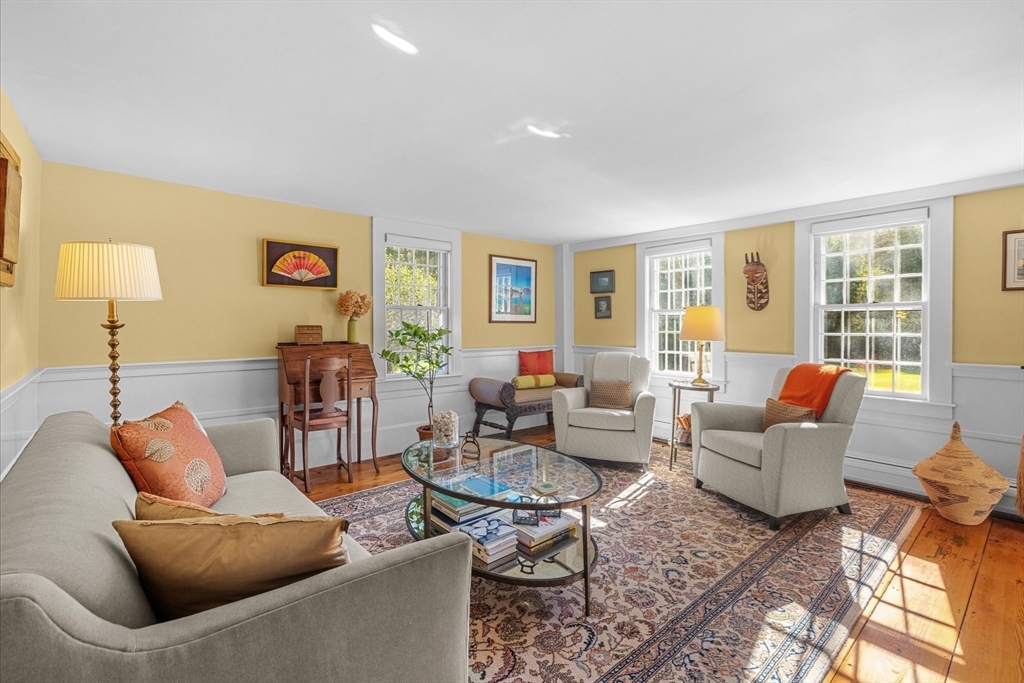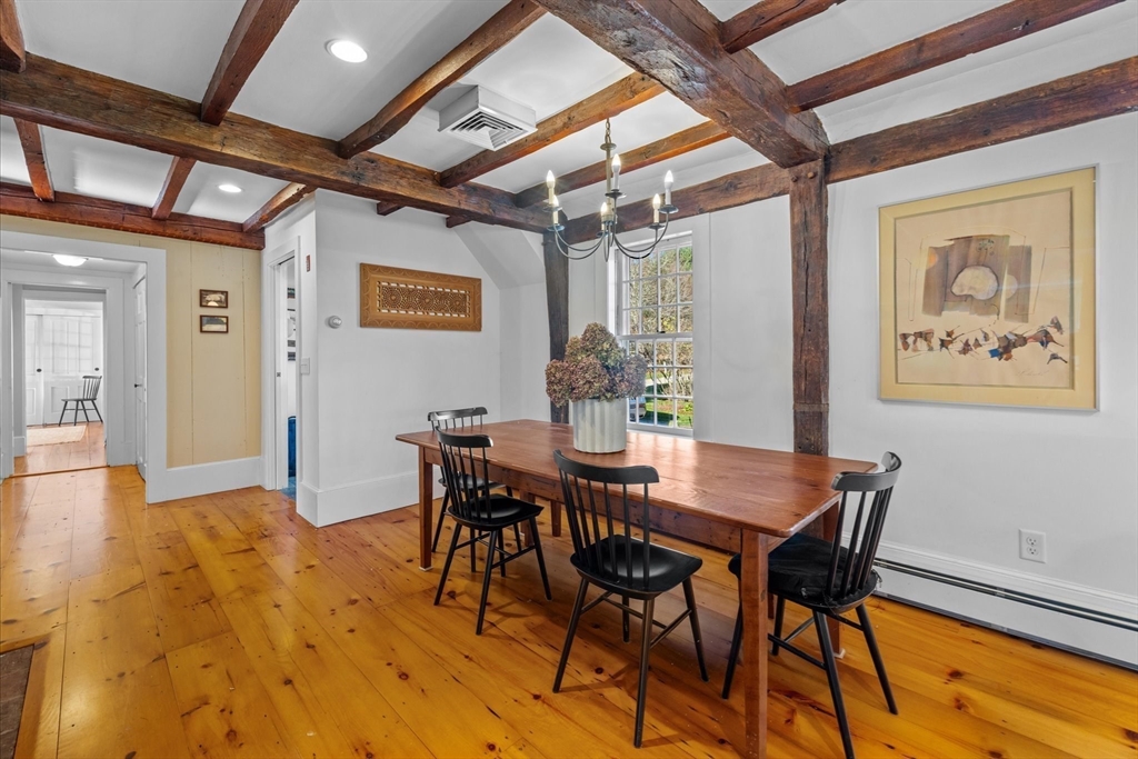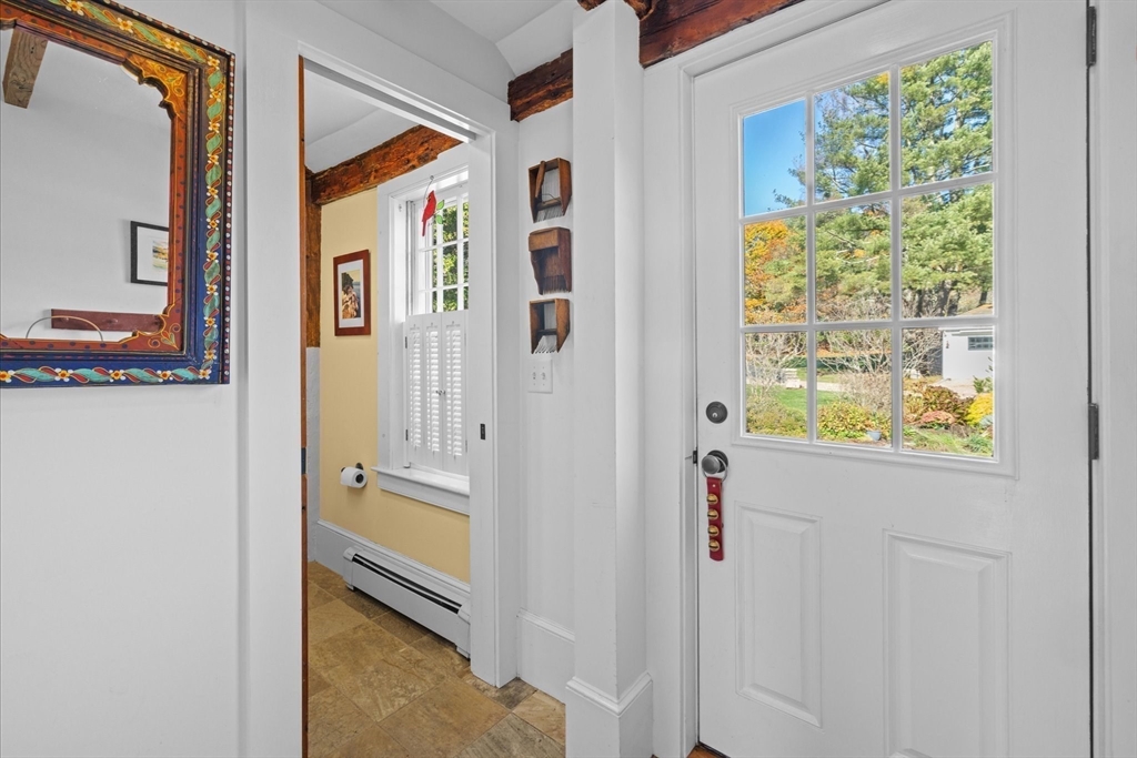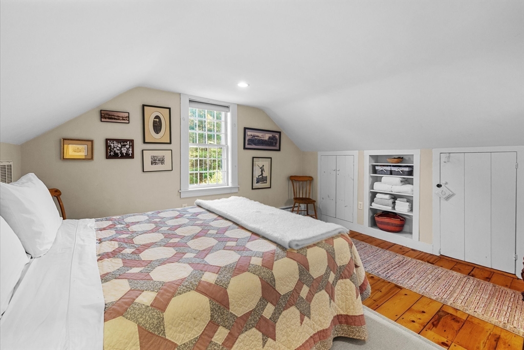 Meet The Samuel Weston house, set on 1.5 open, level acres at the end of a quiet private drive. This home is a rare find - part sanctuary, part storybook retreat. The setting alone is enough to make you pause: mature trees, garden-ready grounds, and an easy sense of privacy within an established neighborhood. Inside, light and warmth, wide pine floors and exposed beams define the living space. A newer white cabinet kitchen with a cozy fireplace overlooks fruit trees and the lush green yard beyond. The first-floor primary suite provides the convenience of single-level living, complete with abundant closets and a white-tiled bath. A den and library with built-ins offer intimate spaces for reading or reflection, while the second level adds two charming bedrooms connected by a full bath and the home’s signature “good morning” staircase. Outdoors, a two-car garage with sliding barn-style doors recalls the craftsmanship of another era, a reminder that beauty and function can coexist.