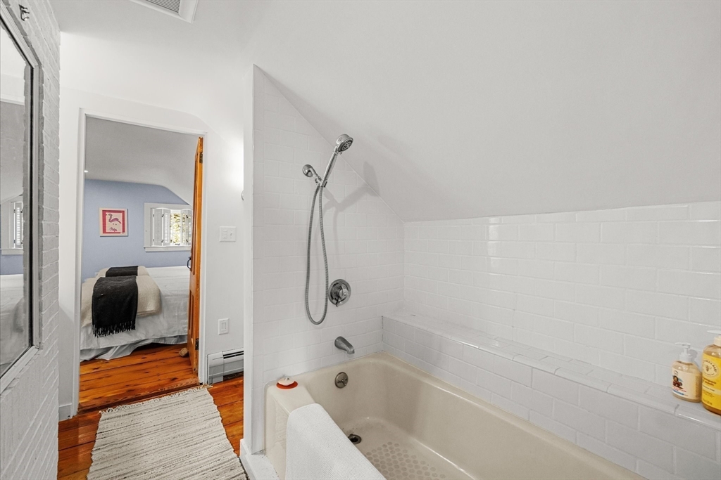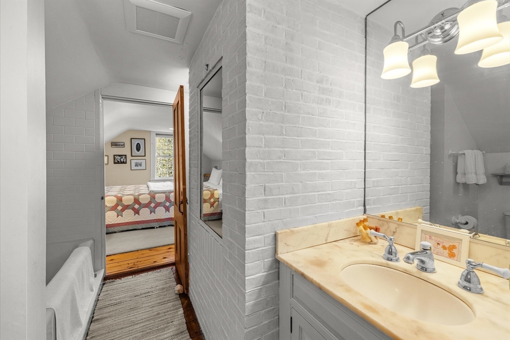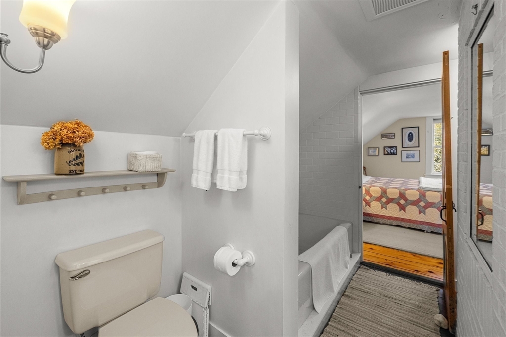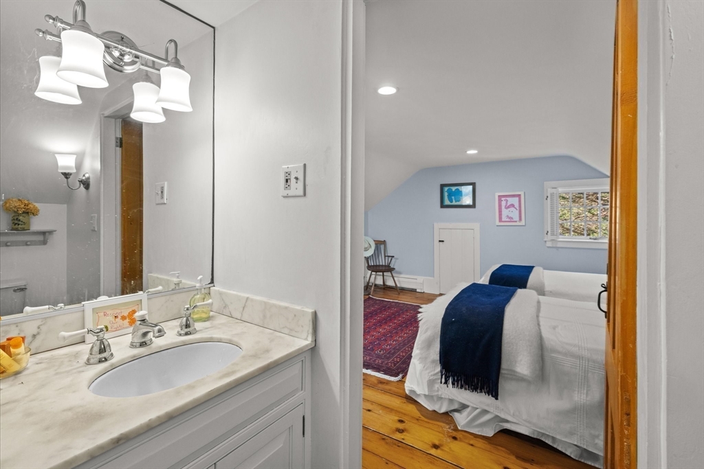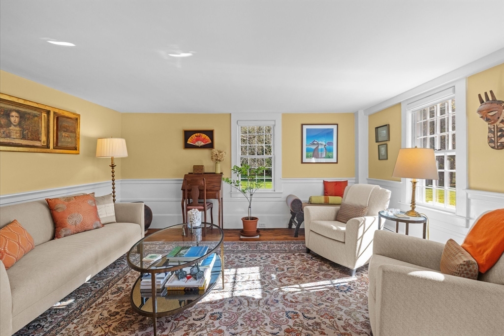 Meet The Samuel Weston house, set on 1.5 open, level acres at the end of a quiet private drive. This home is a rare find - part sanctuary, part storybook retreat. The setting alone is enough to make you pause: mature trees, garden-ready grounds, and an easy sense of privacy within an established neighborhood. Inside, light and warmth, wide pine floors and exposed beams define the living space. A newer white cabinet kitchen with a cozy fireplace overlooks fruit trees and the lush green yard beyond. The first-floor primary suite provides the convenience of single-level living, complete with abundant closets and a white-tiled bath. A den and library with built-ins offer intimate spaces for reading or reflection, while the second level adds two charming bedrooms connected by a full bath and the home’s signature “good morning” staircase. Outdoors, a two-car garage with sliding barn-style doors recalls the craftsmanship of another era, a reminder that beauty and function can coexist.