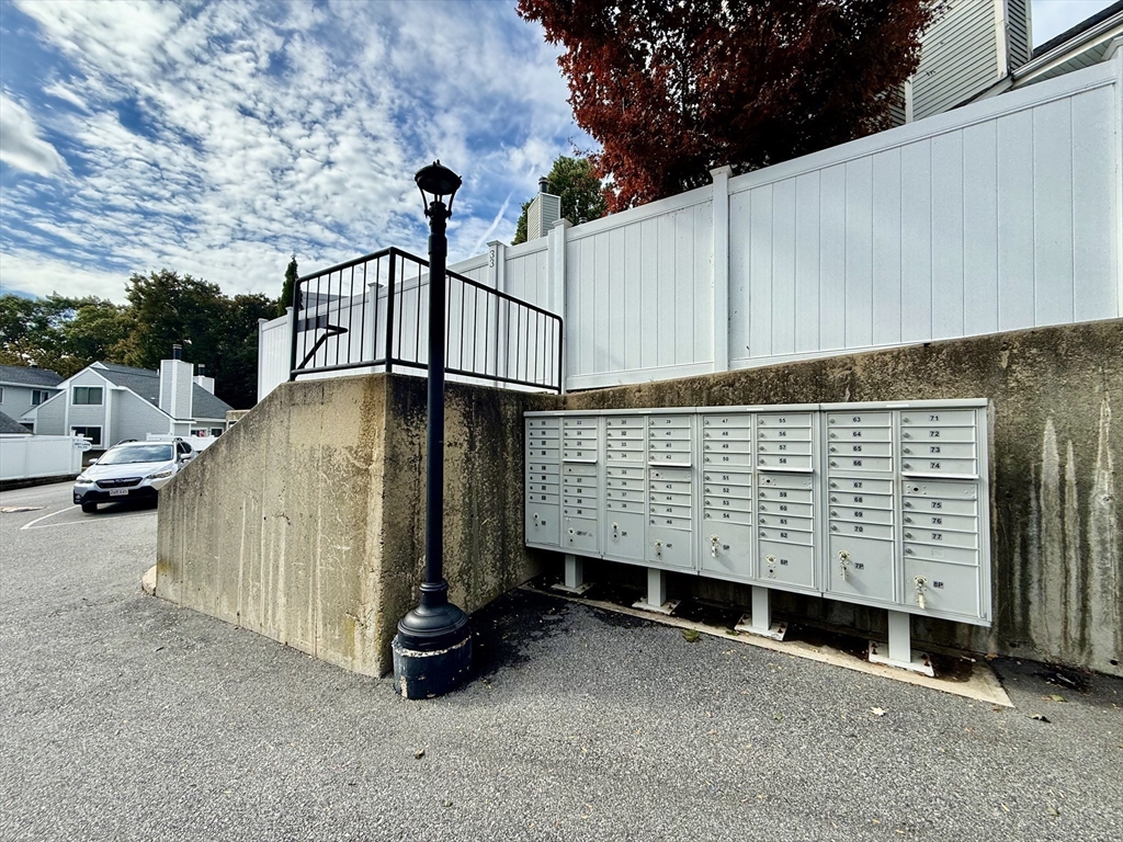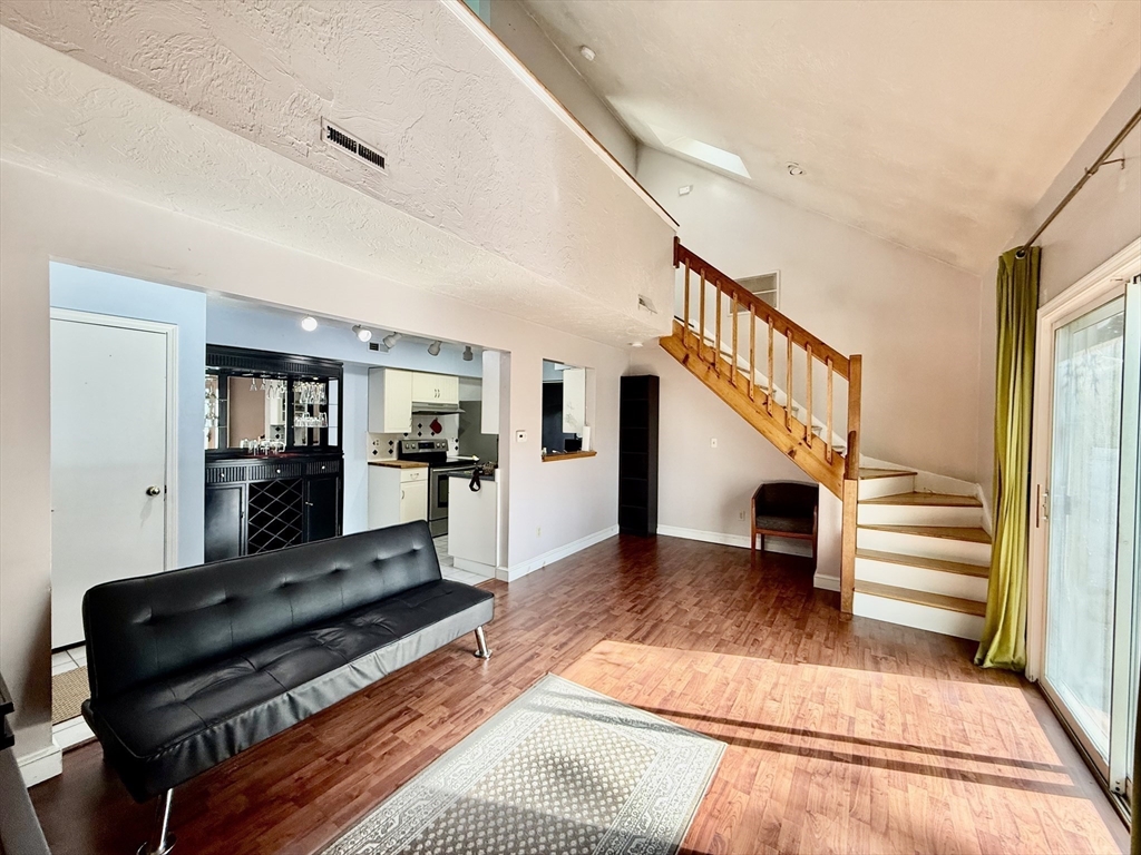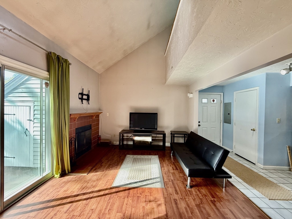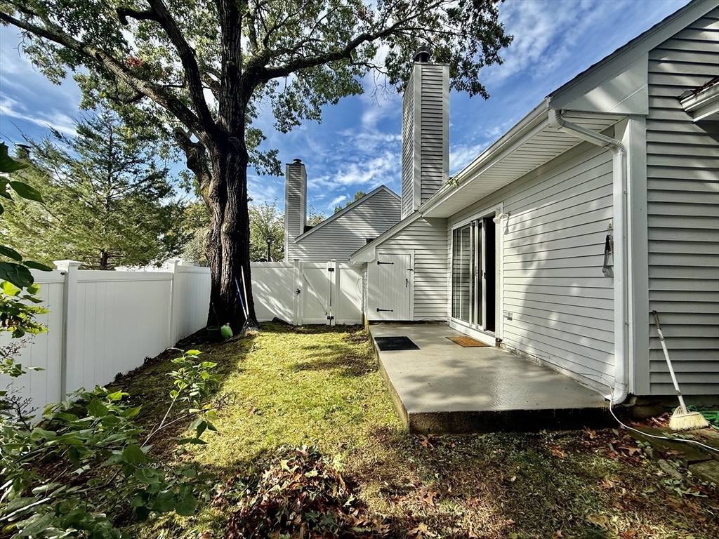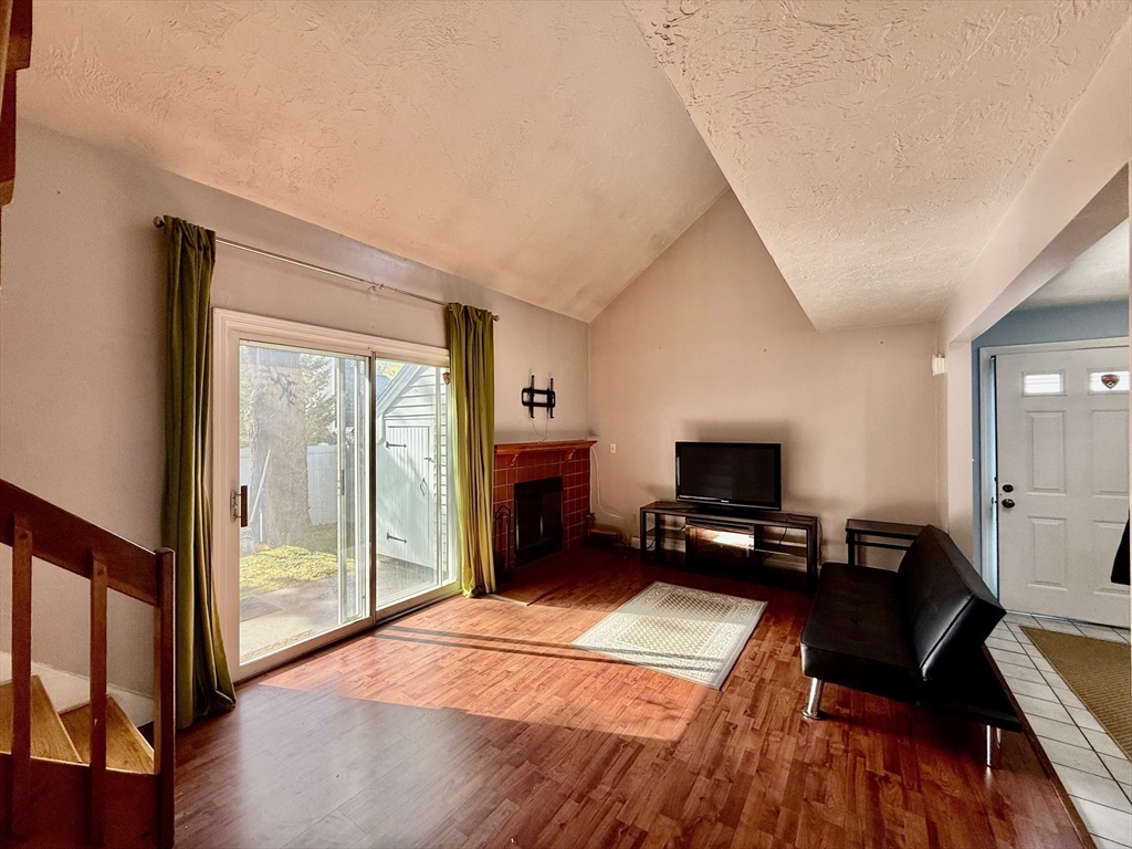 Available Now! Stylish 2BR/1BA loft-style end-unit townhouse in highly desirable Whitman Pond Village, Weymouth! Conveniently located near shopping, restaurants, and the E. Weymouth commuter rail. This bright home offers an open floor plan with vaulted ceilings, a cozy wood-burning fireplace, and sliding doors leading to a private fenced patio. The kitchen features new stainless steel appliances, a breakfast bar, and ample cabinet space. The first-floor bedroom includes double closets, while the loft-style second bedroom has a skylight and ceiling fan. Enjoy the convenience of in-unit laundry, central AC, a walk-in storage shed, and deeded parking (#28). Ideal for couples or young professionals seeking comfort and convenience!
