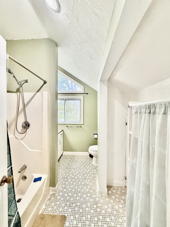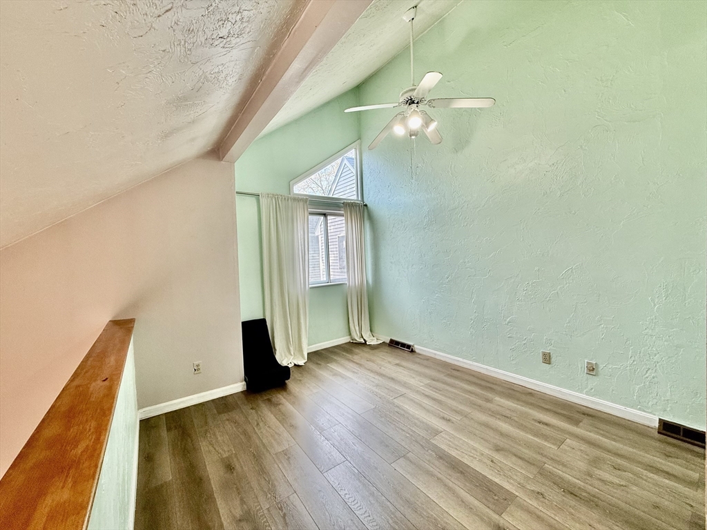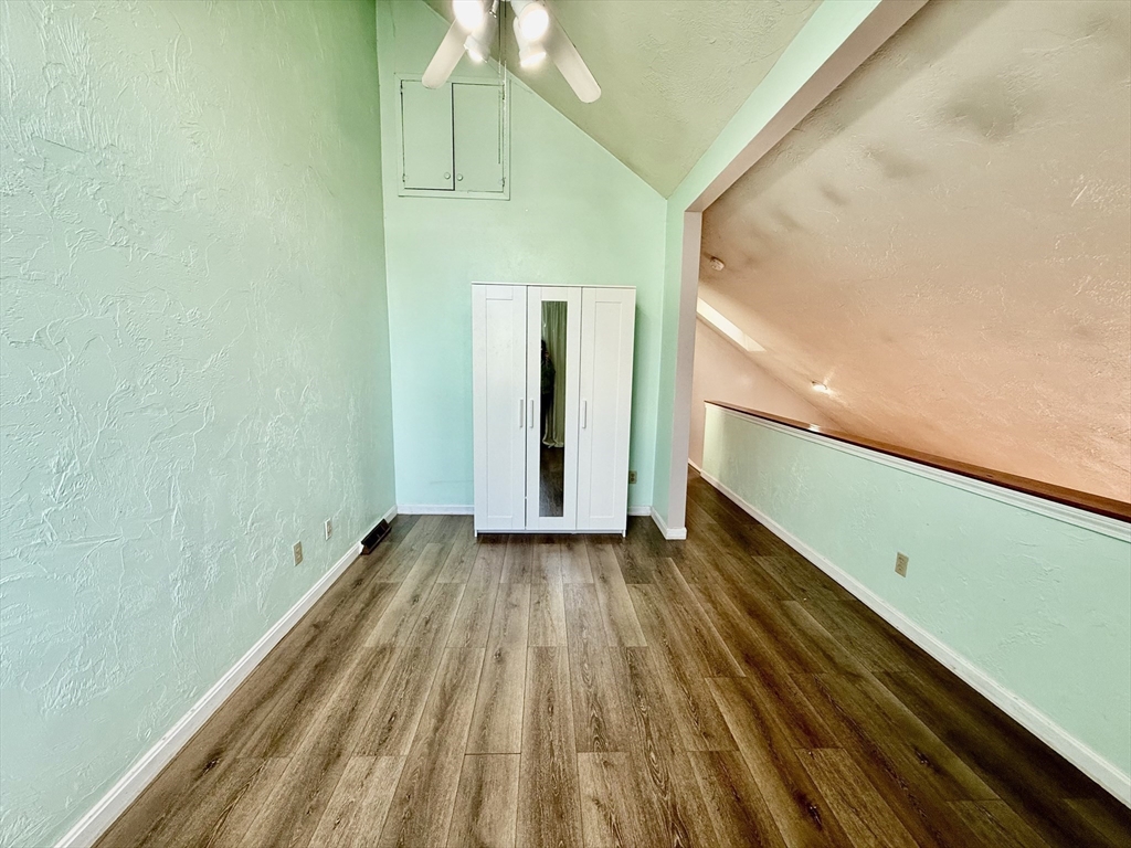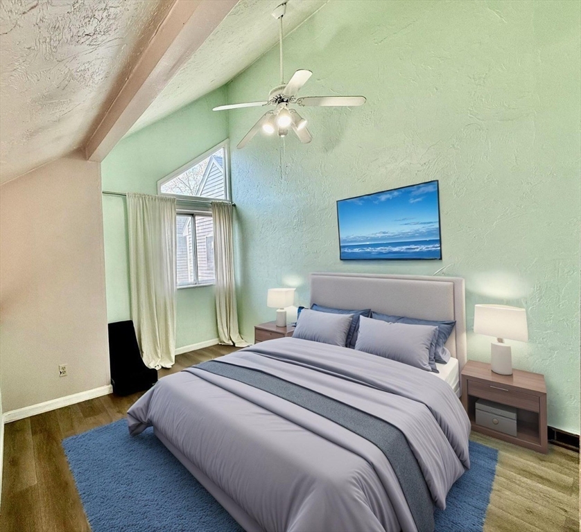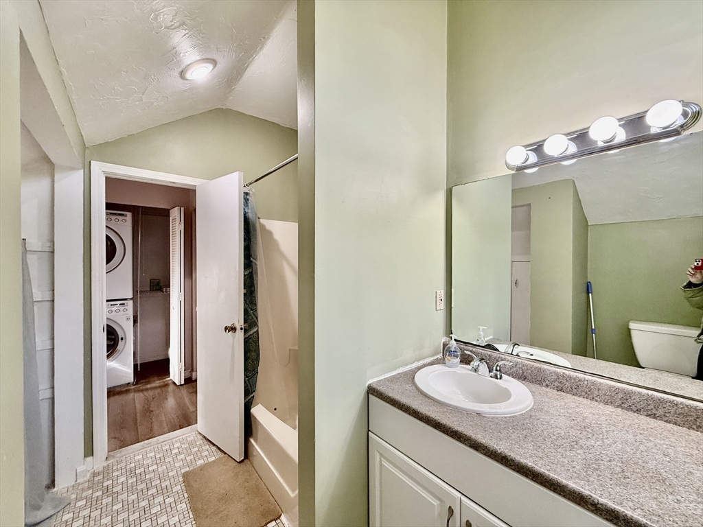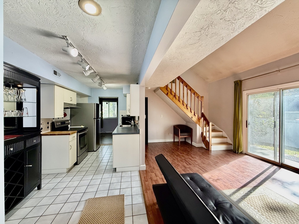 Available Now! Stylish 2BR/1BA loft-style end-unit townhouse in highly desirable Whitman Pond Village, Weymouth! Conveniently located near shopping, restaurants, and the E. Weymouth commuter rail. This bright home offers an open floor plan with vaulted ceilings, a cozy wood-burning fireplace, and sliding doors leading to a private fenced patio. The kitchen features new stainless steel appliances, a breakfast bar, and ample cabinet space. The first-floor bedroom includes double closets, while the loft-style second bedroom has a skylight and ceiling fan. Enjoy the convenience of in-unit laundry, central AC, a walk-in storage shed, and deeded parking (#28). Ideal for couples or young professionals seeking comfort and convenience!