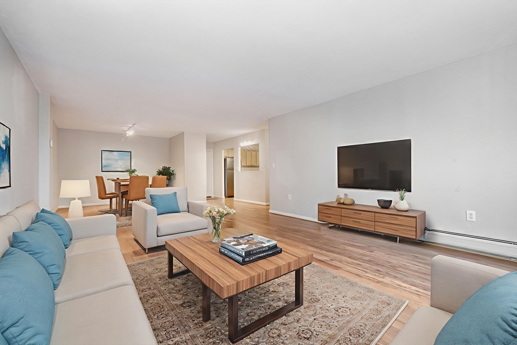 Lovely large 2 Bedroom, 2 bath unit and balcony, 2 Parking spots (includes one garage parking spot). An updated eat-in kitchen with tile flooring. A large living room/dining room area; composite wood flooring throughout, including the bedrooms. Primary bedroom includes a private bath & walk-in closet. The common areas include community room, large outside pool and Patio lounge area. multiple laundry rooms per floor, elevators, landscaped grounds. Great Location close to Cambridge and easy commuting to Boston and area. Charles River greenway bike path and the Arsenal Yards entertainment Development with restaurants, shopping, cinema and as well as gyms in the area.