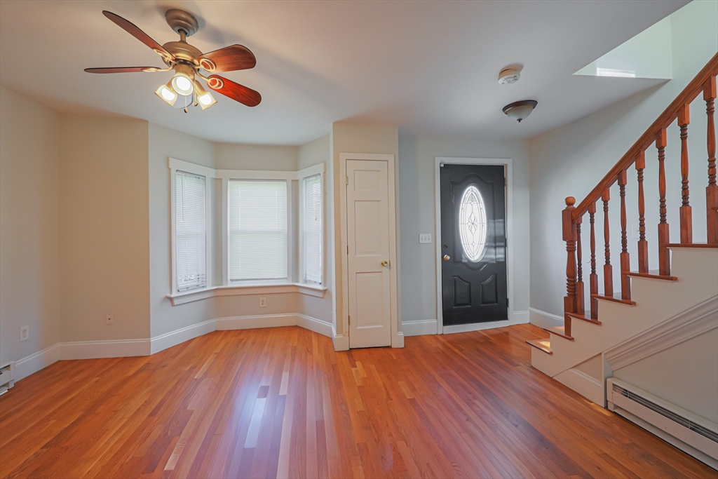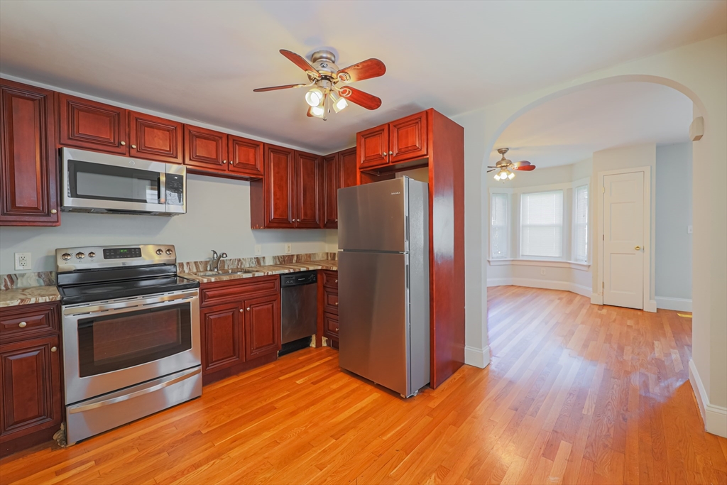 This spacious tri-level single-family home in East Boston offers four bedrooms and two full bathrooms, freshly painted and professionally cleaned throughout. The modern kitchen features stainless steel appliances, granite countertops, and electric cooking. Gleaming hardwood floors extend through the kitchen, living, and dining areas. Enjoy a large private backyard, perfect for gatherings and outdoor entertaining. Conveniently located near three Blue Line train stations—Wood Island (0.8 mi), Airport (0.7 mi), and Maverick (1.1 mi)—providing quick access to downtown Boston and Logan Airport. The property is vacant and move-in ready. Pets are welcome with approval.