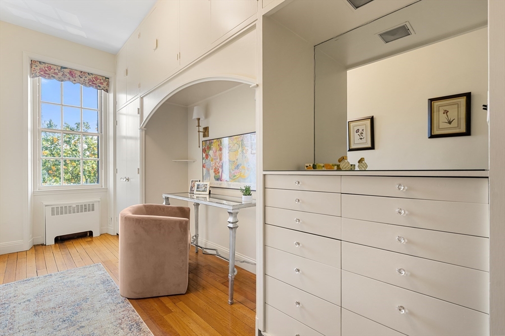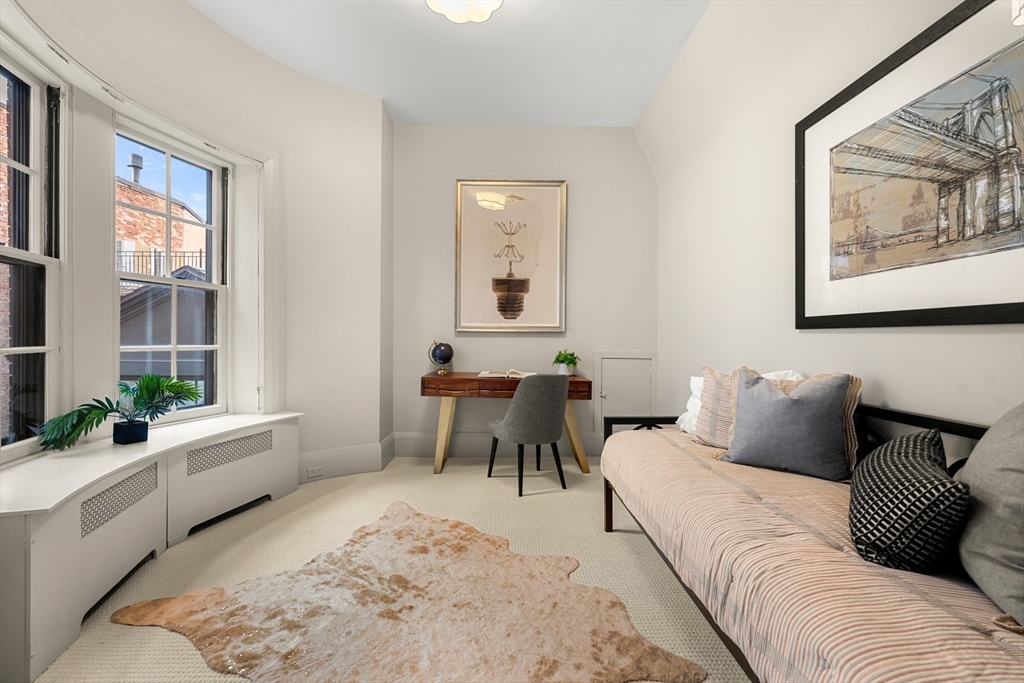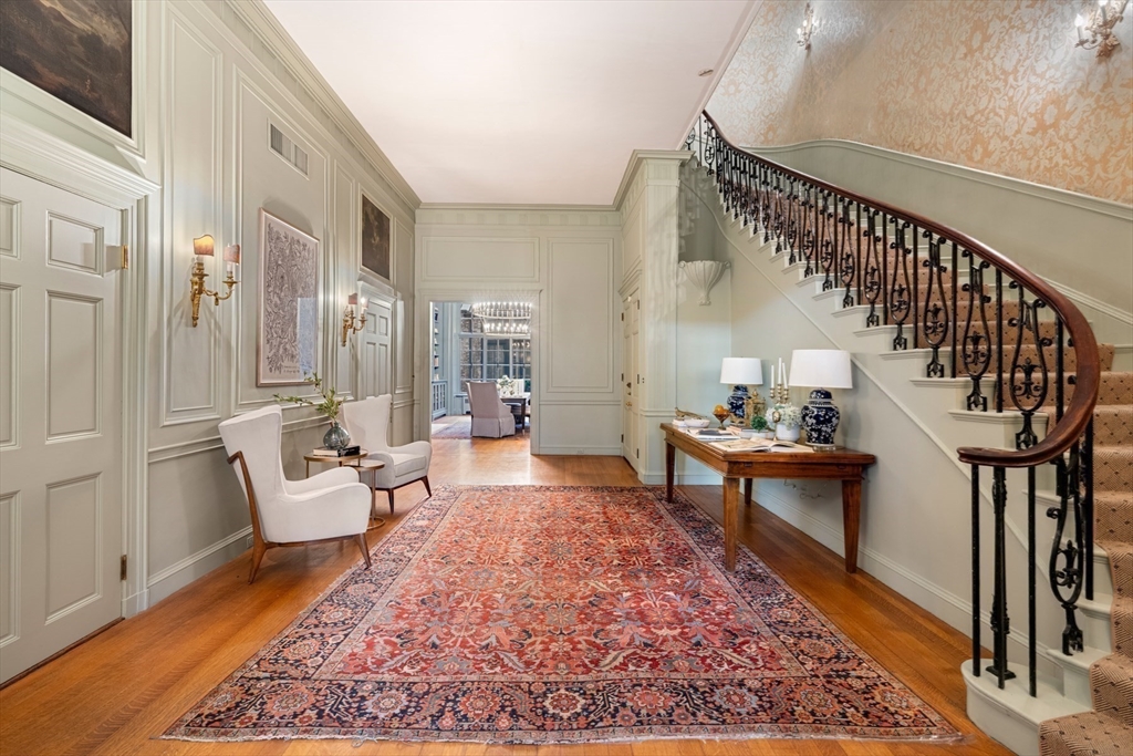 Experience timeless Beacon Hill elegance in this opulent 3+ bedroom duplex overlooking the historic Boston Common. Offering storybook views and greenery, this majestic parlor-level and upper-floor residence features 13-foot ceilings, a dramatic staircase, incredible volume and exceptional, handsome fireplaces. The grand entry foyer is magnificent and leads to a sophisticated, walnut paneled living room with multiple outstanding lead-pained windows, wainscoting and moulding. The dining room is regal with custom cabinetry, this space is truly memorable for entertaining. A large eat-in kitchen is situated nearby. The sun-drenched primary suite features a bow window and more outstanding views and abundant storage. Two addt’l bedrooms, plus a third study, offer flexible living. Additional highlights include direct elevator access & private storage, and a common gym & shared courtyard. This home embodies historic grandeur and sophisticated city living, all at a truly iconic Boston location.