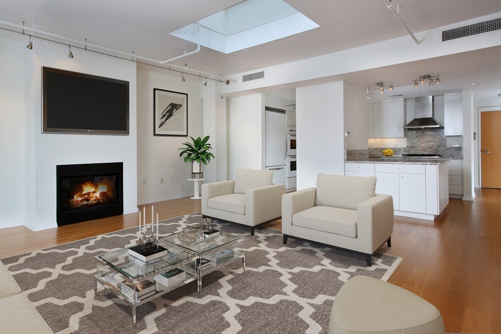 South-facing Penthouse 2bed/2bath is available mid-December, 2025. An ideal floor plan featuring Gas Fireplace, Garage Parking, and private outdoor spaces with extensive views of the Boston Skyline, Canal Waterway and Blue Hills. Living and dining area offer floor-to-ceiling windows, Skylight, Private balcony and sweeping views. Spacious kitchen is equipped with high-end Viking appliances, custom cabinetry, granite counters, and center island. Over-sized master suite offers walk-in closet, floor-to-ceiling glass w/additional views and en-suite bath. Second bedroom w/additional balcony, more views and updated guest bath. (1) Assigned garage parking, private storage, central air, recessed lighting, and full size washer/dryer. 25 Channel Center is a professionally managed with 24/7 concierge, multiple elevators, and pet-friendly. An ideal location between Seaport and South Boston, next to all major transportation points, as well as luxury dining, shopping, and cultural attractions.