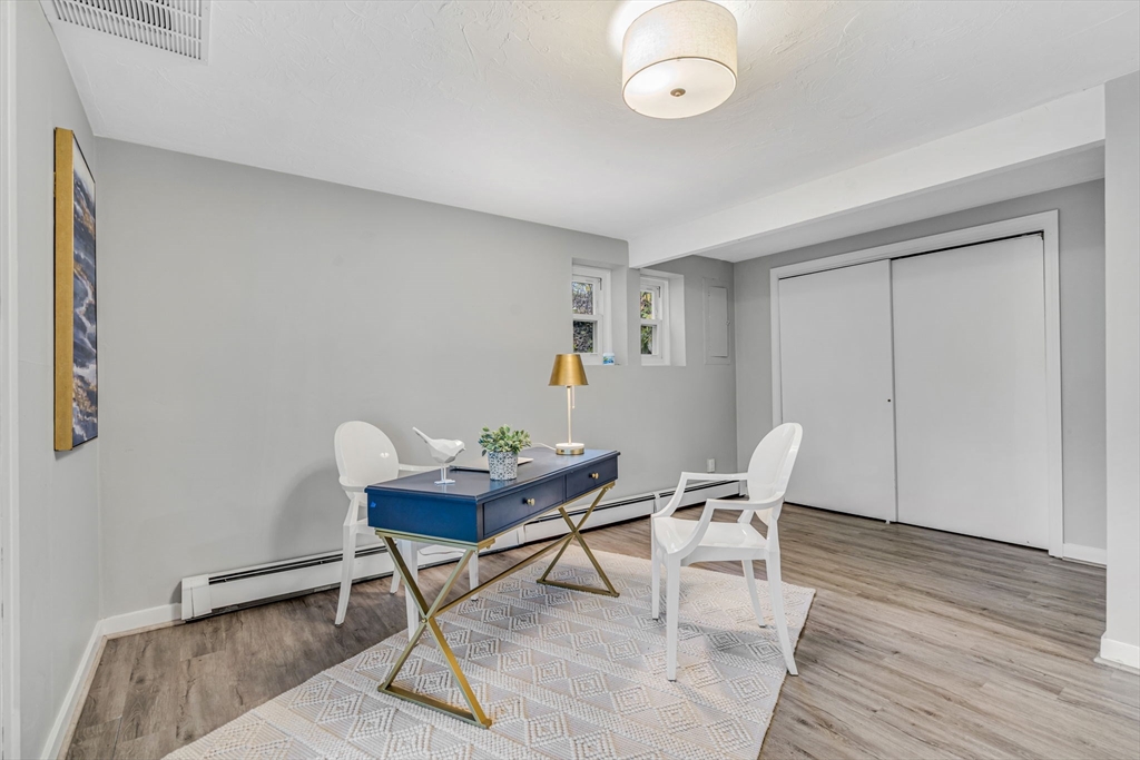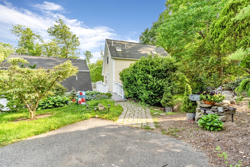 HOUSE IS MOVE-IN READY with an updated heating system, insulation & siding. The exposed brick chimney & wooden beams add to the charm of this sun-filled home. The galley style kitchen overlooks the dining room & living room with wood burning stove to warm the cool nights ahead. Glass sliding doors to the expansive, updated deck ensure you will enjoy the autumn foliage of the expansive wooded lot while listening to the babbling stream below. Upstairs you will retreat to the en suite lofted bedroom. The lower level offers a walk-out bonus room that can be used as a home office or guest space with a full bath plus a storage closet with stackable washer & dryer. Conveniently located to all that the bustling communities of West Acton, West Concord and Maynard have to offer! Enjoy easy commuting from this adorable home in a peaceful setting. Don't miss your opportunity to make 2 Clover Hill your home for the holidays!