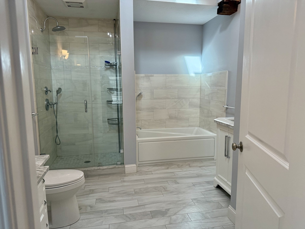 Spacious and Beautifully Renovated Duplex! This stunning home has been completed with well planned details and layout, throughout. Much elegance is expressed in the large foyer that introduces you to the open-concept living and dining space, both with decorative FP. The beautiful, huge kitchen features custom cabinetry, large center island, pendant lighting, granite countertops, stainless steel appliances, w/breakfast area. The second level offers a spacious primary bedroom with cathedral ceiling, two generous closets, and a beautiful ensuite bath with sky light. Two additional bedrooms, with beamed vaulted ceilings Unit is sun filled and has been meticulously maintained. Additional highlights include in-unit laundry in the basement, two-car parking, and a prime location near Route 1, shopping, restaurants, Rail Trail and many other amenities.