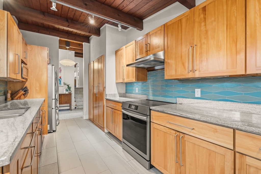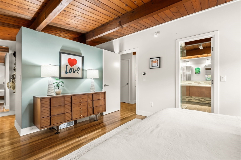 Stunning Mid-Century Modern Deck House set on over an acre in Hingham’s coveted Rockwood neighborhood. This architecturally distinctive home features vaulted wood-beamed ceilings, floor-to-ceiling stone fireplace, and a striking wall of windows overlooking a private deck and lush gardens. The gourmet Faneuil custom kitchen offers high-end appliances, induction cooktop and eat-in dining space opening to a window encompassed 3-season sunroom. The upper level includes a primary suite with an oversized closet and a spa-like bath featuring radiant floors, a soaking tub, and a newly updated walk-in shower. A versatile sitting room and office provide options for a workspace, playroom, or guest room. The lower level offers two add'l bedrooms, a full bath with radiant floors, an oversized laundry room, and access to the two-car garage. Recent updates include a new roof and AC (2021). Ideally located just minutes from Hingham Center, the harbor, downtown, library, and East School.
