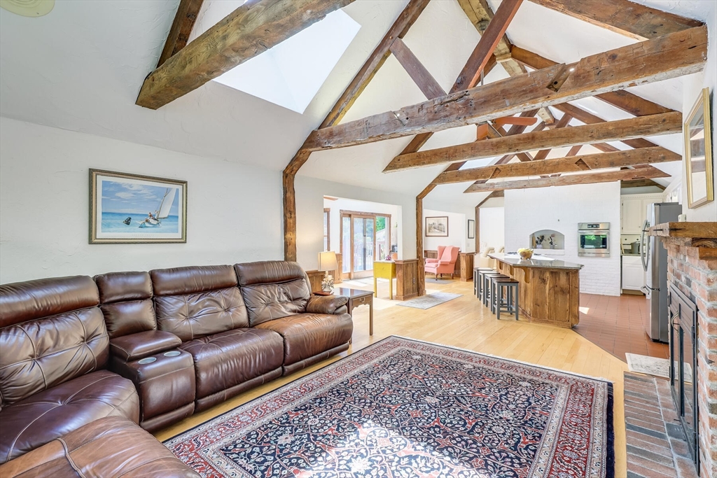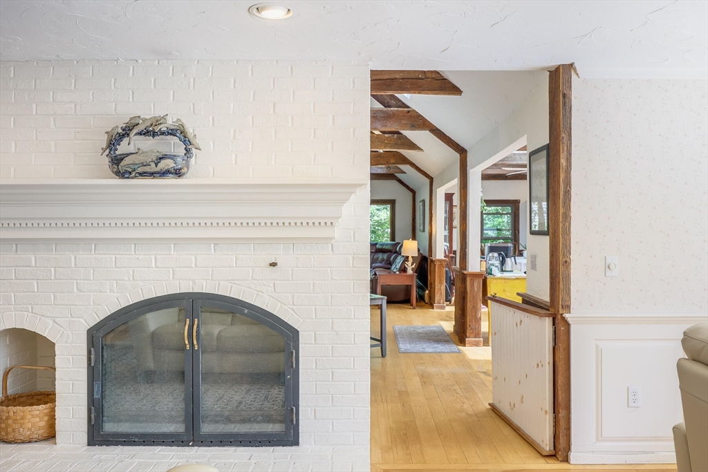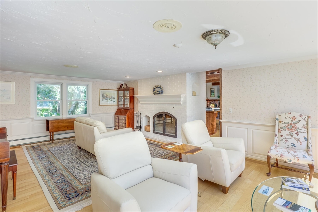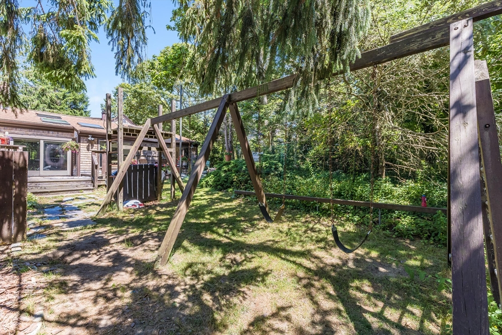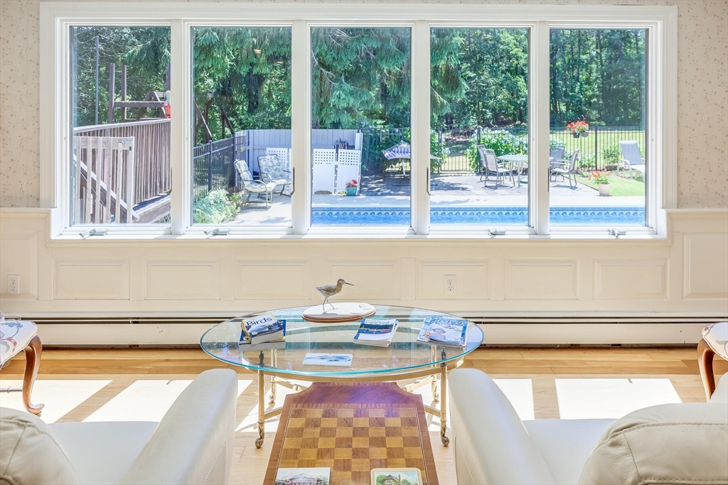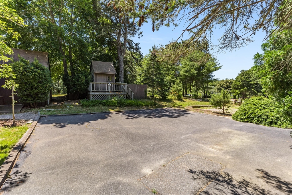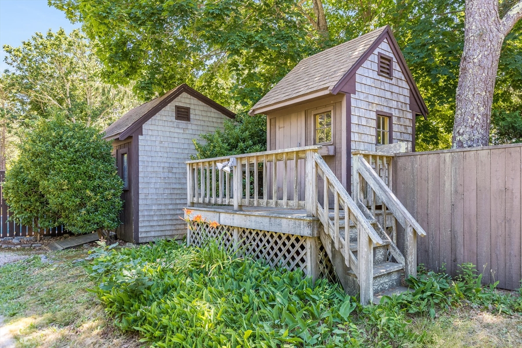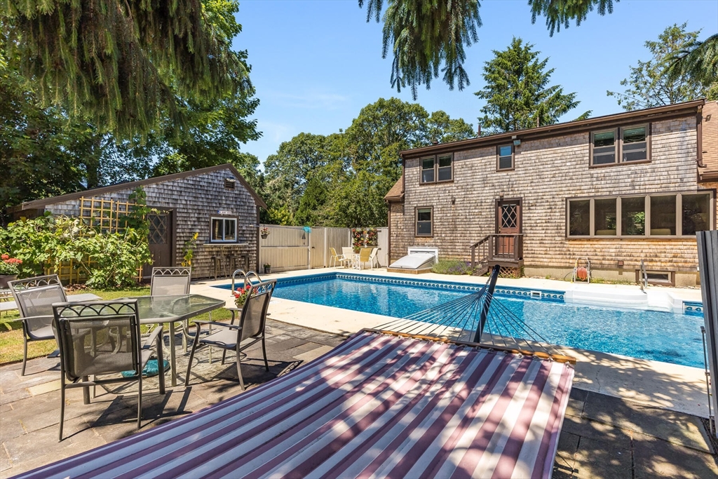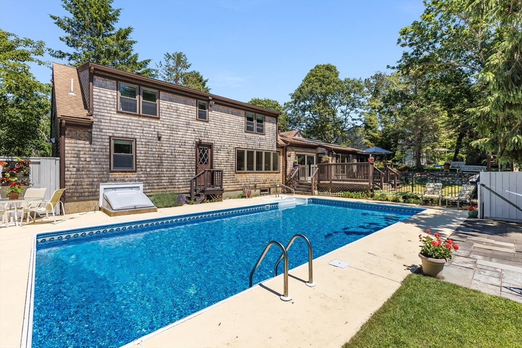 Discover this exceptional five-bedroom, six-full-bath residence perfectly situated on a large corner lot at the beginning of a desirable private neighborhood. Encompassing nearly an acre of lush plantings, mature trees, and beautifully landscaped gardens, this property offers privacy and comfort. Step inside to a thoughtfully designed floor plan featuring a first-floor primary suite, dedicated home office, and an inviting family room with a wood-burning fireplace and cathedral ceilings with an open-concept kitchen ideal for entertaining. Enjoy the best of indoor-outdoor living with a large salt water pool, expansive stone patio, and beautiful grounds, complete with a pool house and potting shed. Further amenities include an attached two-car garage, ample parking, finished lower level with a workshop, home gym, and abundant storage space. Multiple updates include a new heating system, roof, decking, shingles and trim. Located moments from downtown Harwich Port and Bank Street Beach.