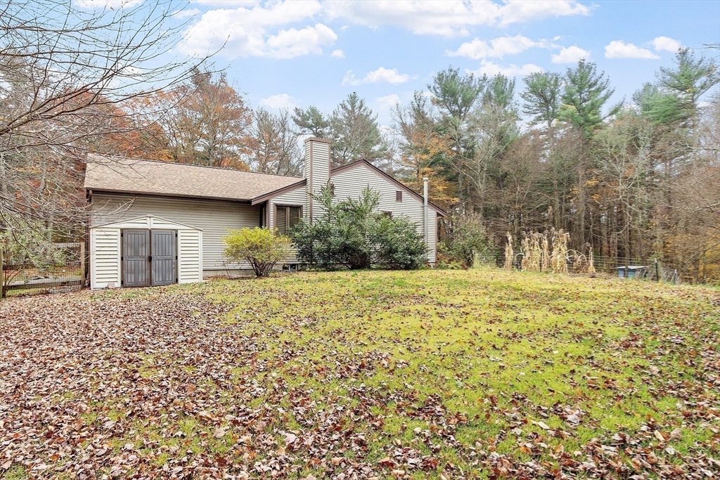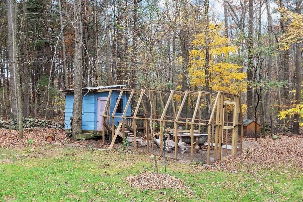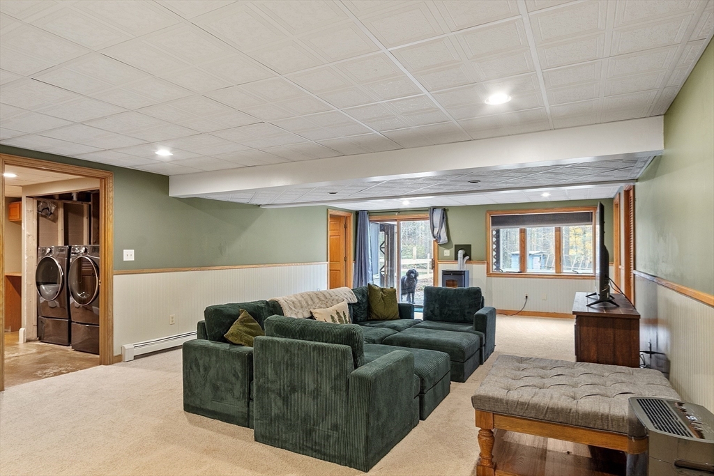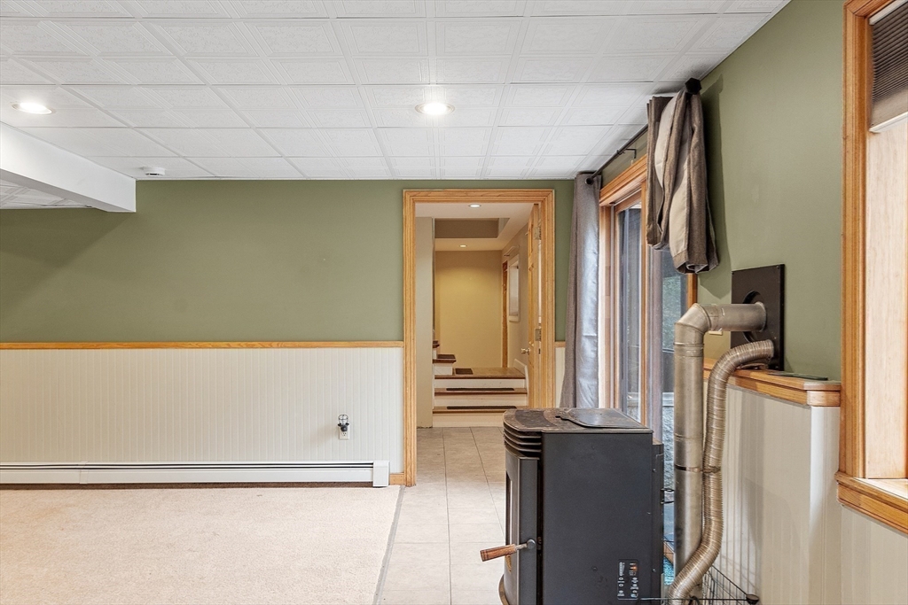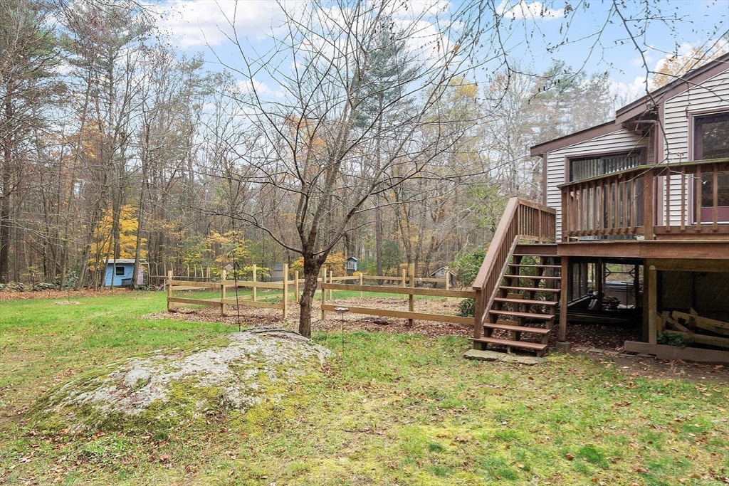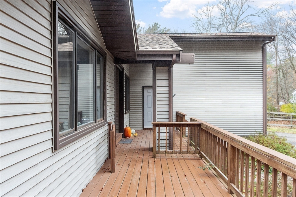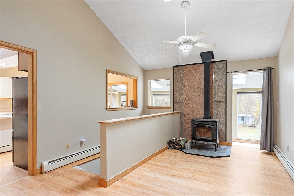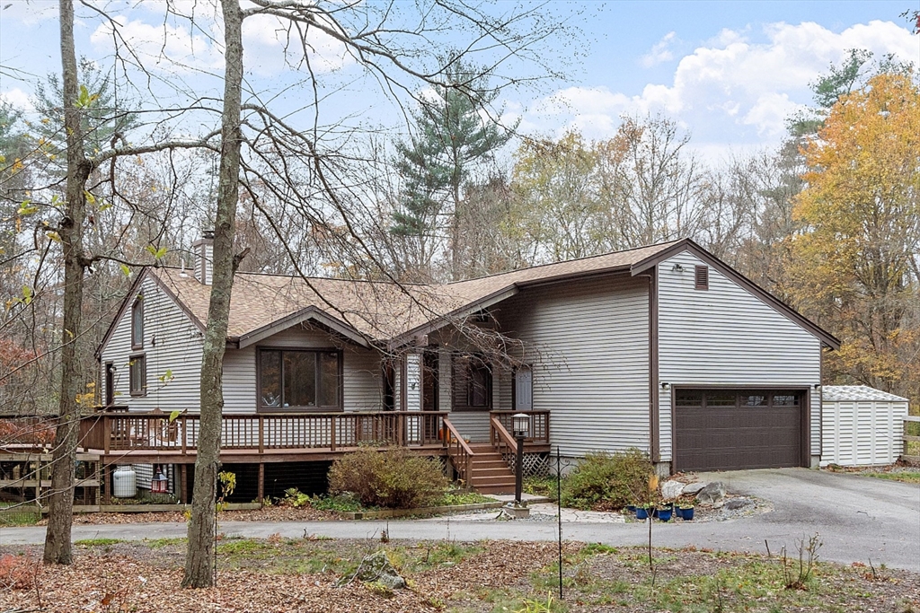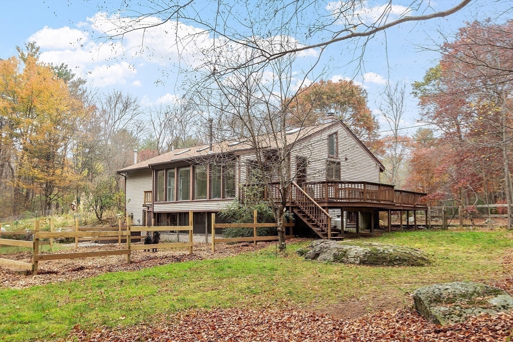 Discover this contemporary ranch set on 6.7 wooded acres with a circular drive, wraparound deck, and oversized garage. Inside, a flexible layout offers a cozy den or dining area with a wood stove and a bright living room with a bow window and fireplace overlooking the front yard.The large eat-in kitchen is the heart of the home, highlighted by solar skylights and direct access to a stunning sunroom that stretches across the back of the house, with views of the expansive backyard with groomed trails. The primary suite includes a full bath, solar skylights, and a balcony, with two additional bedrooms and another full bath on the same level. The partially finished walkout basement features a pellet stove, full bath, and a flexible space that can be used as a play room or office, plus plenty of storage. Enjoy the large fenced area for gardening, small livestock, or outdoor play embracing privacy, nature, and endless possibilities.