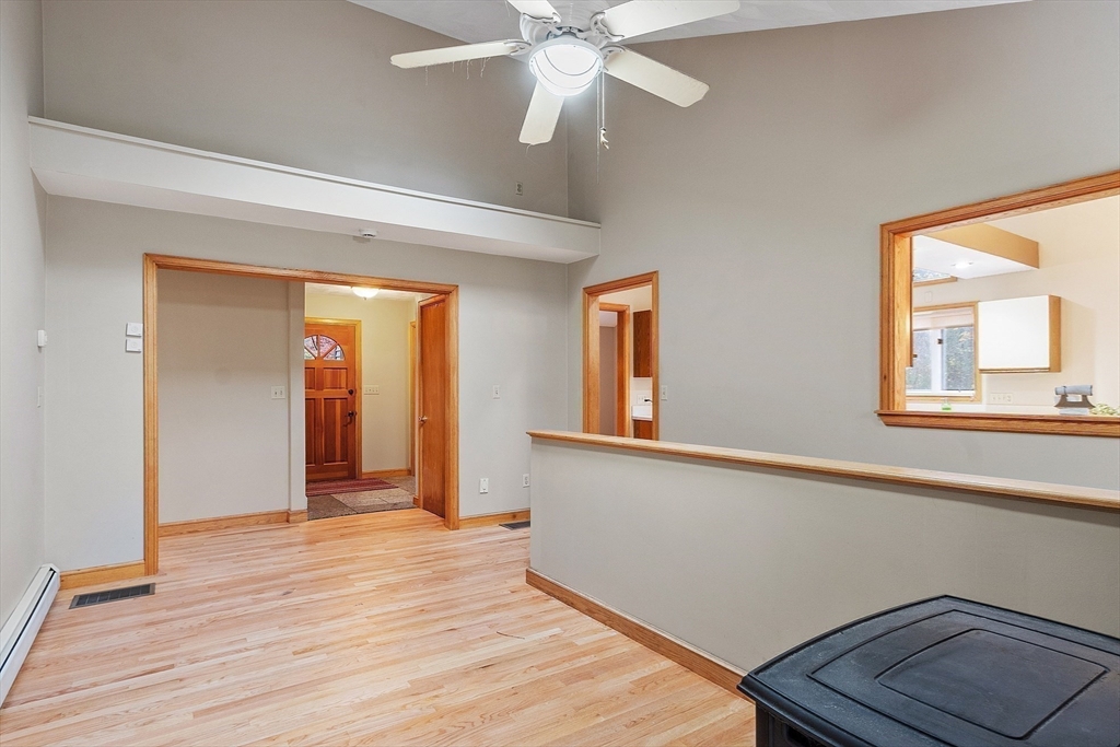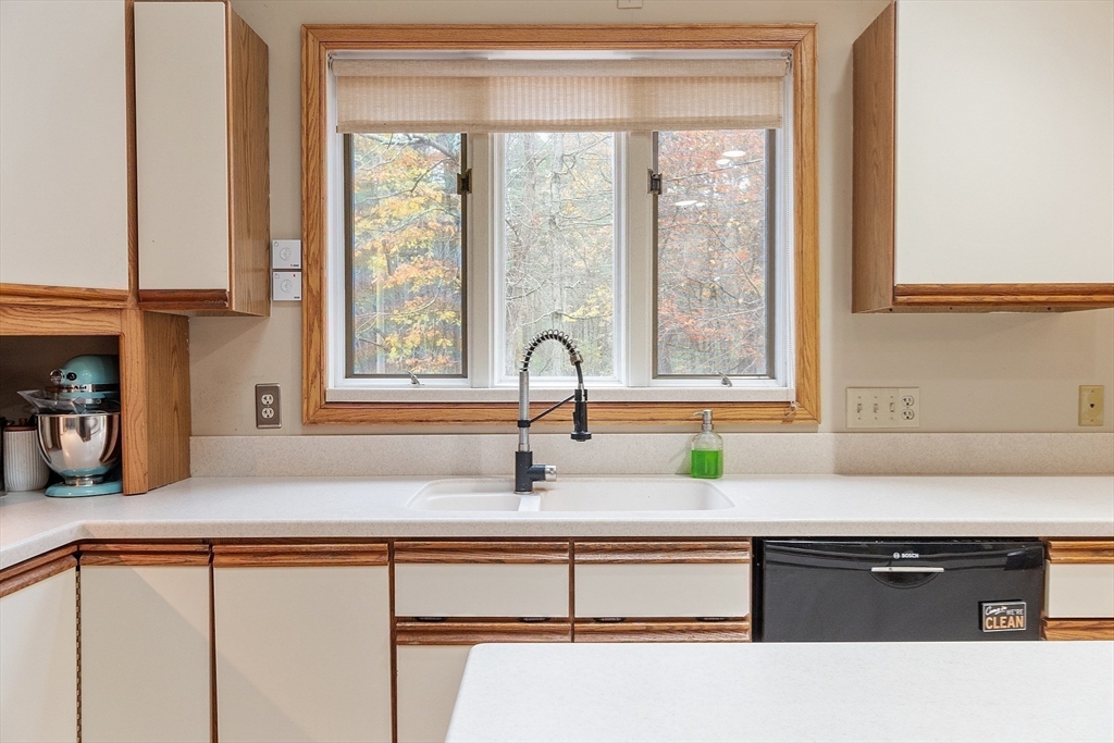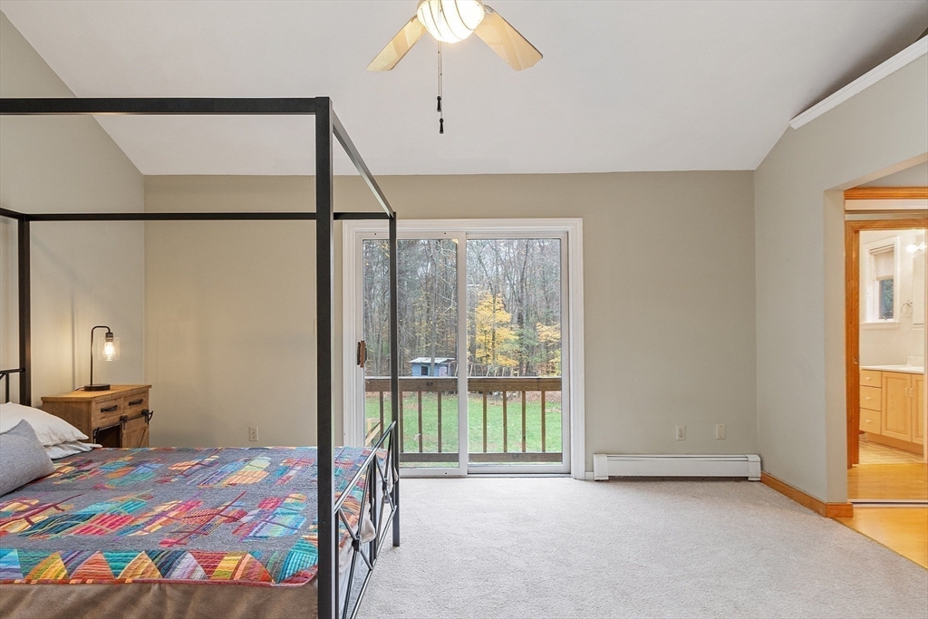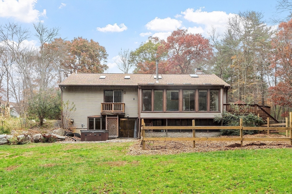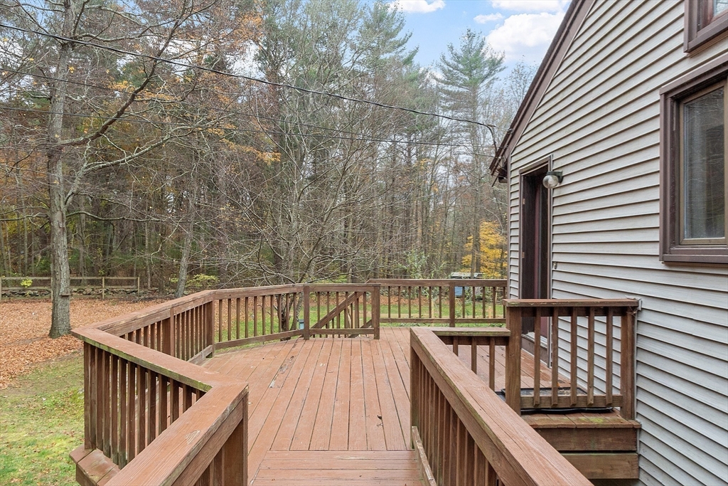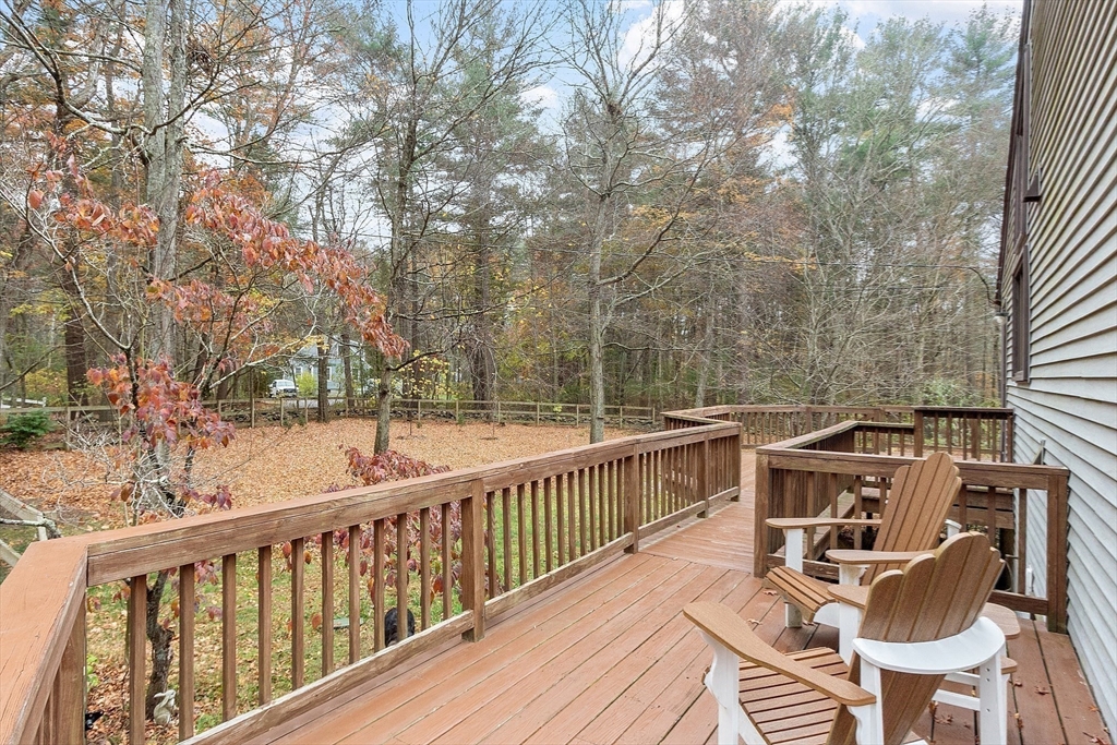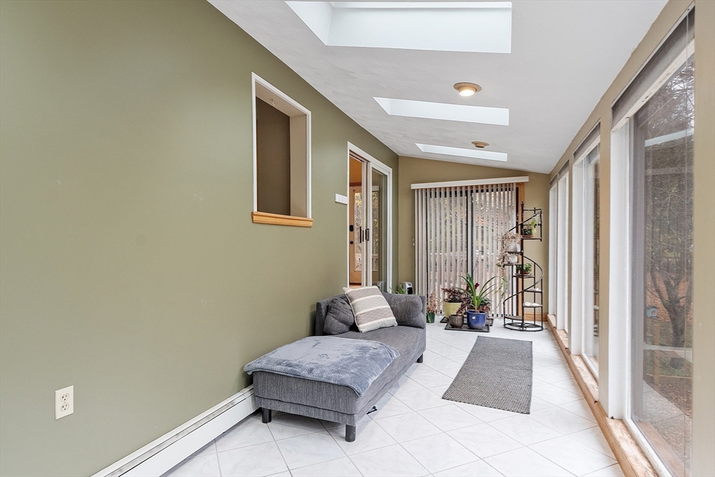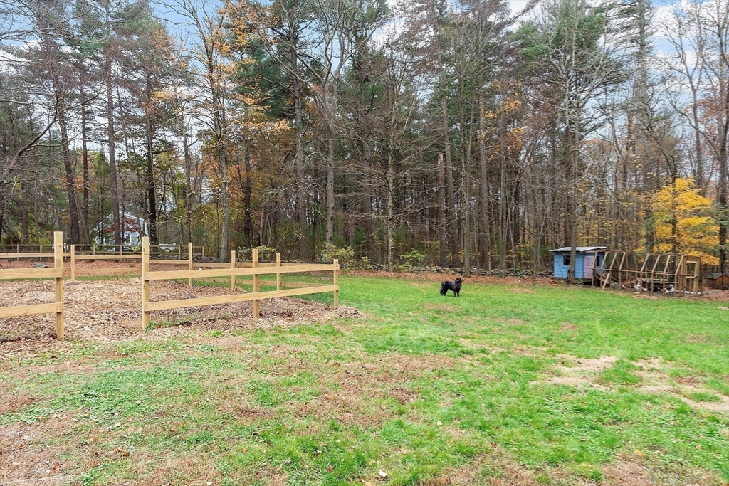 Discover this contemporary ranch set on 6.7 wooded acres with a circular drive, wraparound deck, and oversized garage. Inside, a flexible layout offers a cozy den or dining area with a wood stove and a bright living room with a bow window and fireplace overlooking the front yard.The large eat-in kitchen is the heart of the home, highlighted by solar skylights and direct access to a stunning sunroom that stretches across the back of the house, with views of the expansive backyard with groomed trails. The primary suite includes a full bath, solar skylights, and a balcony, with two additional bedrooms and another full bath on the same level. The partially finished walkout basement features a pellet stove, full bath, and a flexible space that can be used as a play room or office, plus plenty of storage. Enjoy the large fenced area for gardening, small livestock, or outdoor play embracing privacy, nature, and endless possibilities.
